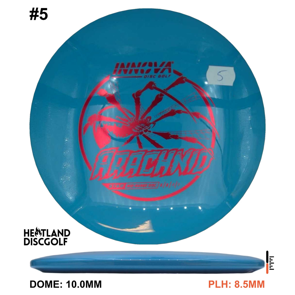 The [5|6|-1|1] Innova Arachnid has a manageable [5] speed and high [6] glide that can be easily powered up to get soaring down the line, with a helpful [-1] turn that allows for extended hold when you need a tricky turn-over. The Arachnid’s subtle turn is complemented by a mellow [1] fade, keeping the disc from becoming flippy and helping it to hook up for a gentle, forward-pushing finish.