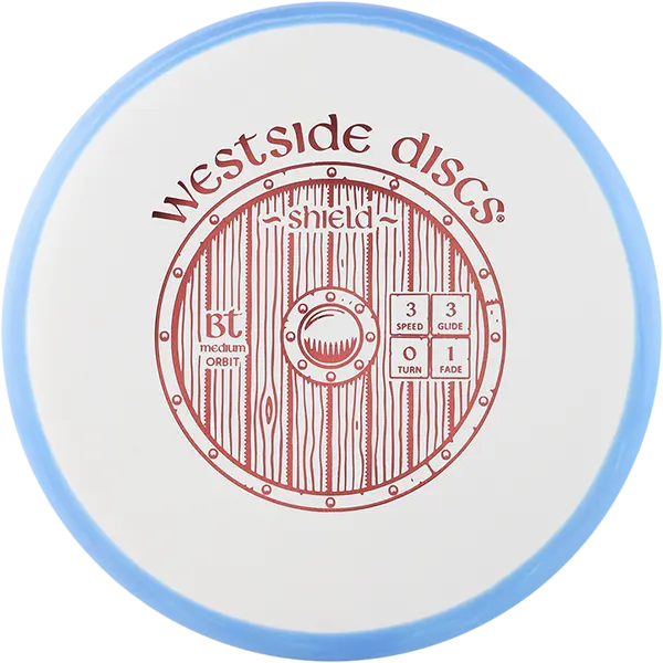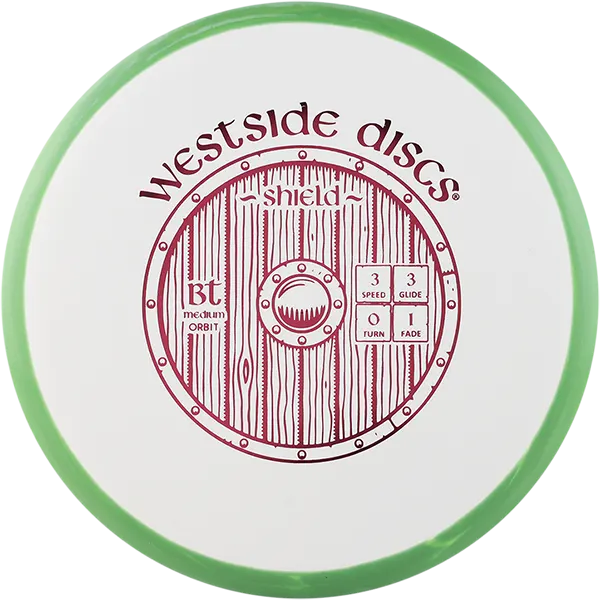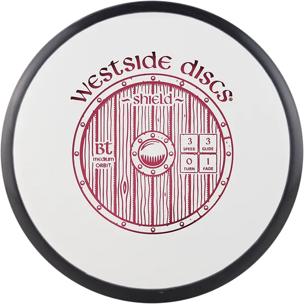 Our newest putter on the market the Shield is the next step up from the Swan. Designed with a tacky grip in the BT plastics, the Shield is a little thicker and has a small bead on the rim. It holds a stable line when throwing as an approach and a straight line into the chains while putting. Westside Shield is a PDGA approved disc.