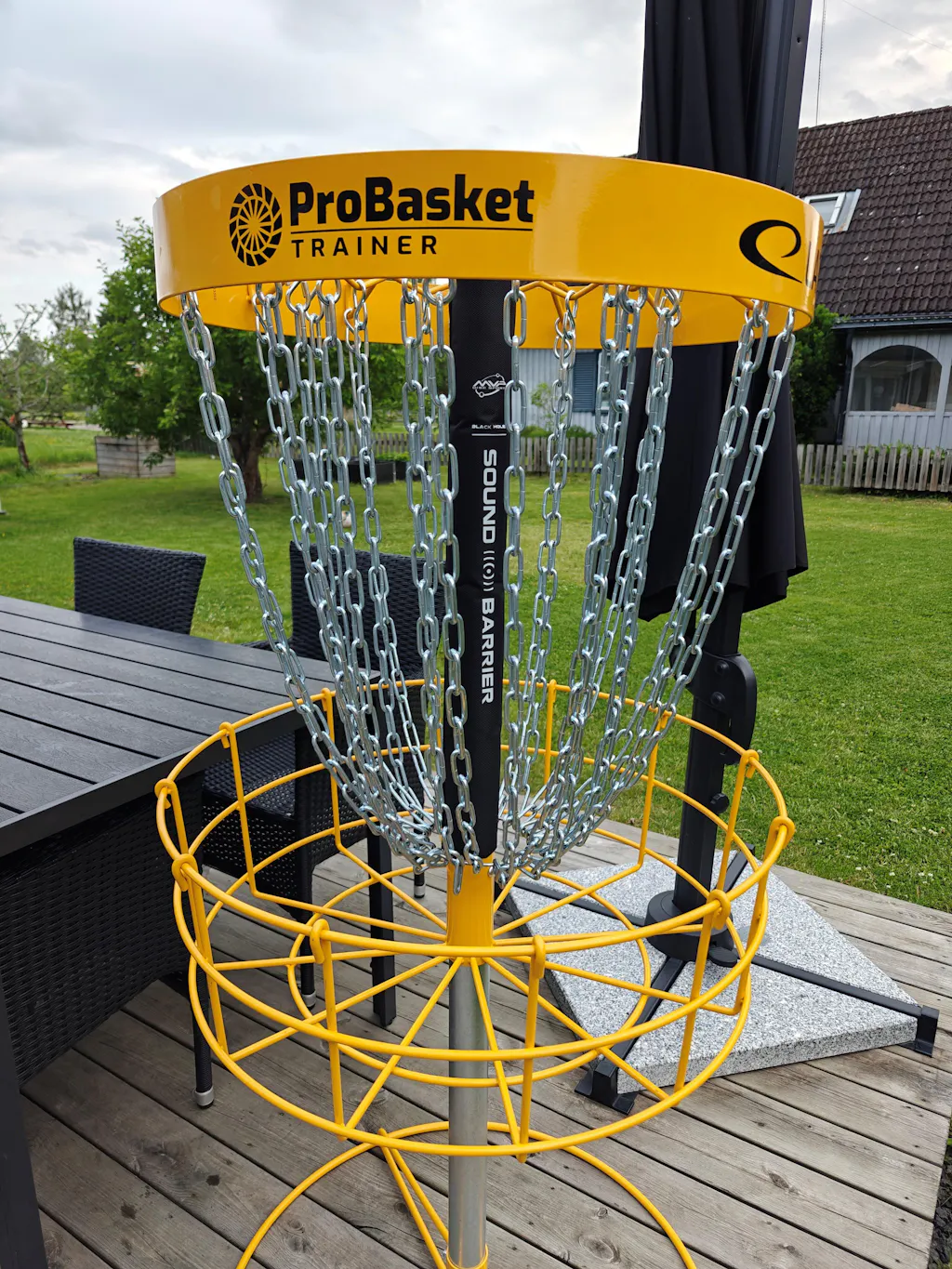 ProBasket Trainer is a solid quality basket for home use that is easily assembled. Unlike many low priced baskets this has the look and feel of a tournament basket making practice feel like the real deal. It can also be used for temporary courses, where the built in base wheel makes it easy to move. It is PDGA approved for events up to B-tiers.