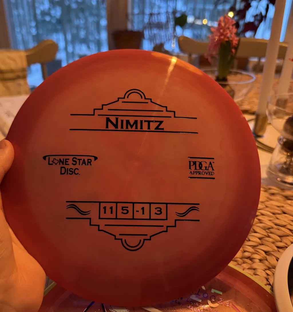 Named after the Fredericksburg native Chester Nimitz, the Nimitz is a disc that fits perfectly between the Curl and Warbird. This Distance Driver has controllable turn with reliable fade at the end of it's flight.