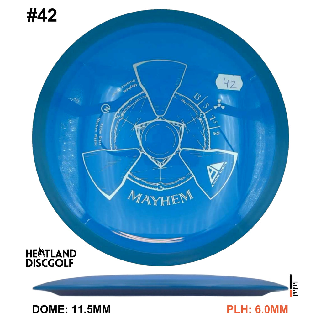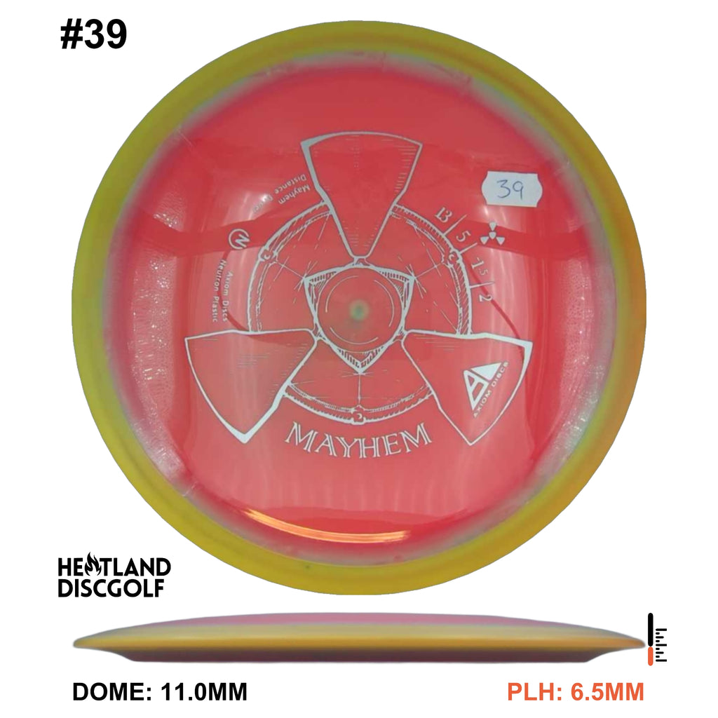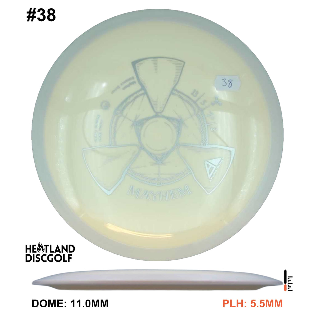 Mayhem has a responsive straight-stable profile and plenty of speed, making it a perfect workhorse driver for many advanced and expert throwers. Like the MVP 23mm class, the Mayhem has a pronounced dome to promote distance-covering glide. Mayhem is best compared to a beat MVP Octane.