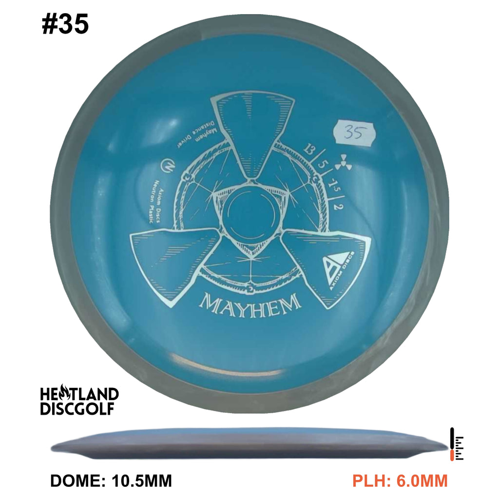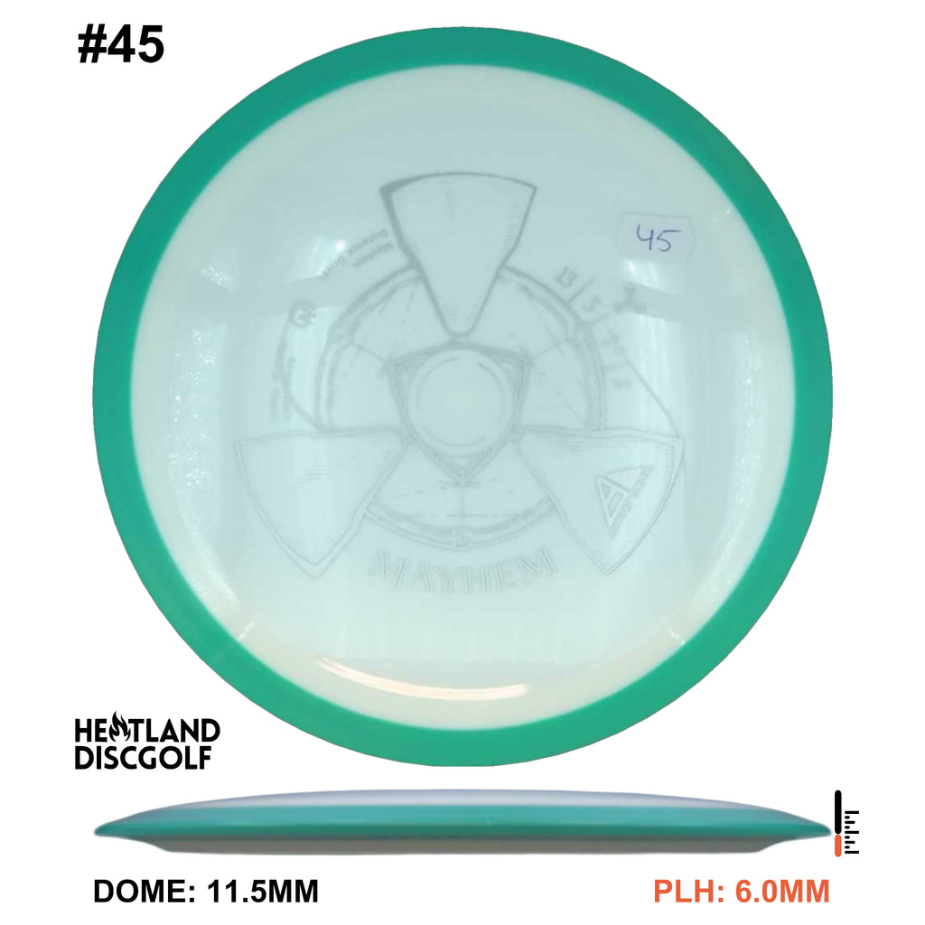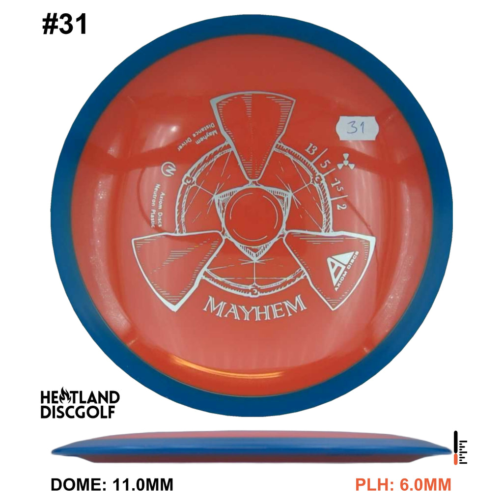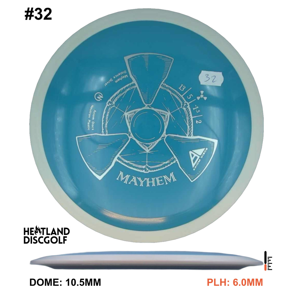 Mayhem has a responsive straight-stable profile and plenty of speed, making it a perfect workhorse driver for many advanced and expert throwers. Like the MVP 23mm class, the Mayhem has a pronounced dome to promote distance-covering glide. Mayhem is best compared to a beat MVP Octane.