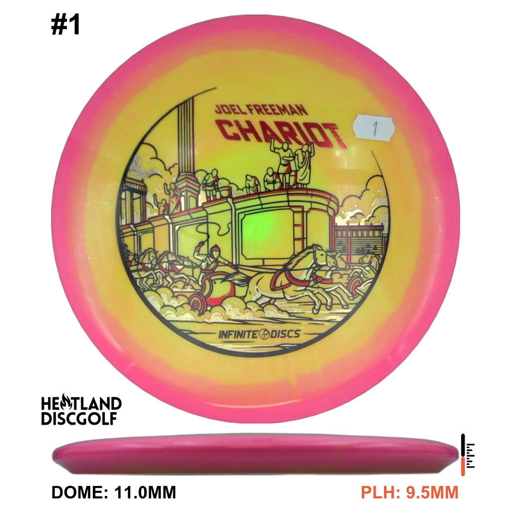 The Infinite Discs Chariot is a stable midrange with fantastic glide and straight flight. A true workhorse for every type of player that will hold whatever line you put it on and finish with just a touch of fade. Hyzer, straight and anhyzers, the Chariot will get you there every time.