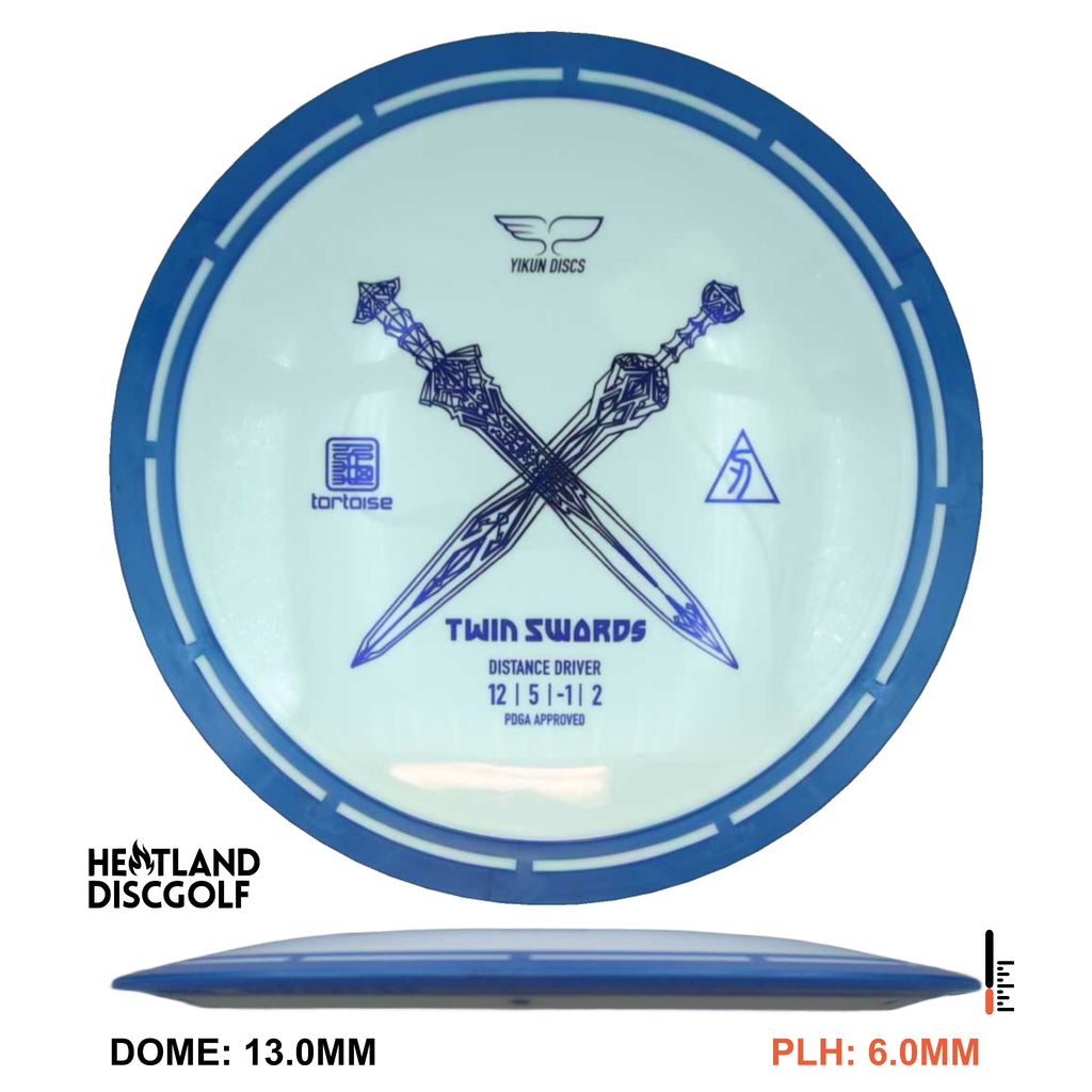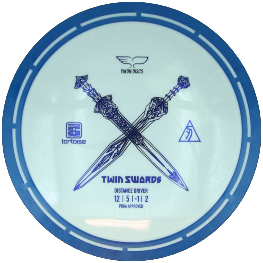 The Twin Swords is a distance driver in Yikun’s lineup. It is the first model they rolled out in their Tortoise Line / SHELL overmold construction, which means the rim and flight plate are made with different plastic blends, using a two‑part overmold process. This gives the disc enhanced durability, grip, and stability.
