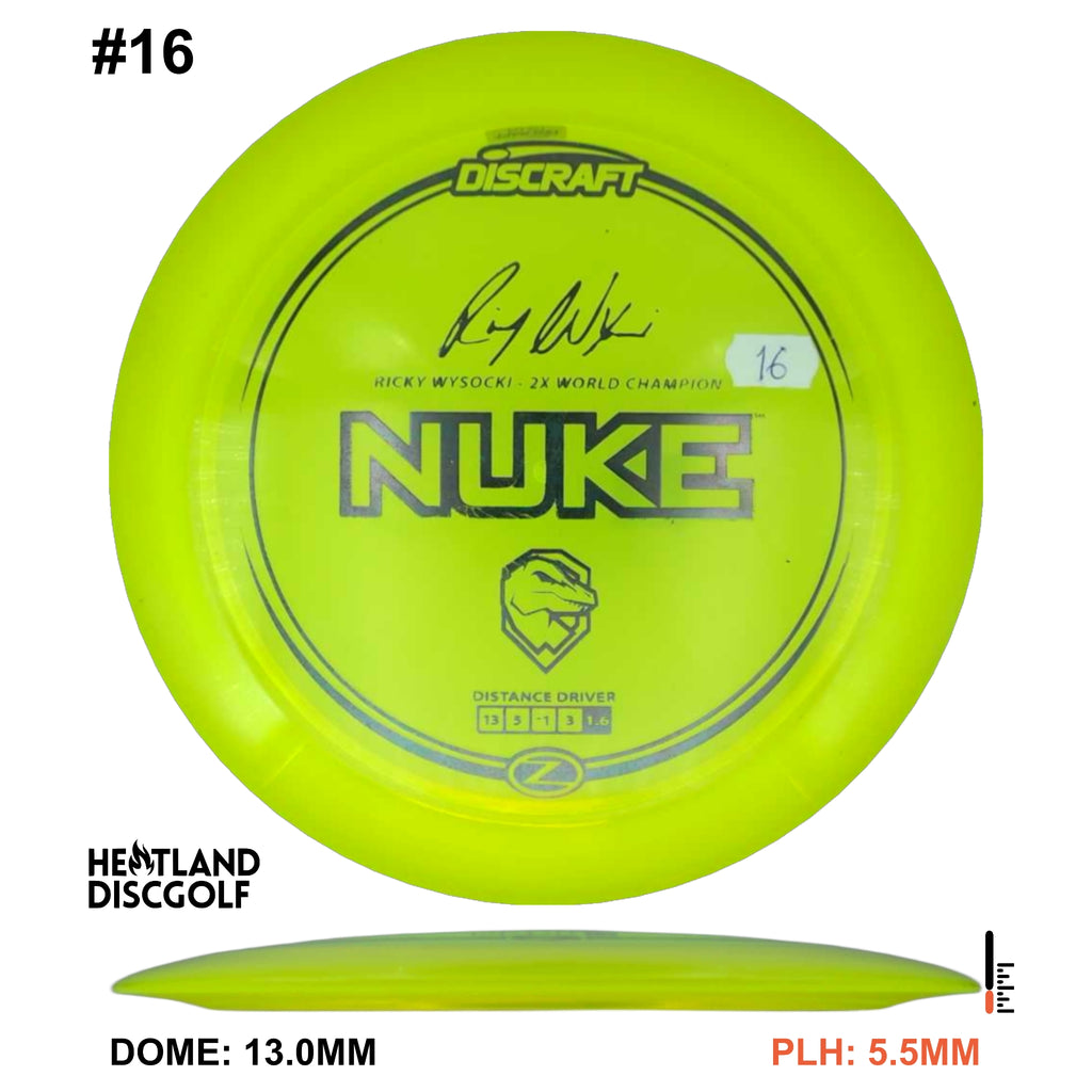 To honor Ricky Wysocki’s legacy as a two-time PDGA World Champion, Discraft proudly adds the Z Nuke to Ricky Wysocki’s signature series discs. One of the most popular high-speed drivers in the game, the Nuke offers massive glide, a wide rim, and straight-to-overstable flight at high power. Perfect for long bombs and confident finishes, this Z blend Nuke delivers consistent flight with the Wysocki seal of approval.