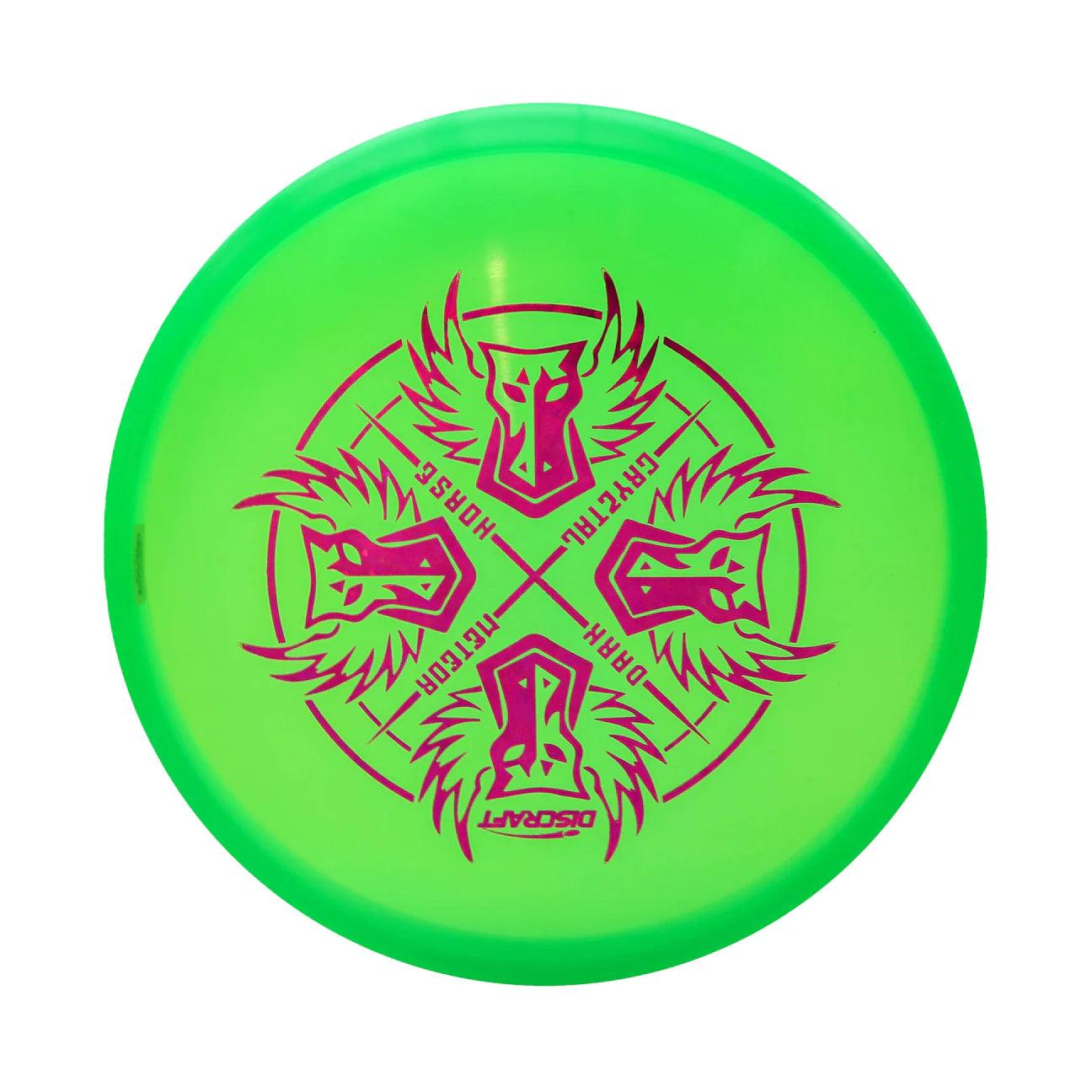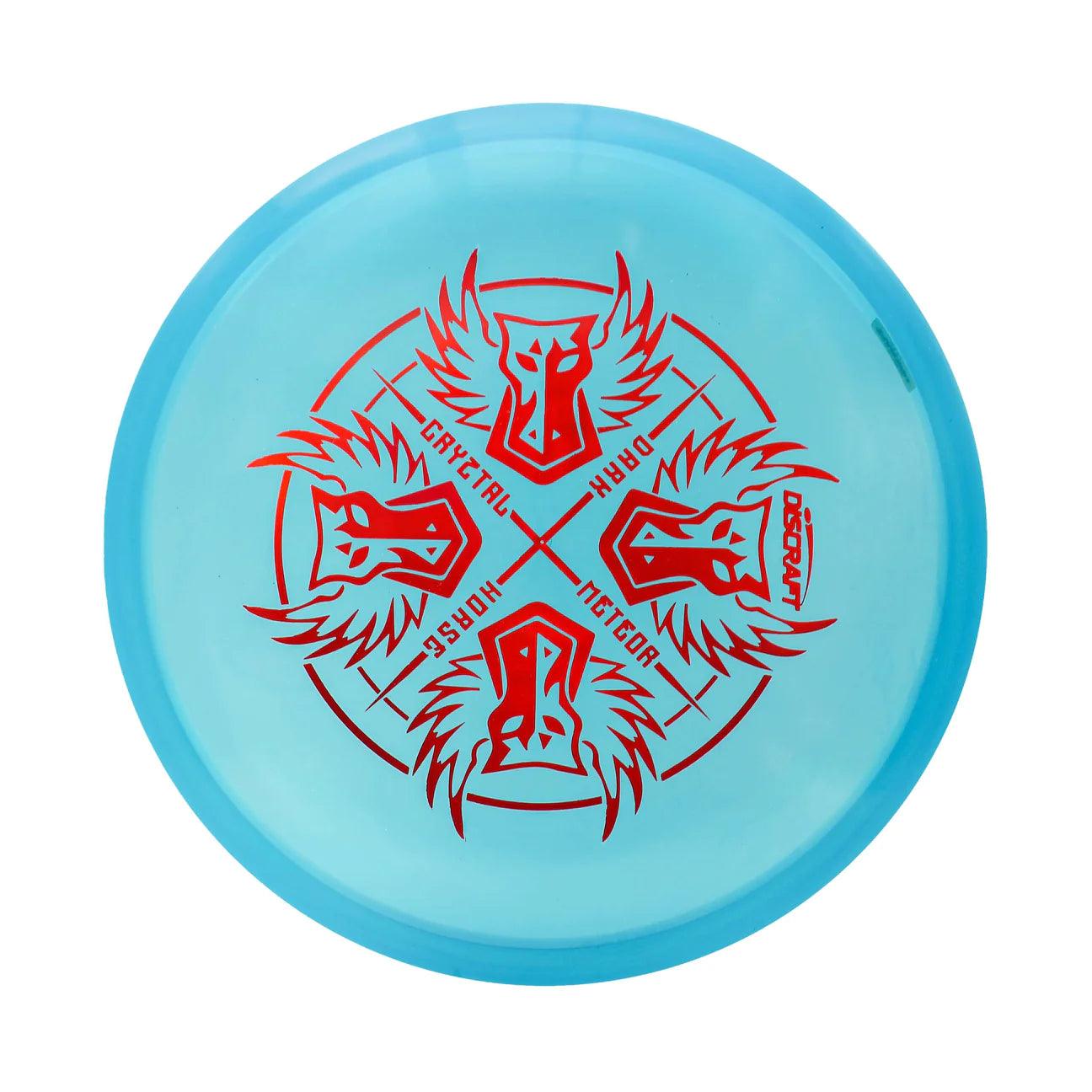 The Meteor is an understable midrange designed for glide and effortless straight flights. In CryZtal blend, the Meteor will break in slowly, making it an easy turning midrange for technical control shots with the durability for a long life of consistent flight. This is a limited run release of the Darkhorse 4-horsemen CryZtal Meteors with the quad stamp. This release includes green and blue for the disc colors.