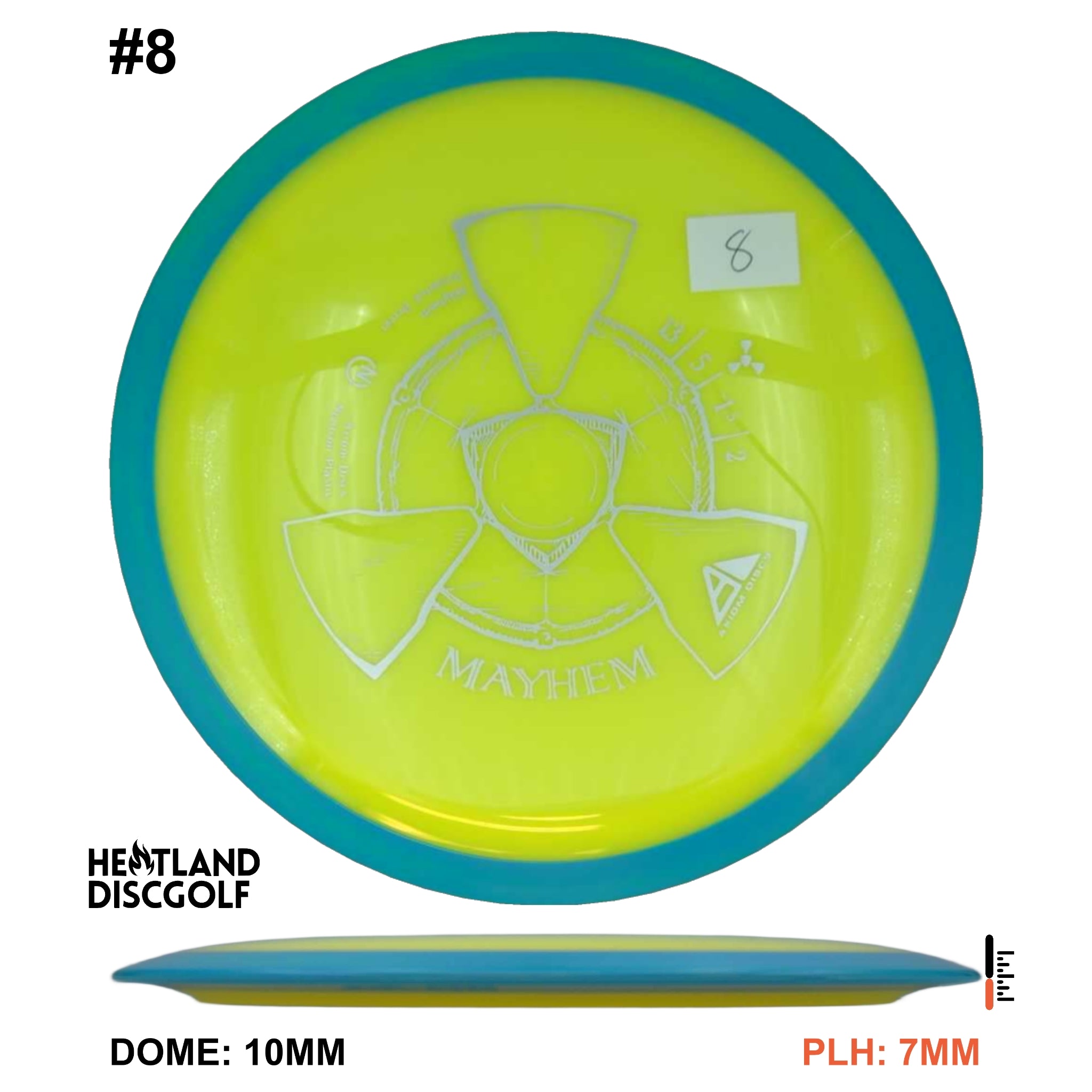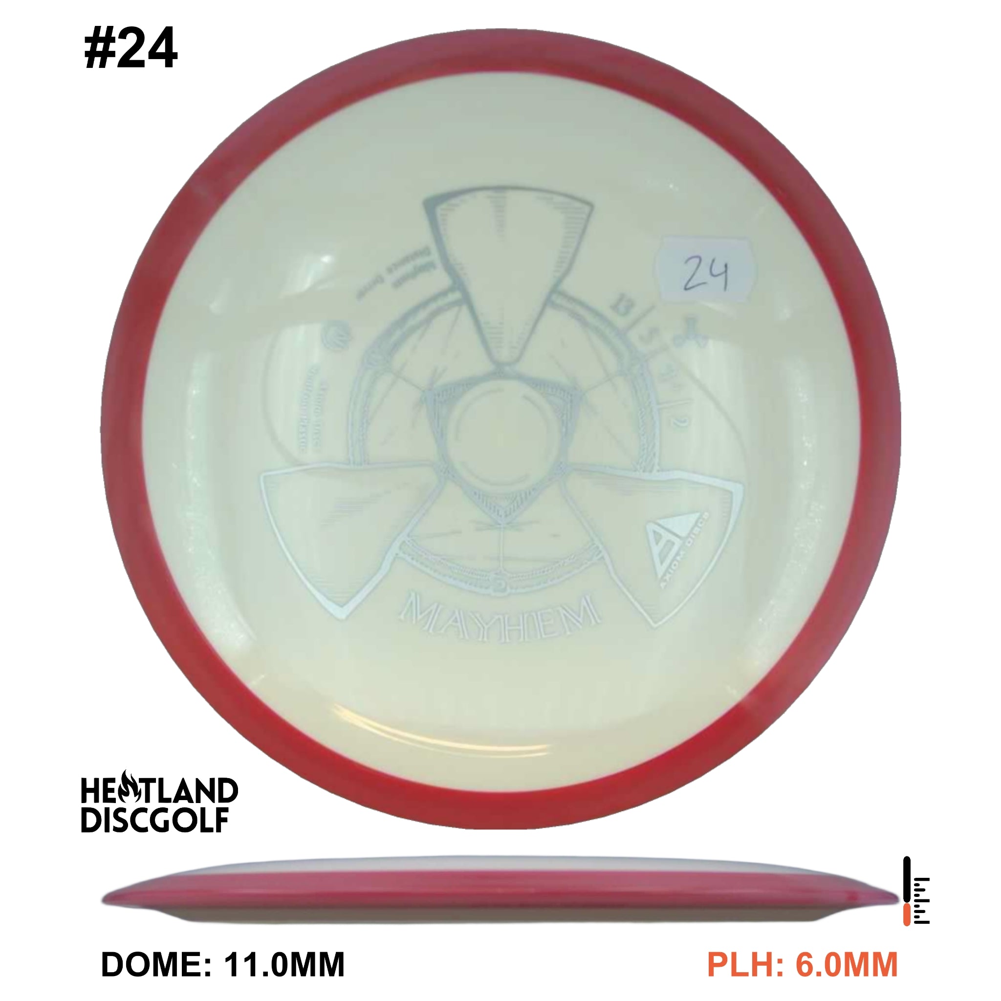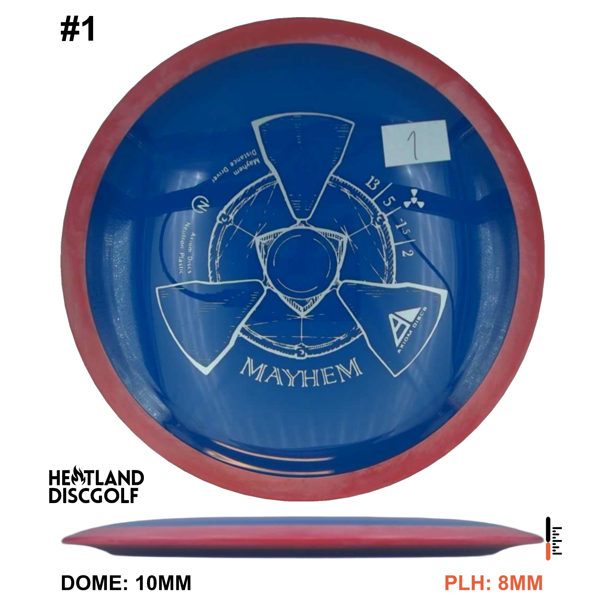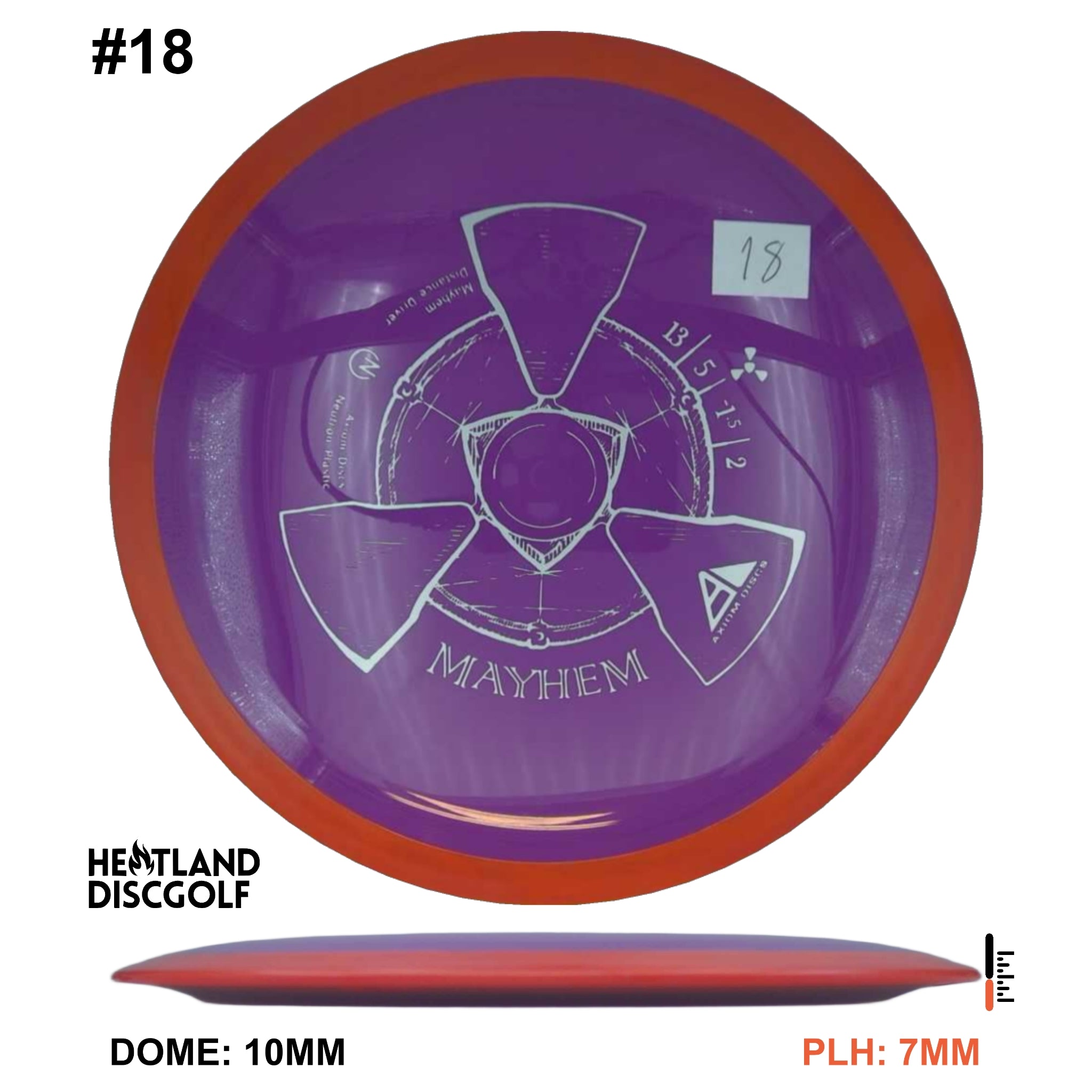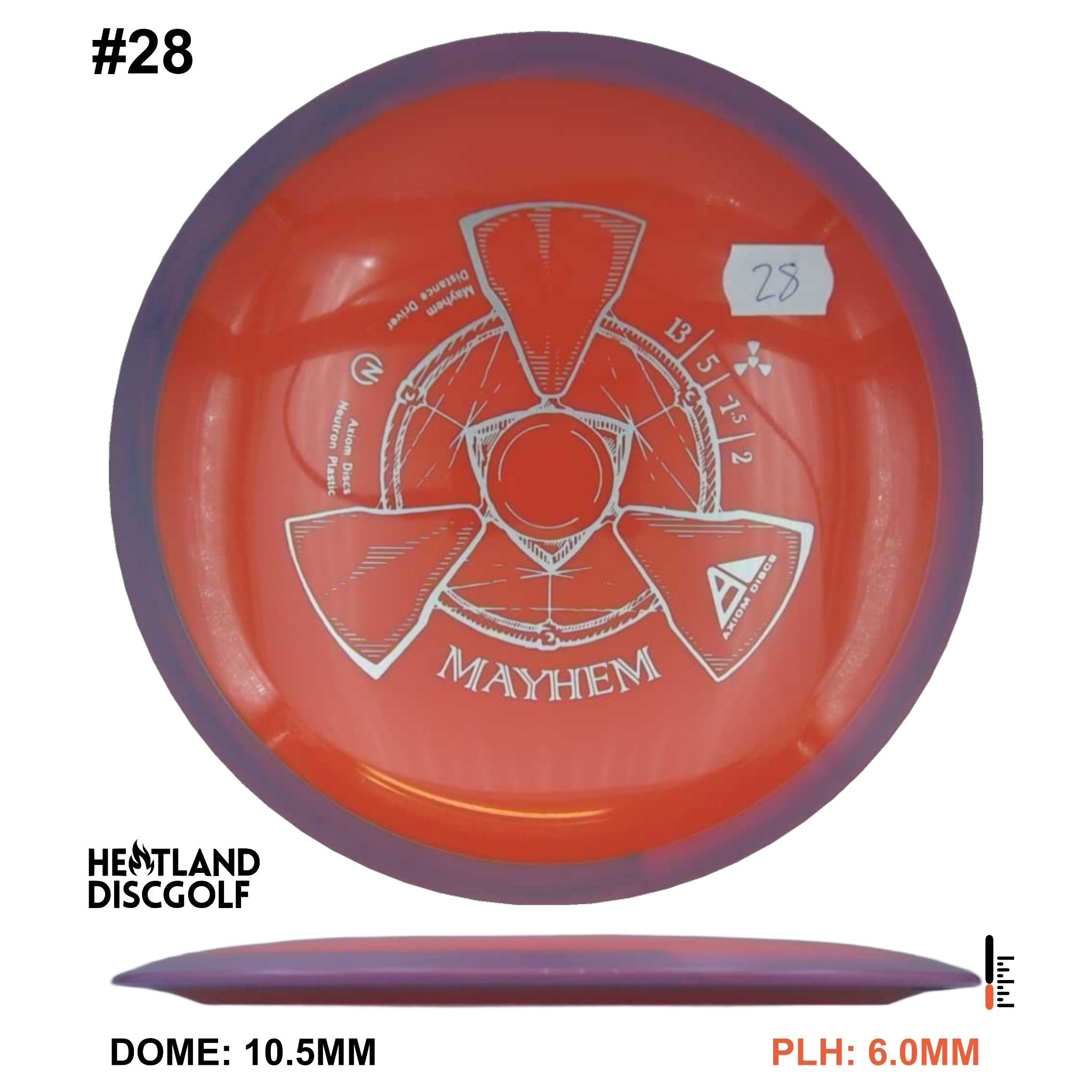 Mayhem has a responsive straight-stable profile and plenty of speed, making it a perfect workhorse driver for many advanced and expert throwers. Like the MVP 23mm class, the Mayhem has a pronounced dome to promote distance-covering glide. Mayhem is best compared to a beat MVP Octane.