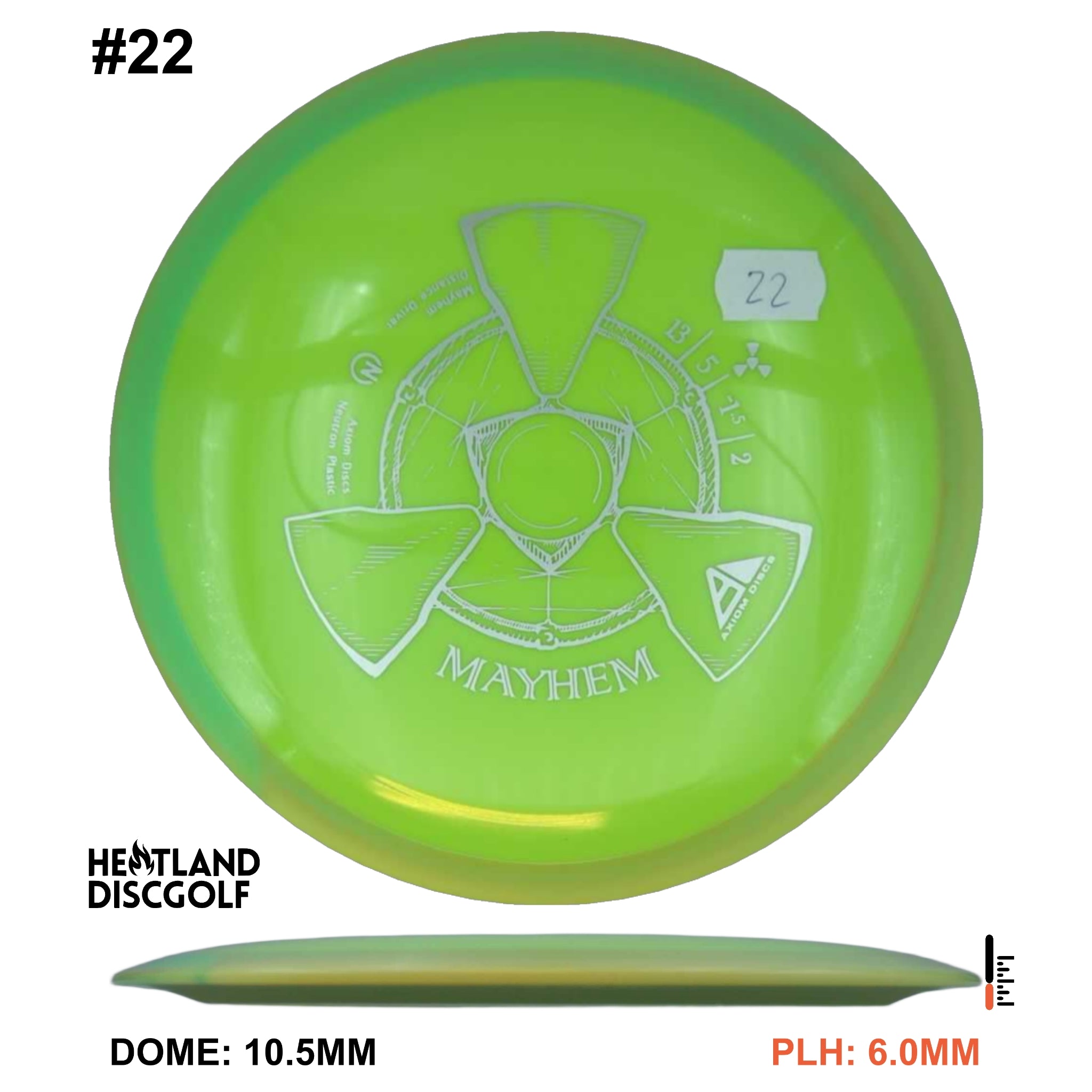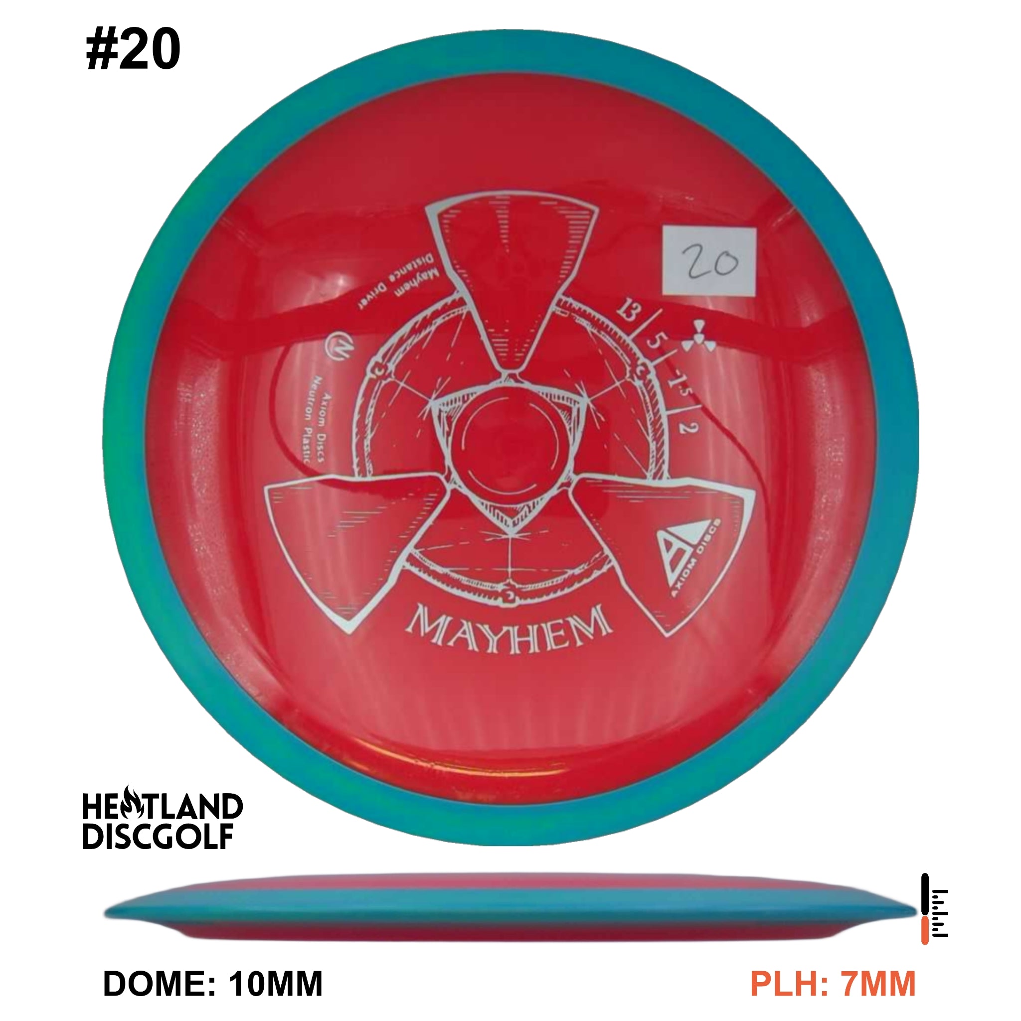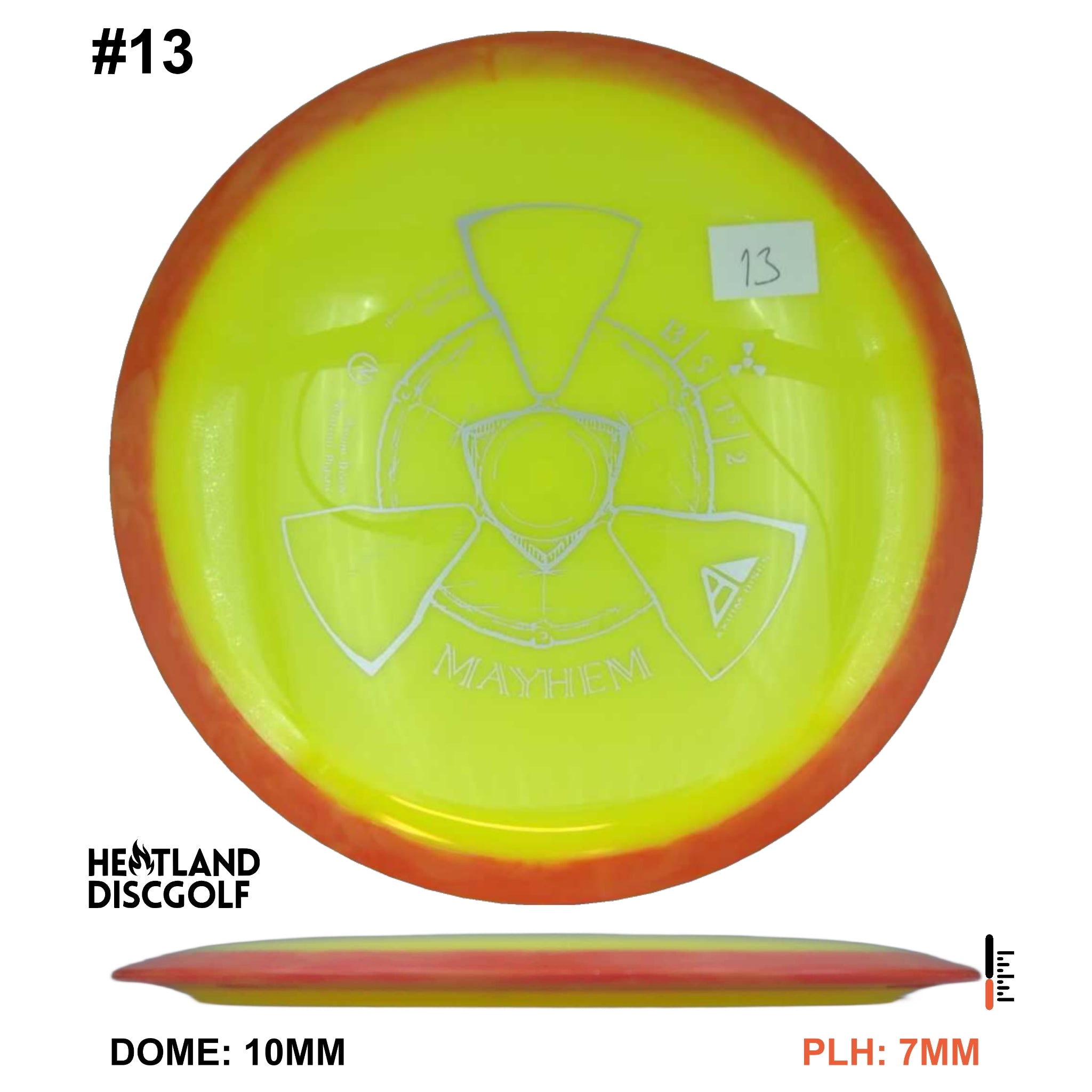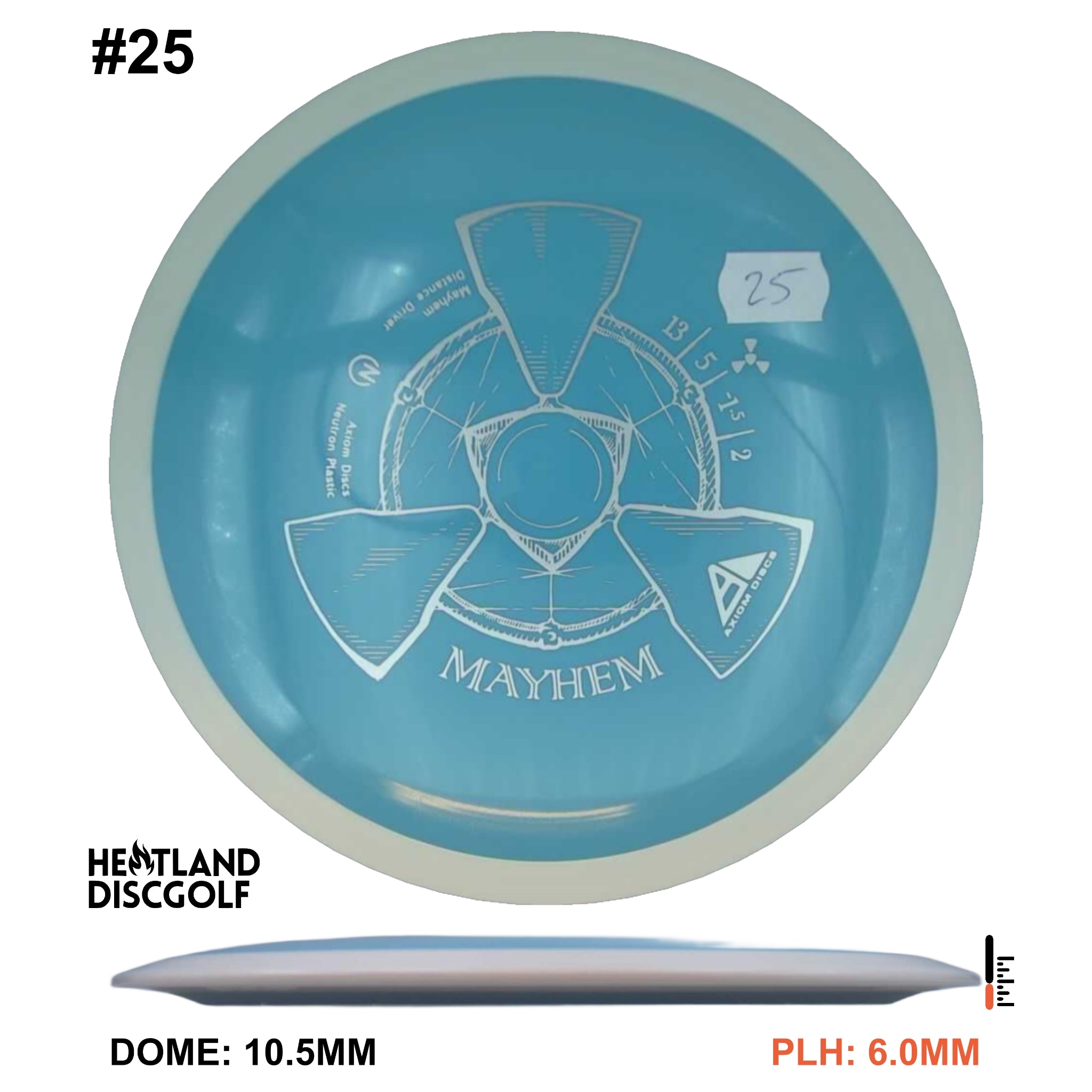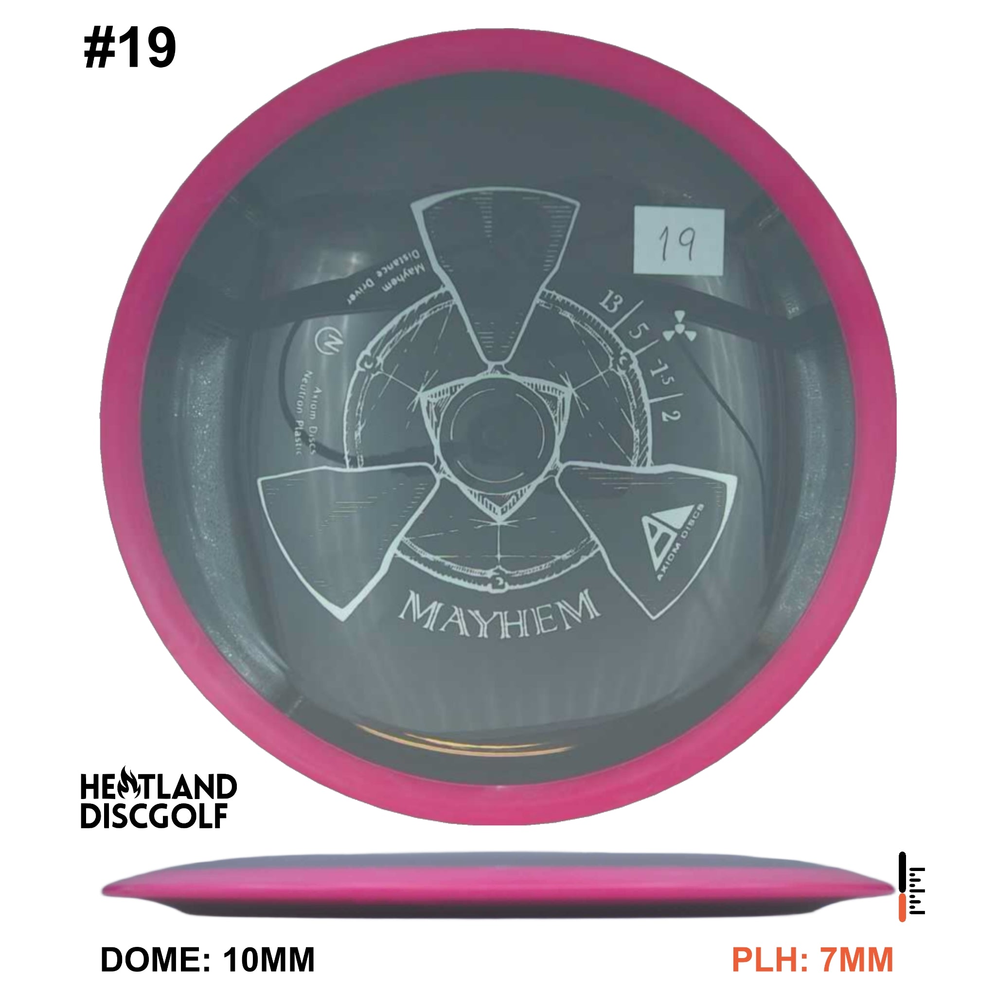 Mayhem has a responsive straight-stable profile and plenty of speed, making it a perfect workhorse driver for many advanced and expert throwers. Like the MVP 23mm class, the Mayhem has a pronounced dome to promote distance-covering glide. Mayhem is best compared to a beat MVP Octane.