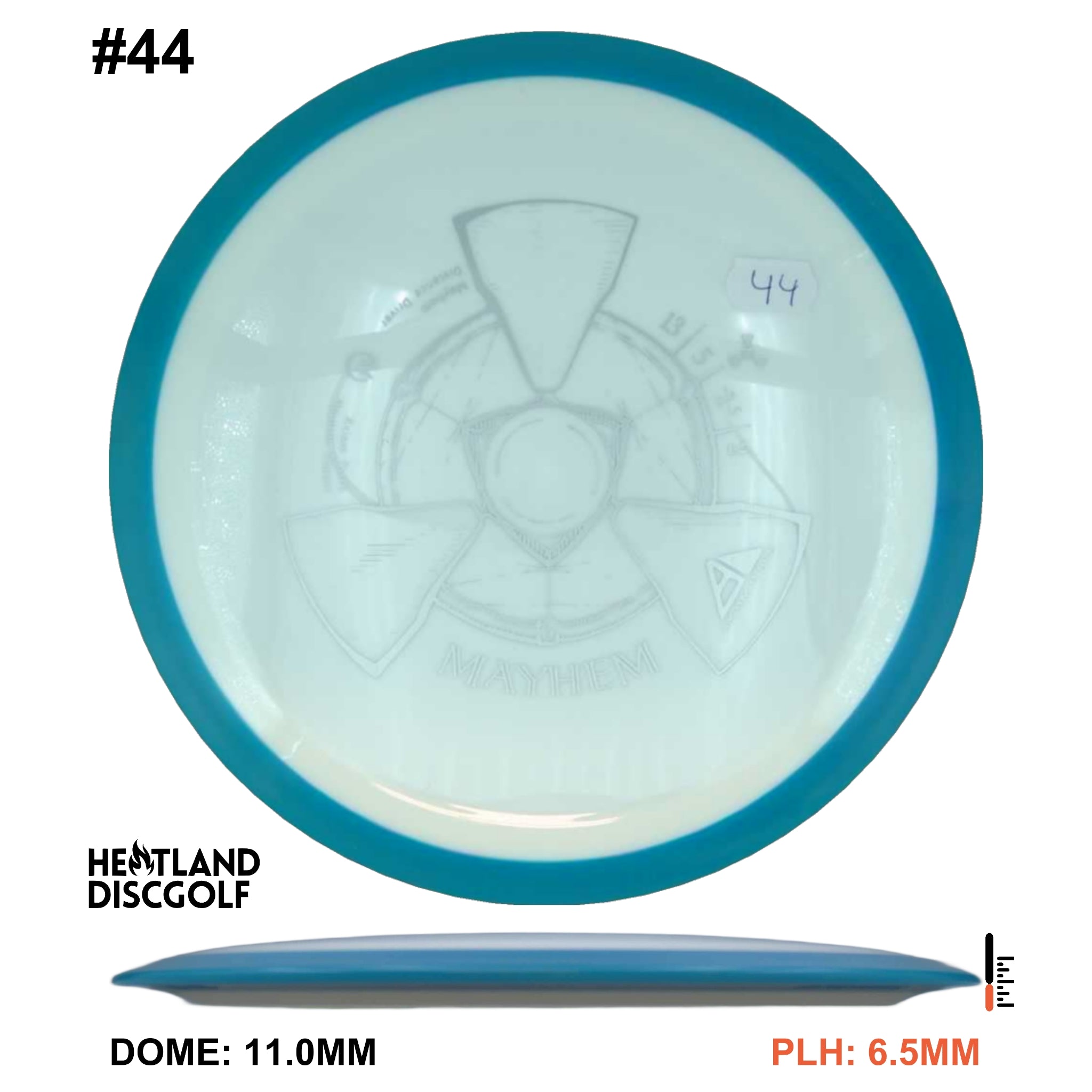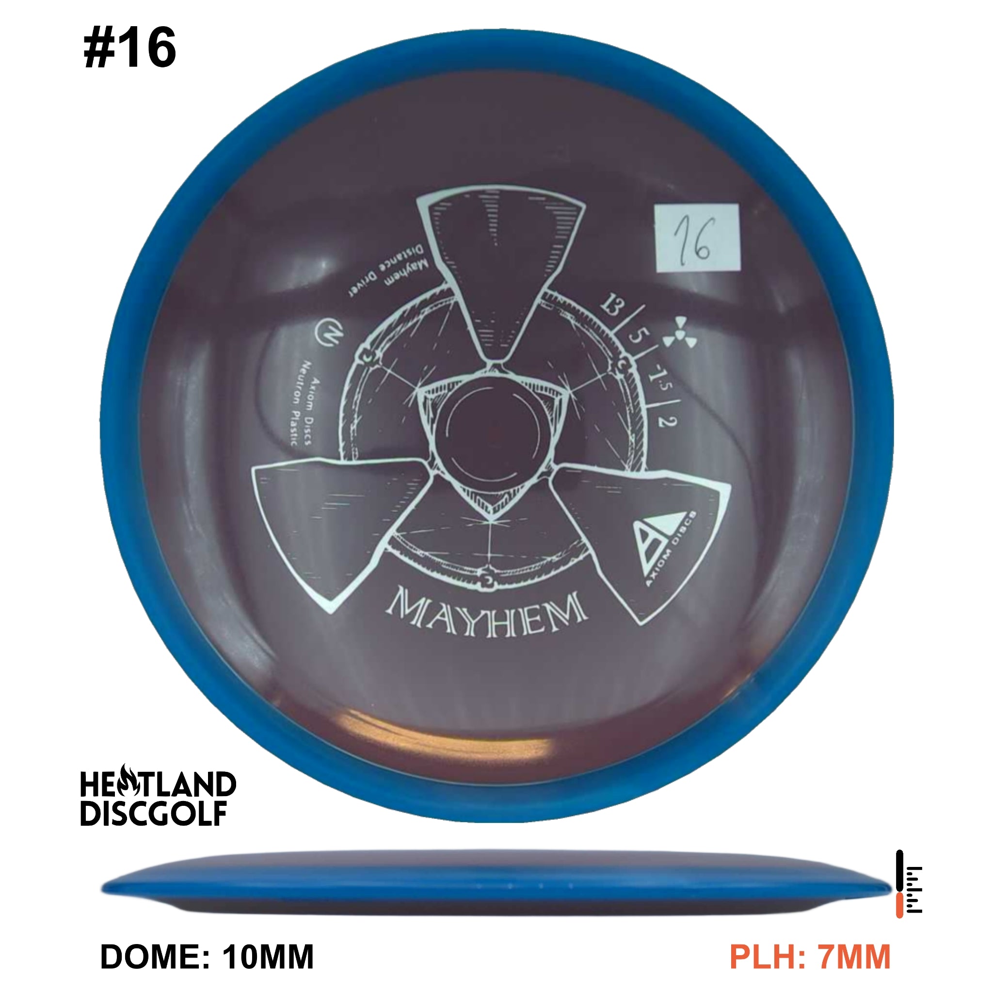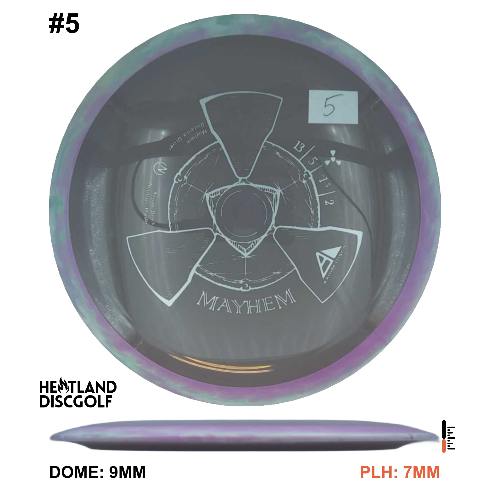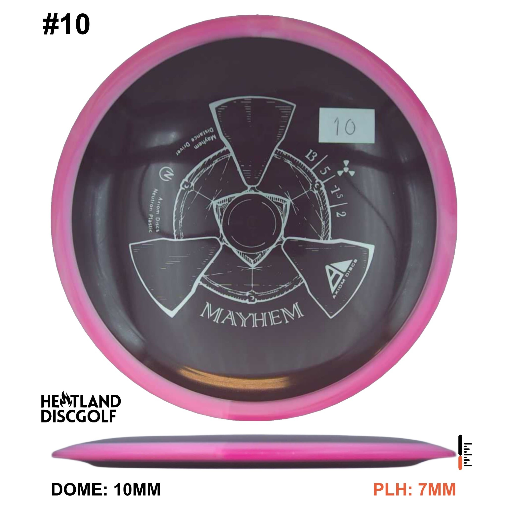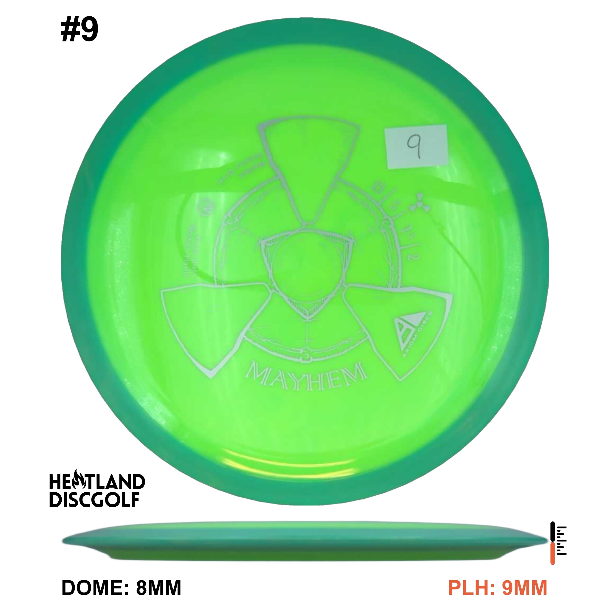 Mayhem has a responsive straight-stable profile and plenty of speed, making it a perfect workhorse driver for many advanced and expert throwers. Like the MVP 23mm class, the Mayhem has a pronounced dome to promote distance-covering glide. Mayhem is best compared to a beat MVP Octane.
