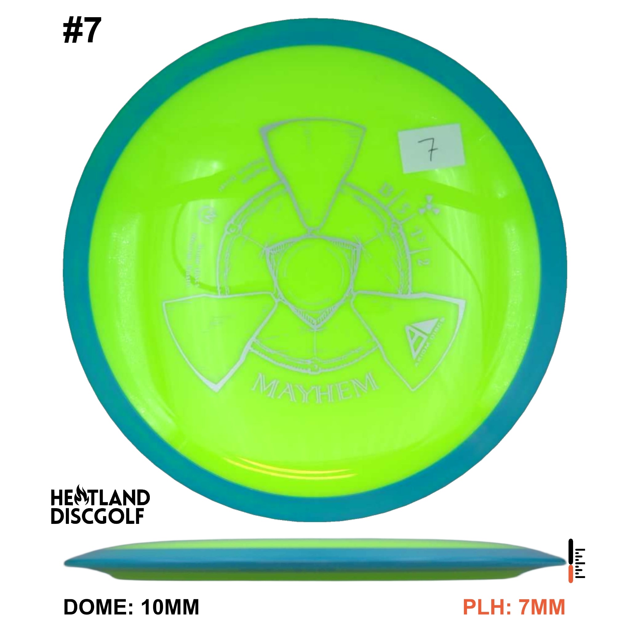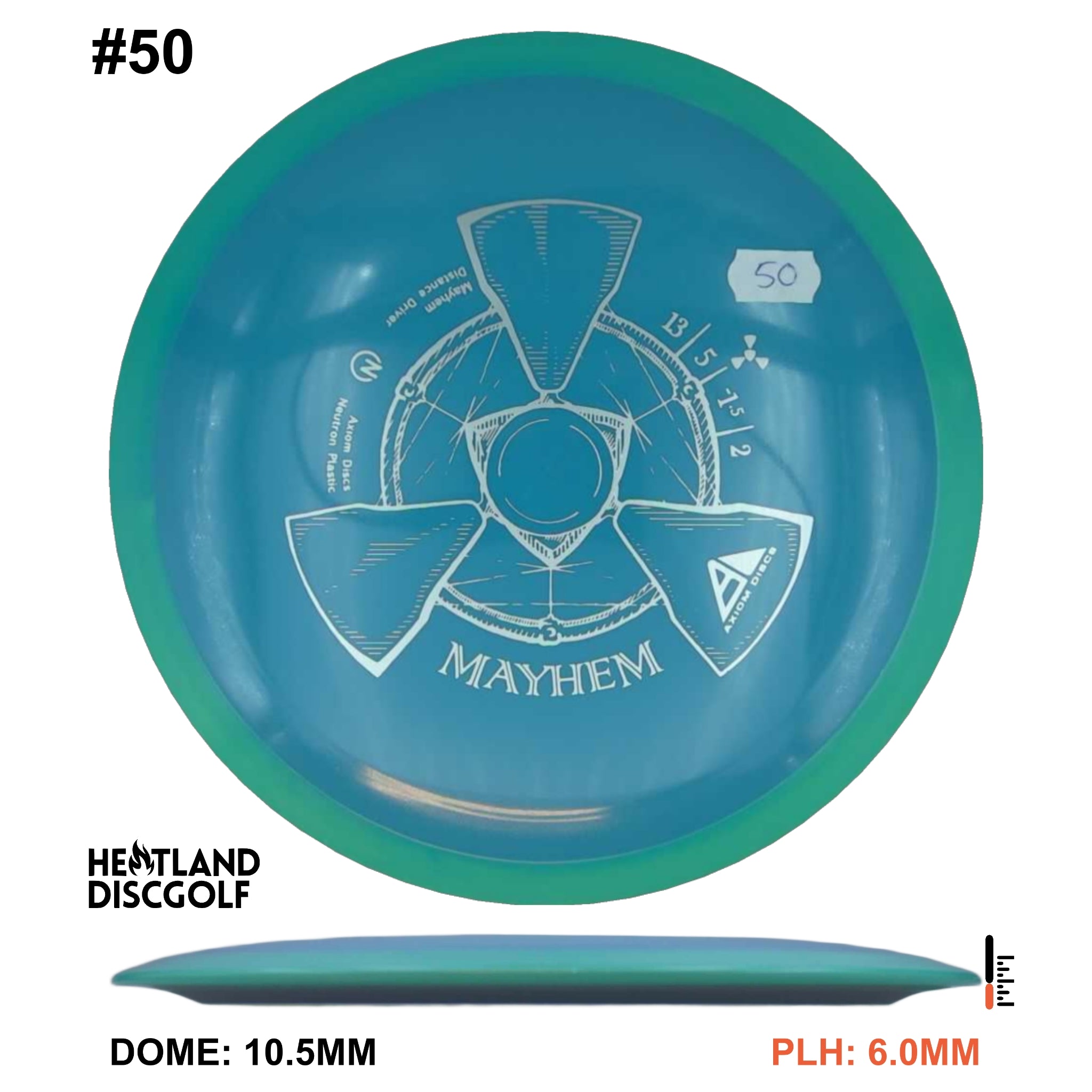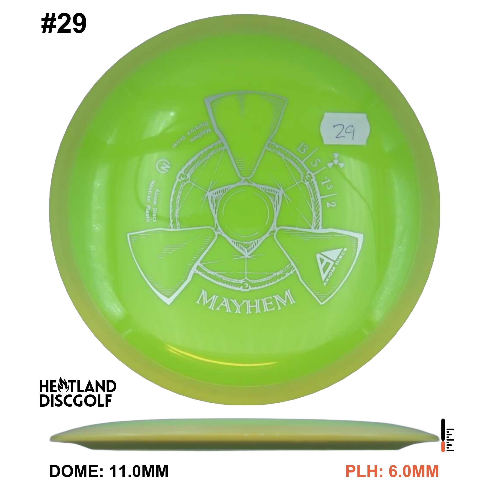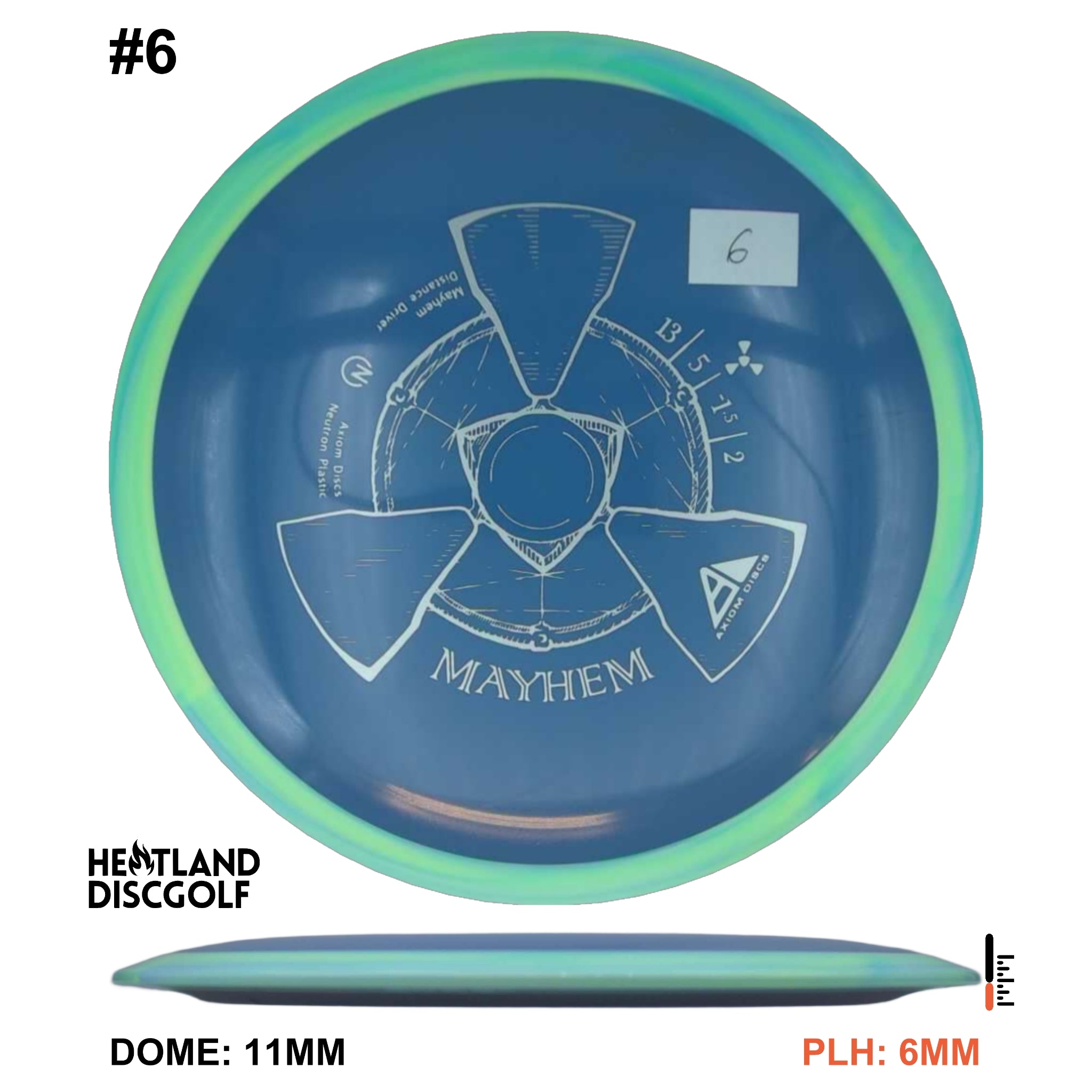 Mayhem has a responsive straight-stable profile and plenty of speed, making it a perfect workhorse driver for many advanced and expert throwers. Like the MVP 23mm class, the Mayhem has a pronounced dome to promote distance-covering glide. Mayhem is best compared to a beat MVP Octane.