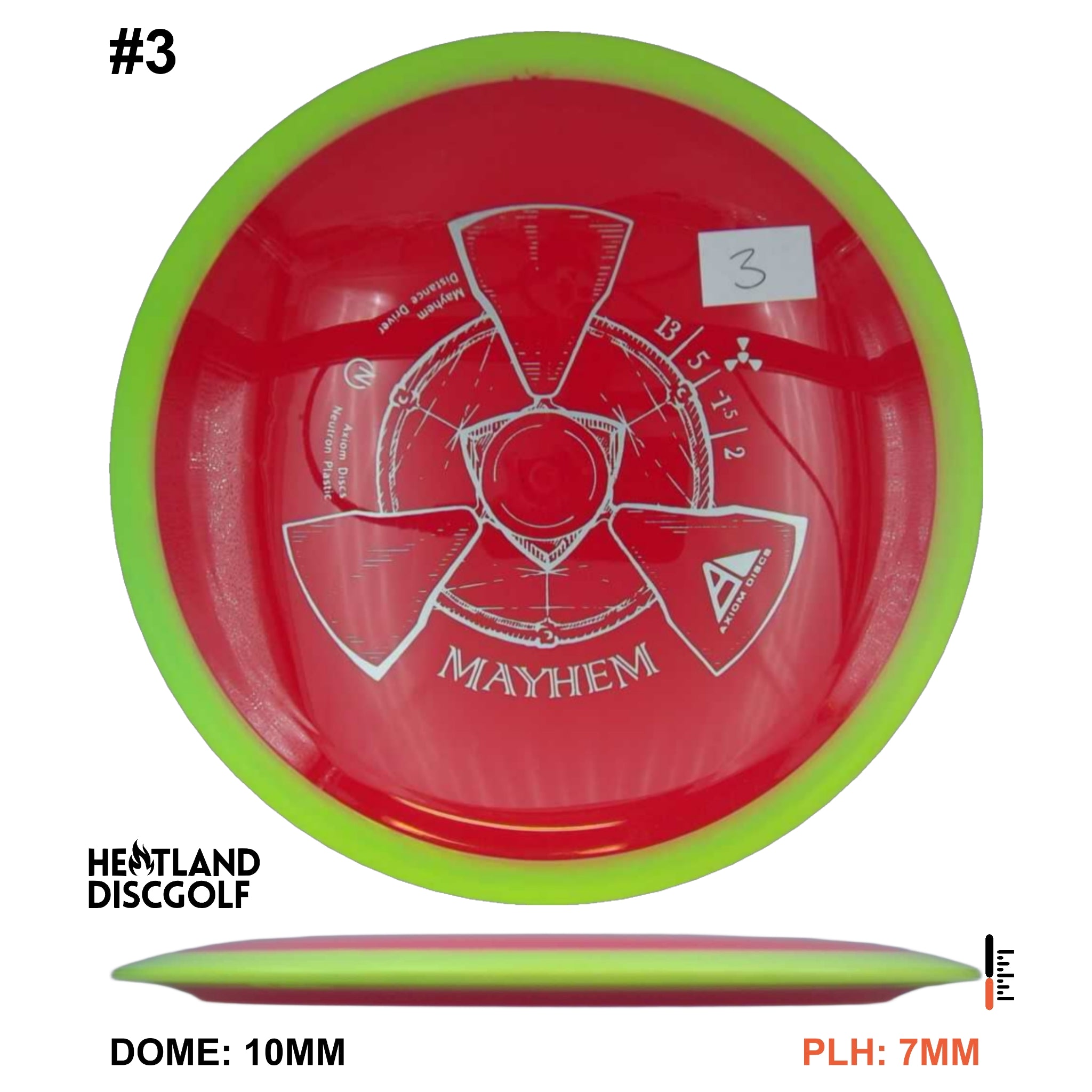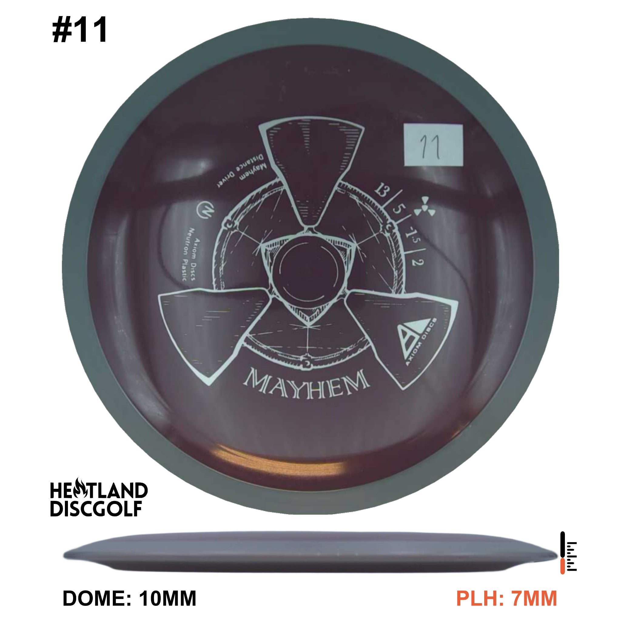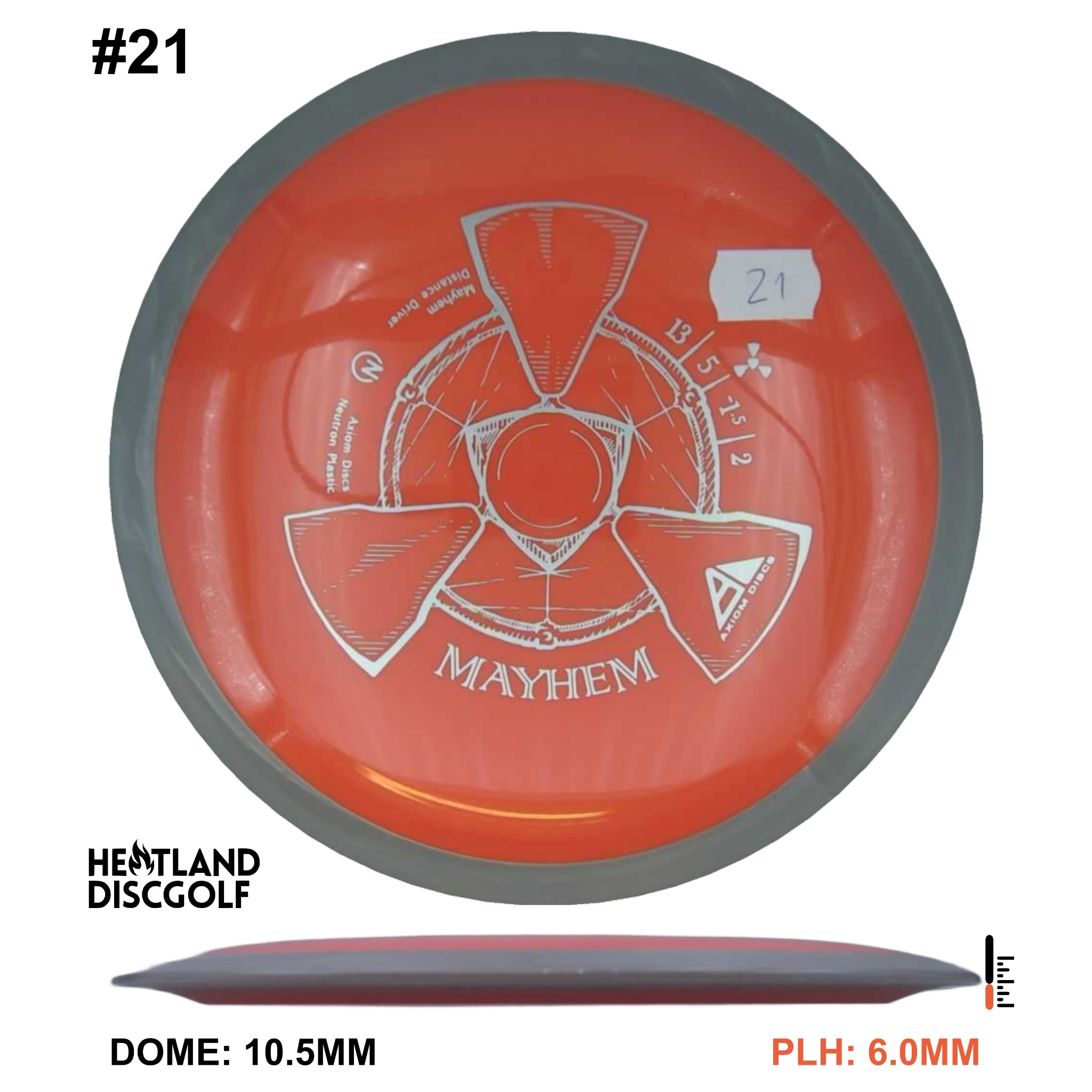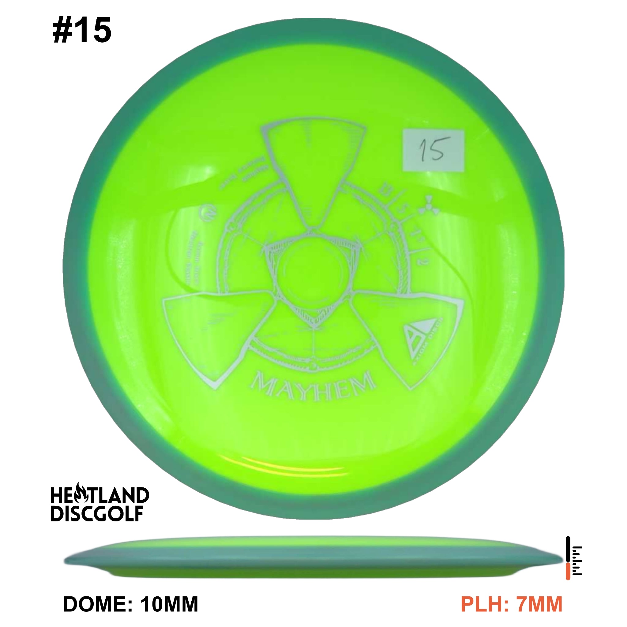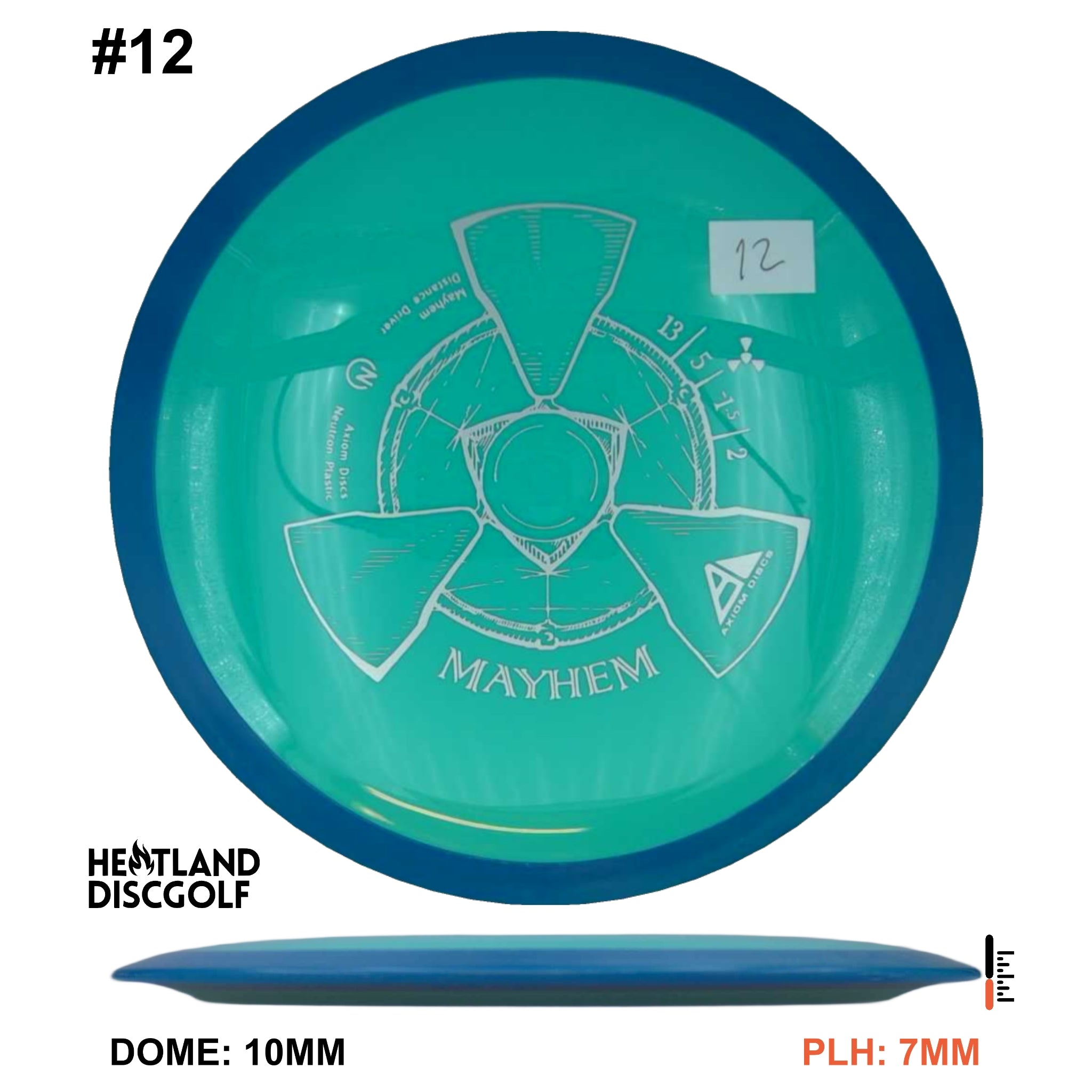 Mayhem has a responsive straight-stable profile and plenty of speed, making it a perfect workhorse driver for many advanced and expert throwers. Like the MVP 23mm class, the Mayhem has a pronounced dome to promote distance-covering glide. Mayhem is best compared to a beat MVP Octane.