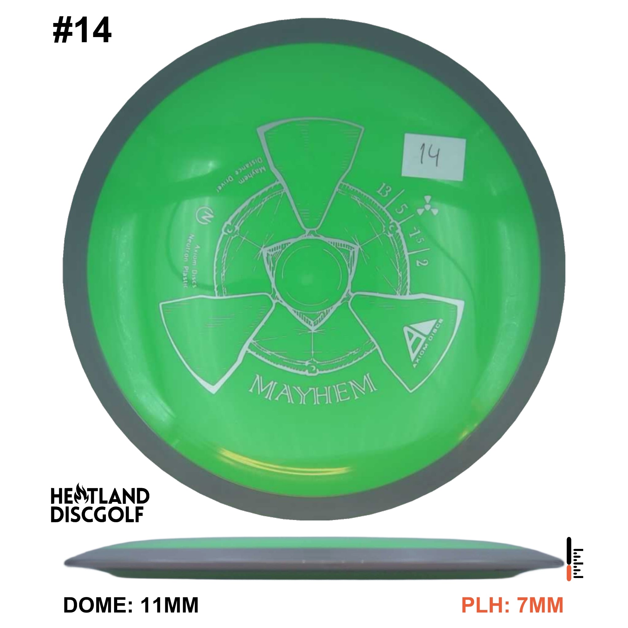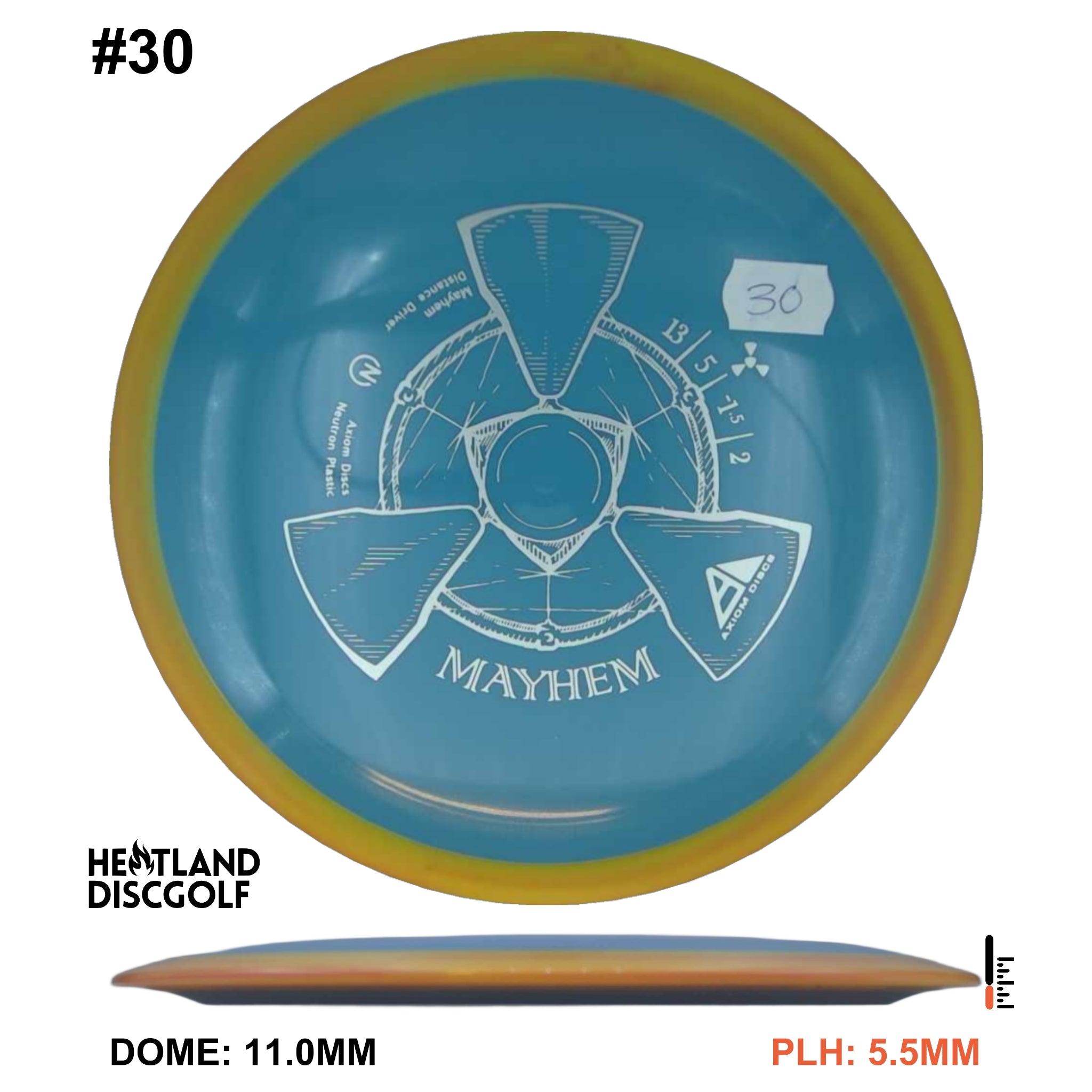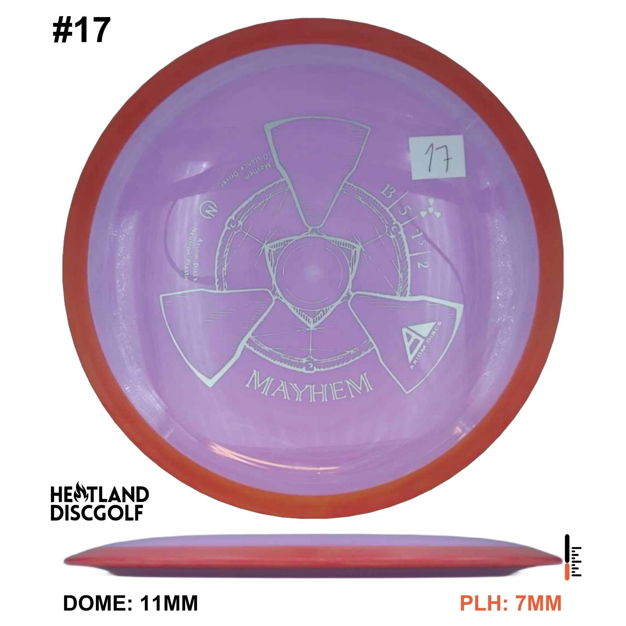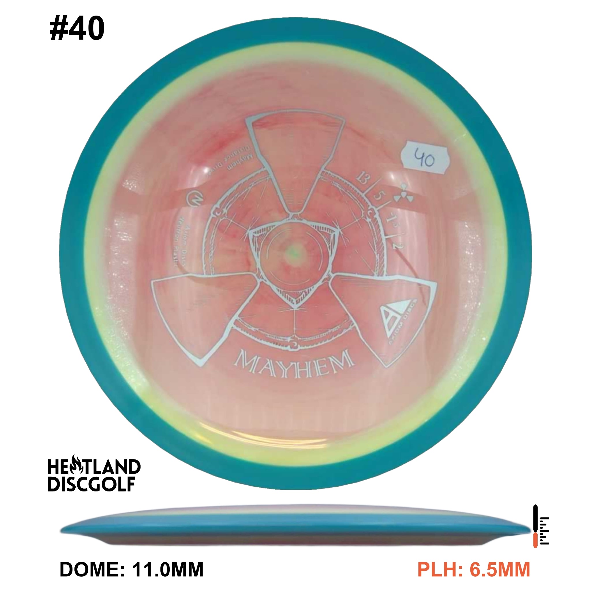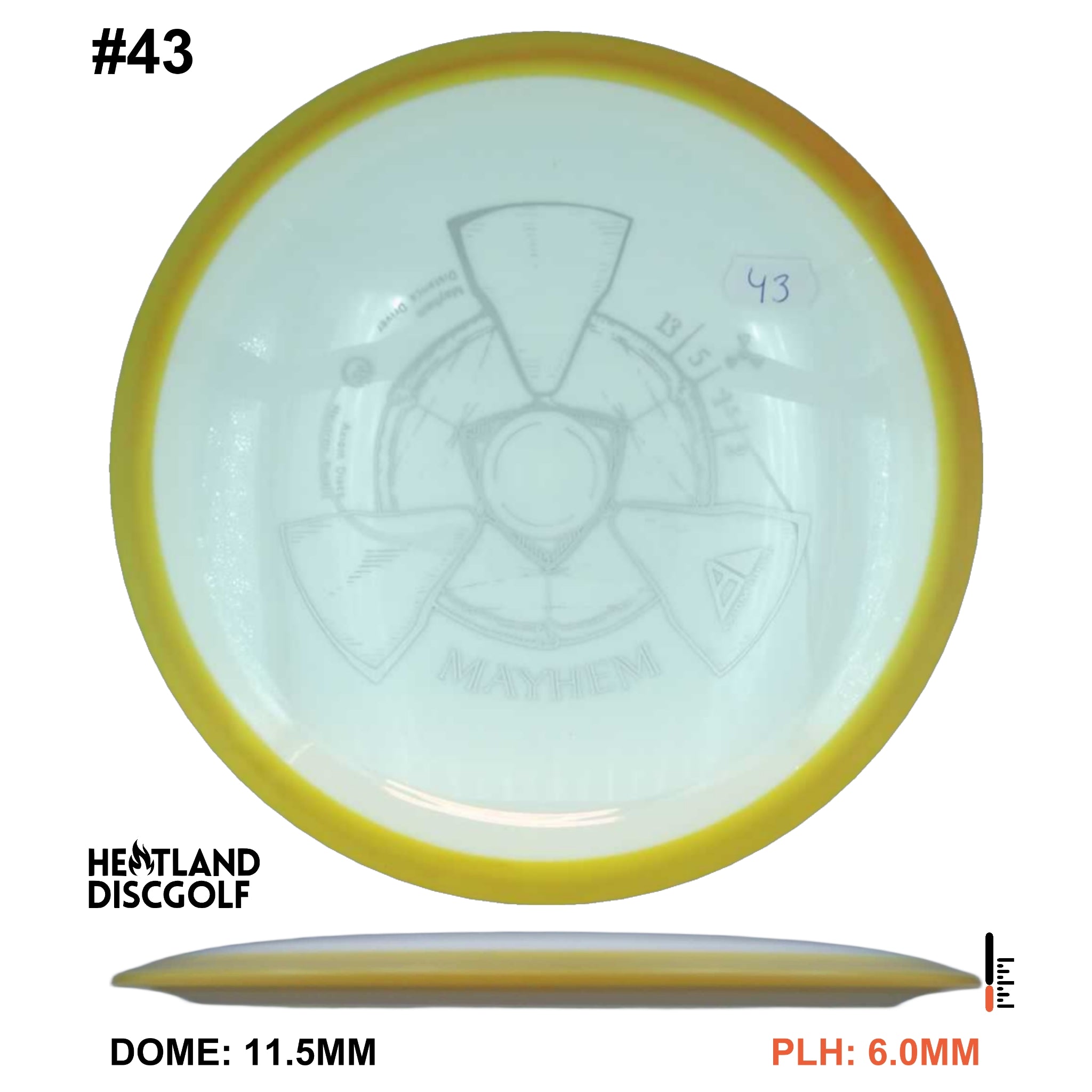 Mayhem has a responsive straight-stable profile and plenty of speed, making it a perfect workhorse driver for many advanced and expert throwers. Like the MVP 23mm class, the Mayhem has a pronounced dome to promote distance-covering glide. Mayhem is best compared to a beat MVP Octane.