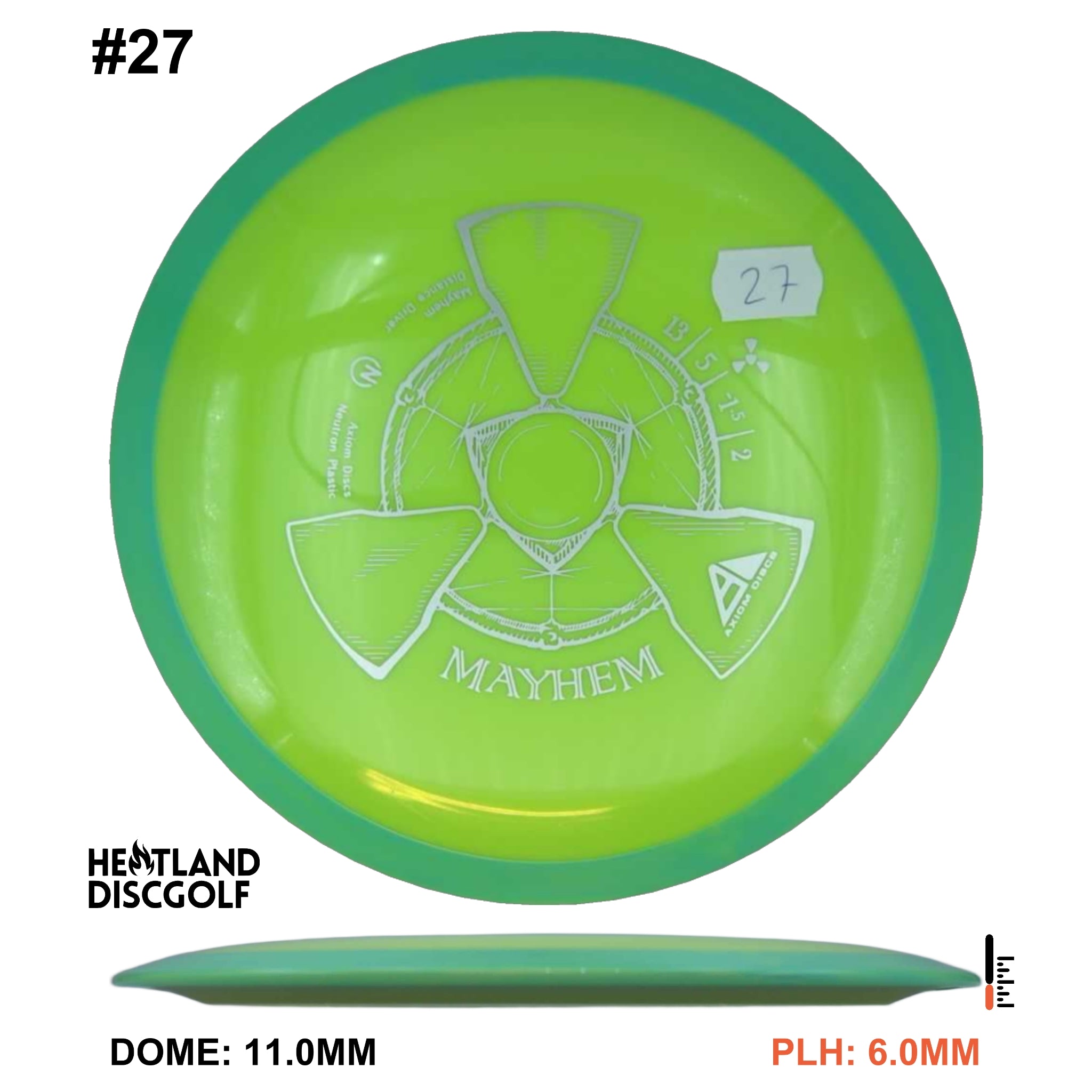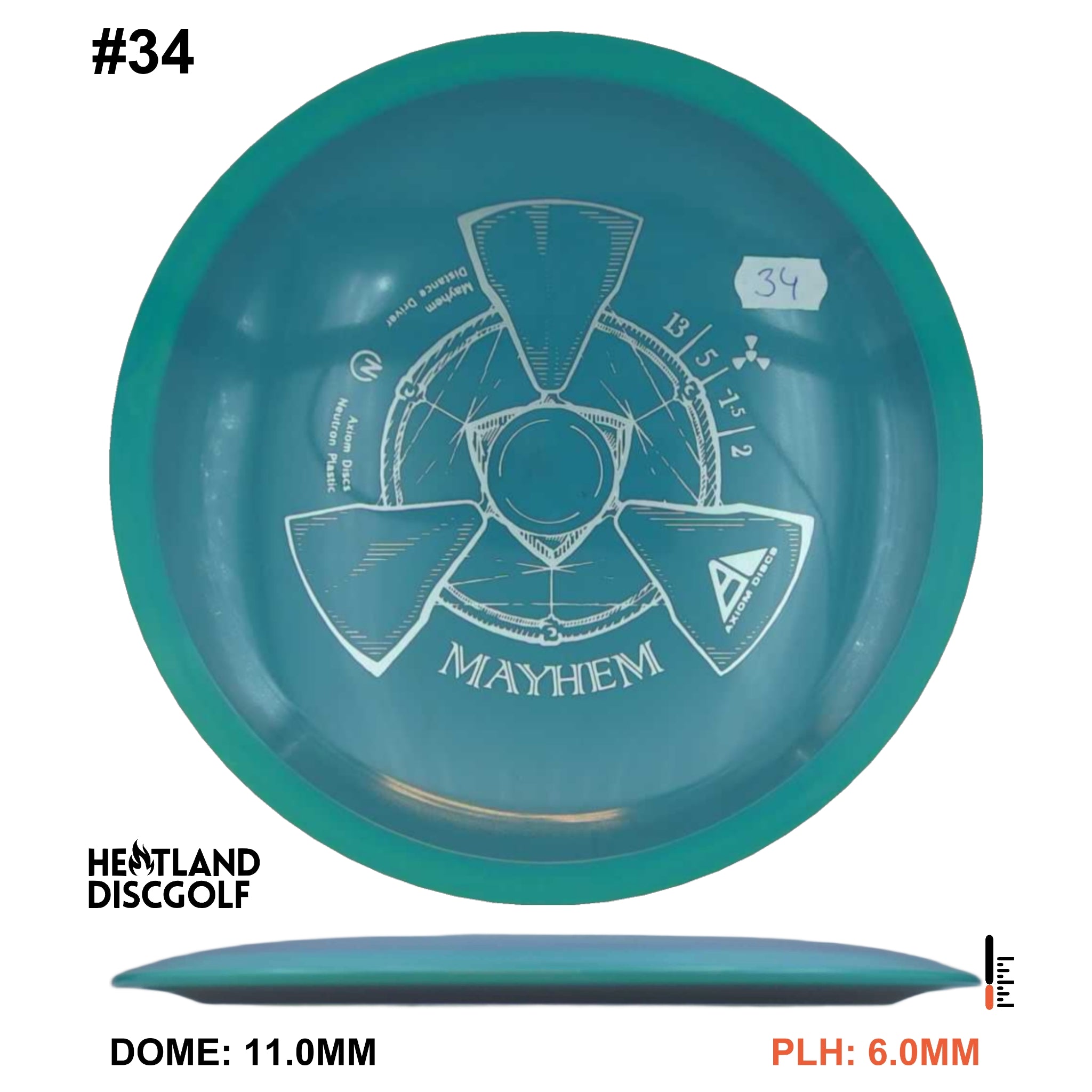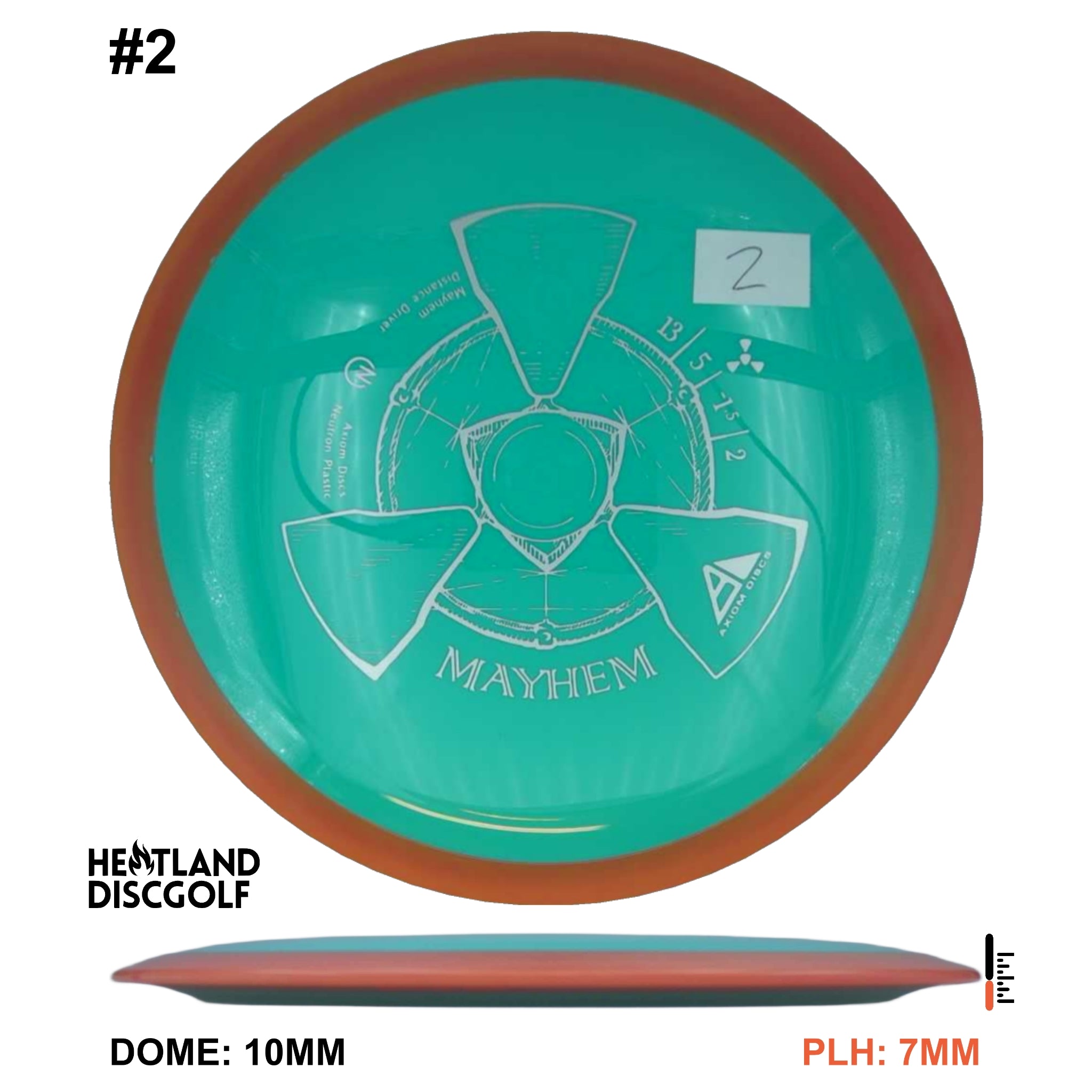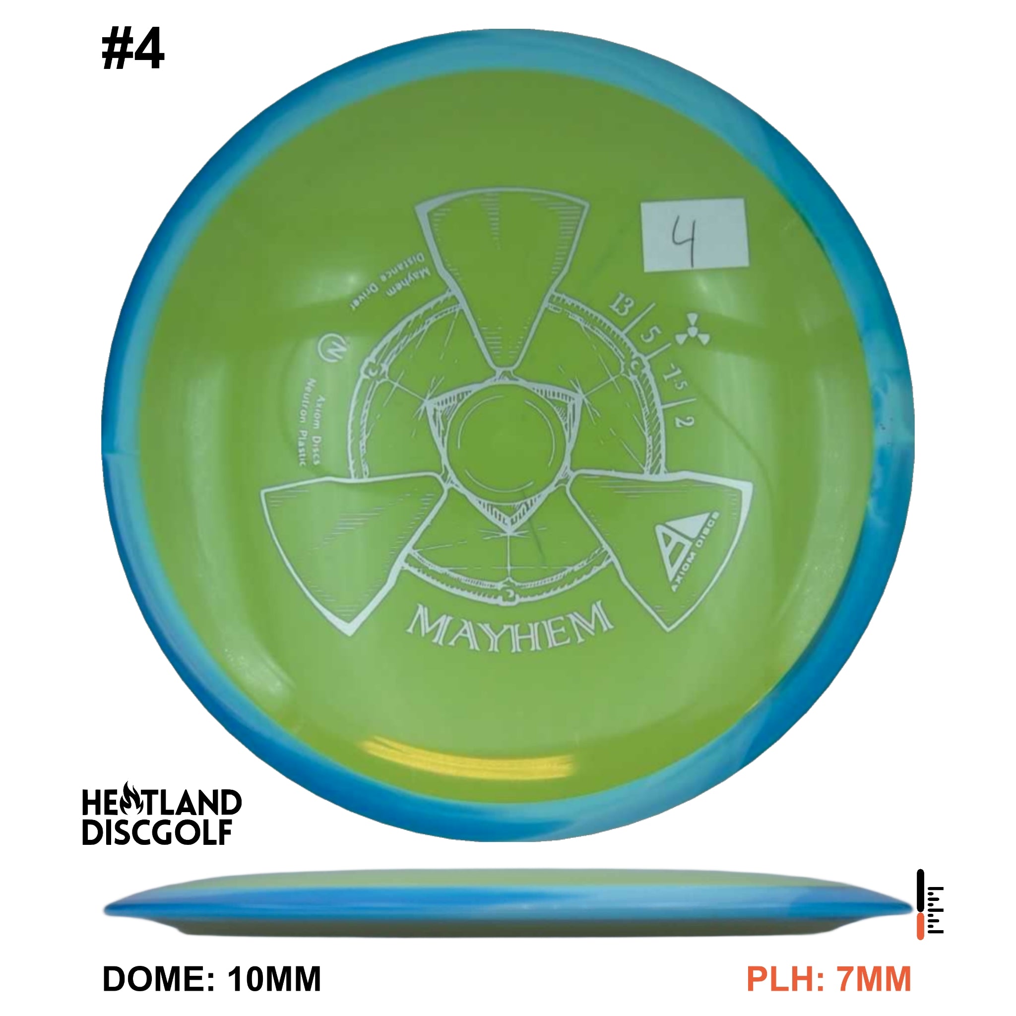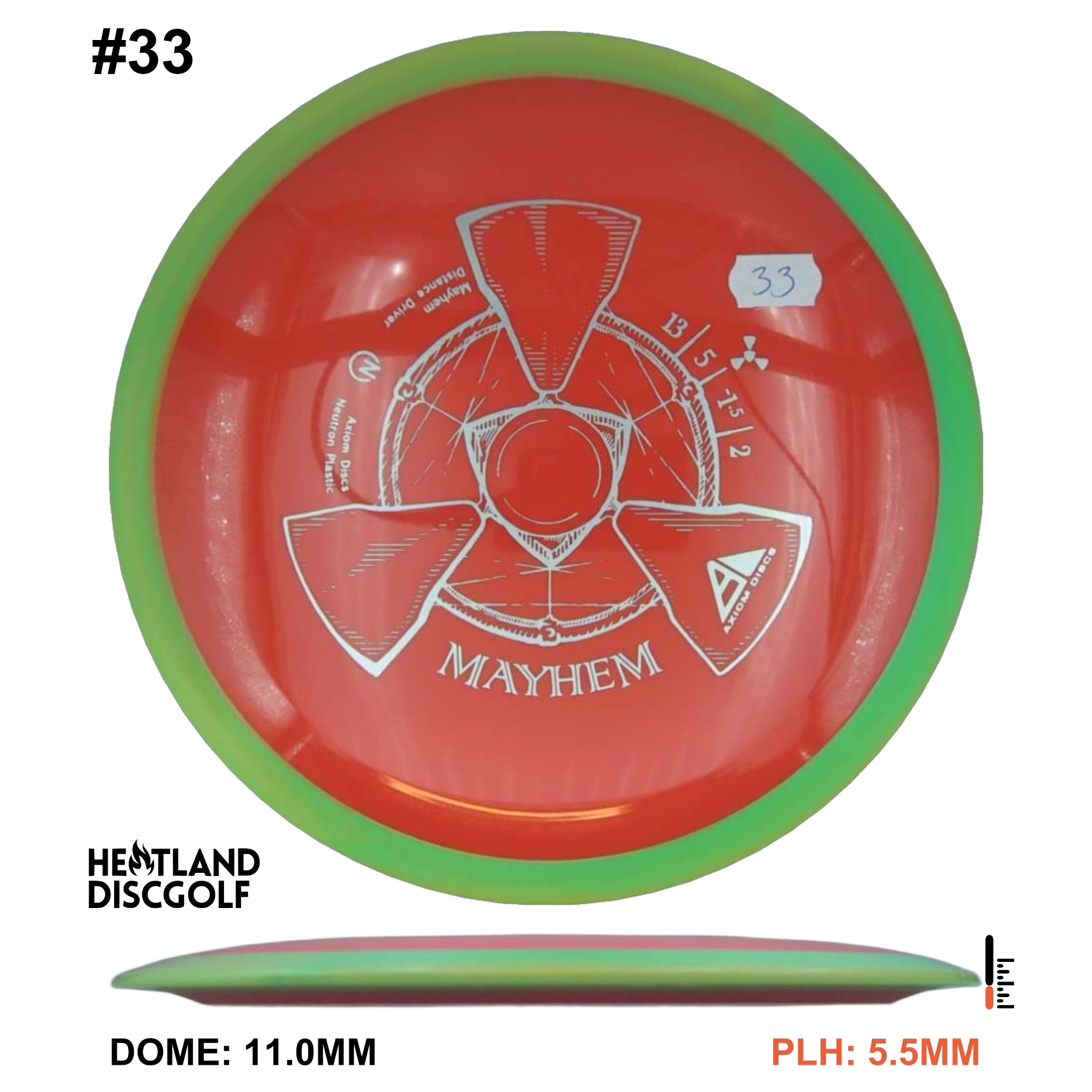 Mayhem has a responsive straight-stable profile and plenty of speed, making it a perfect workhorse driver for many advanced and expert throwers. Like the MVP 23mm class, the Mayhem has a pronounced dome to promote distance-covering glide. Mayhem is best compared to a beat MVP Octane.