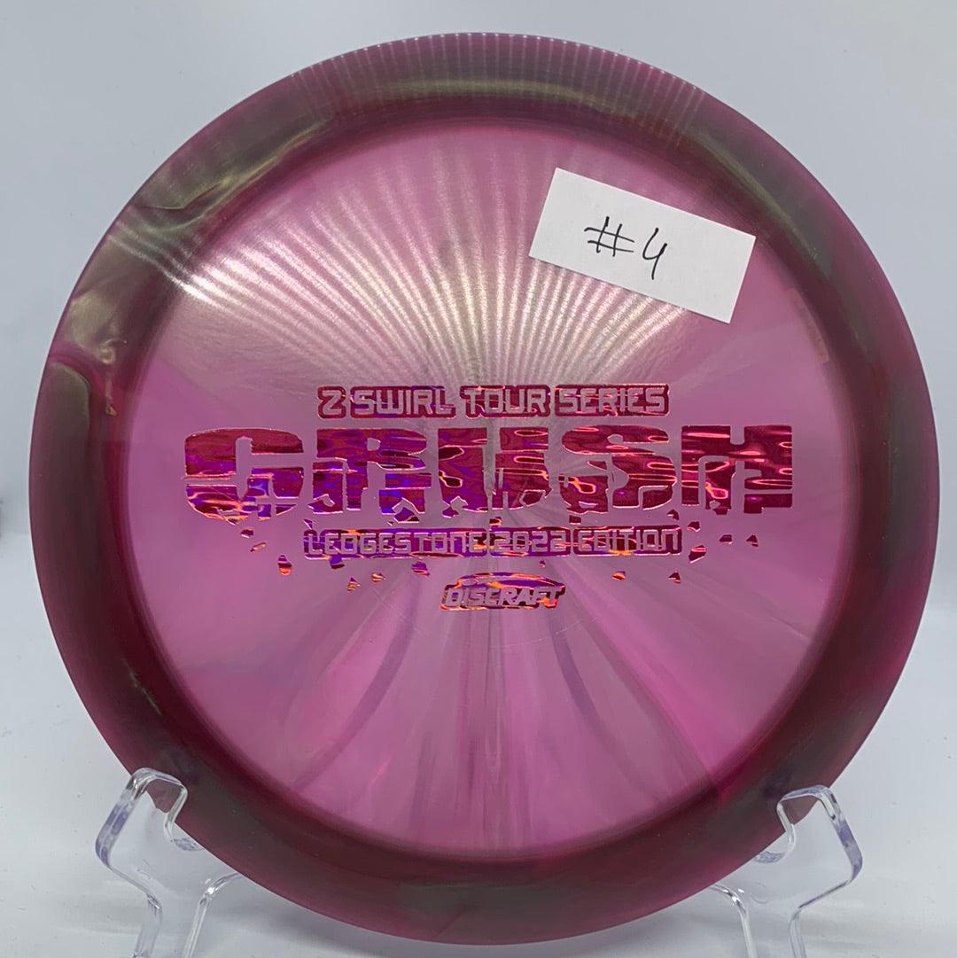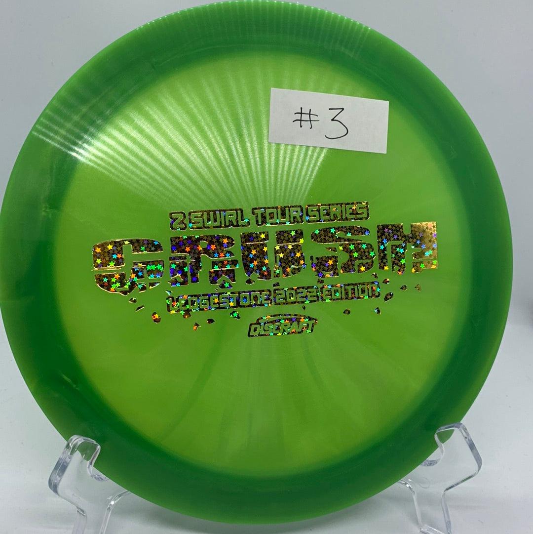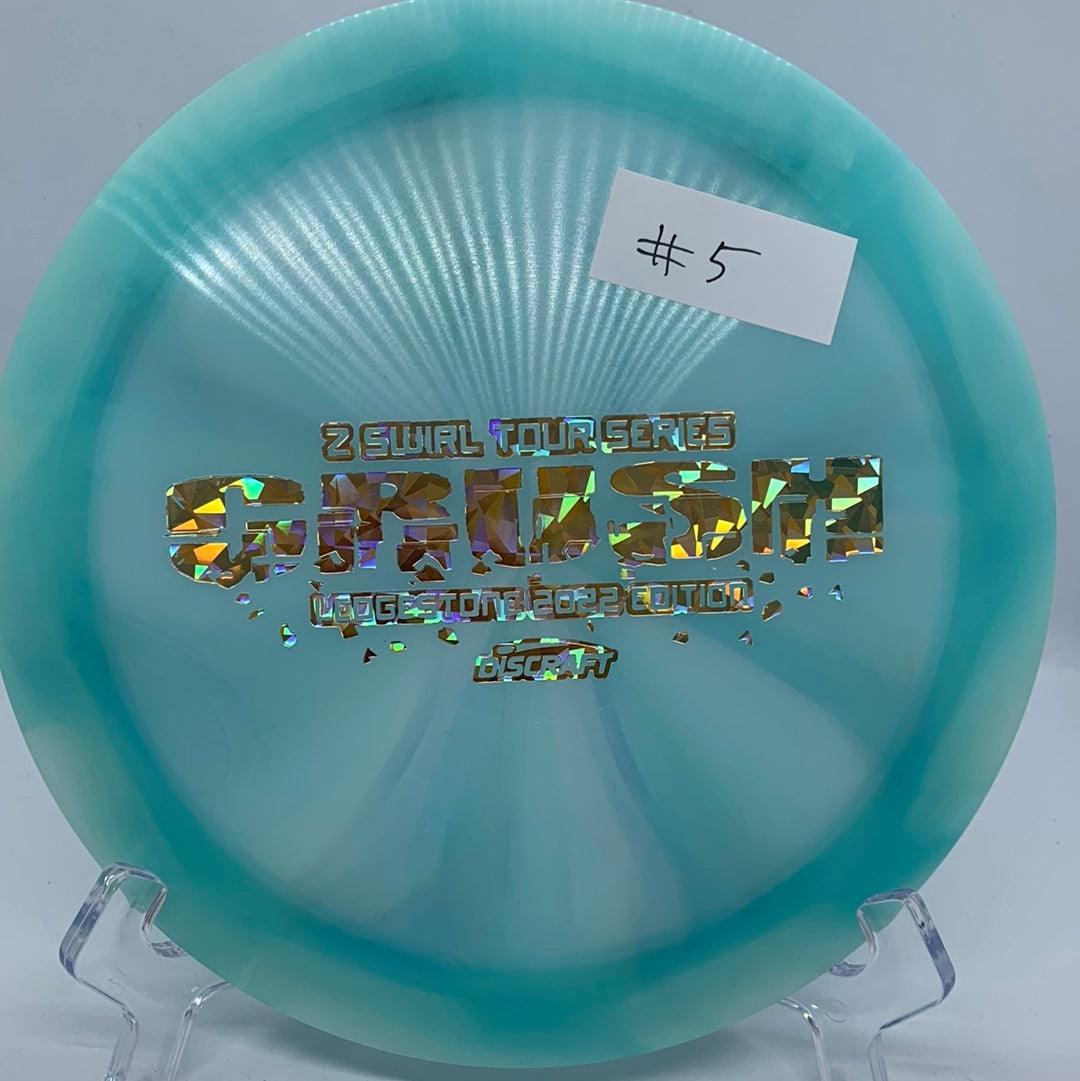 The Crush is an out of production Discraft disc that we brought back in a limited run for the 2020 Ledgestone event and now we are bringing it back again, this time in Z Swirl plastic. The Crush is an overstable, 11 speed driver that is great for both backhand and forehand throws. This was a limited run of only 1000 discs with a stamp design by Les White