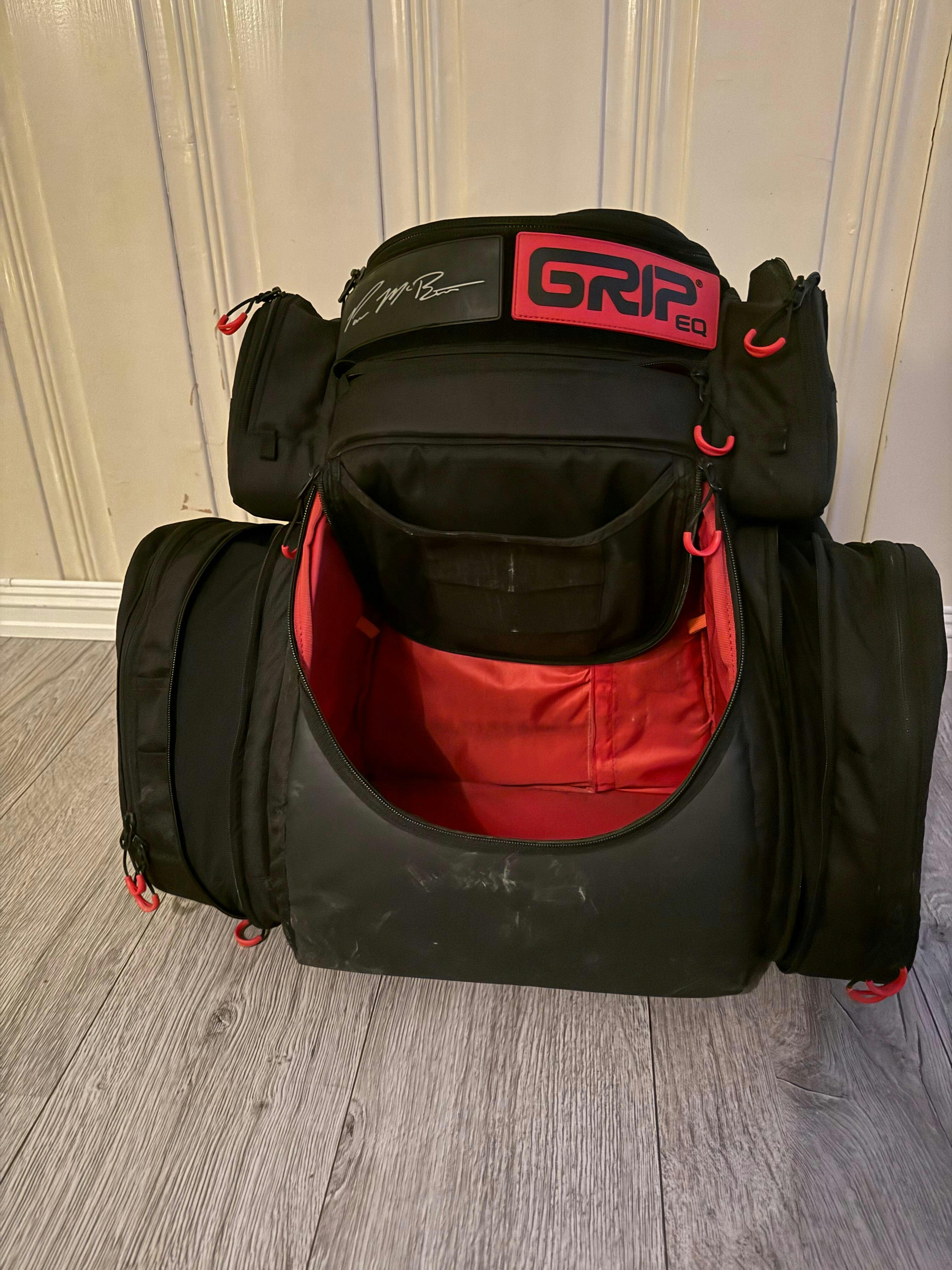 Each bag purchase includes a limited-edition disc, a Paul McBeth flex mini marker, 4 custom velcro patches, an aluminum bag tag, and colored zipper pulls. Discs: Black/red Kratos or Purple/black Big Z Luna.