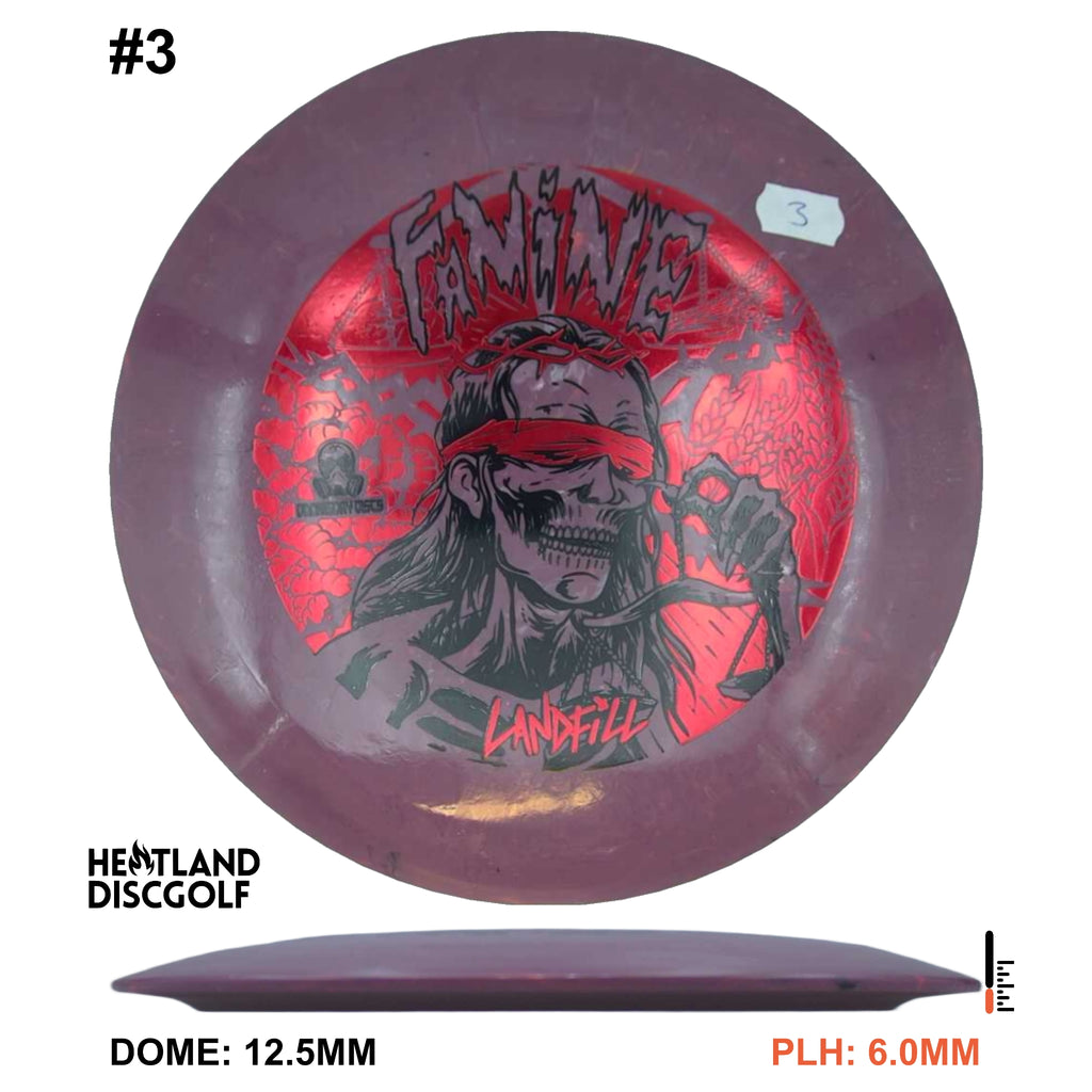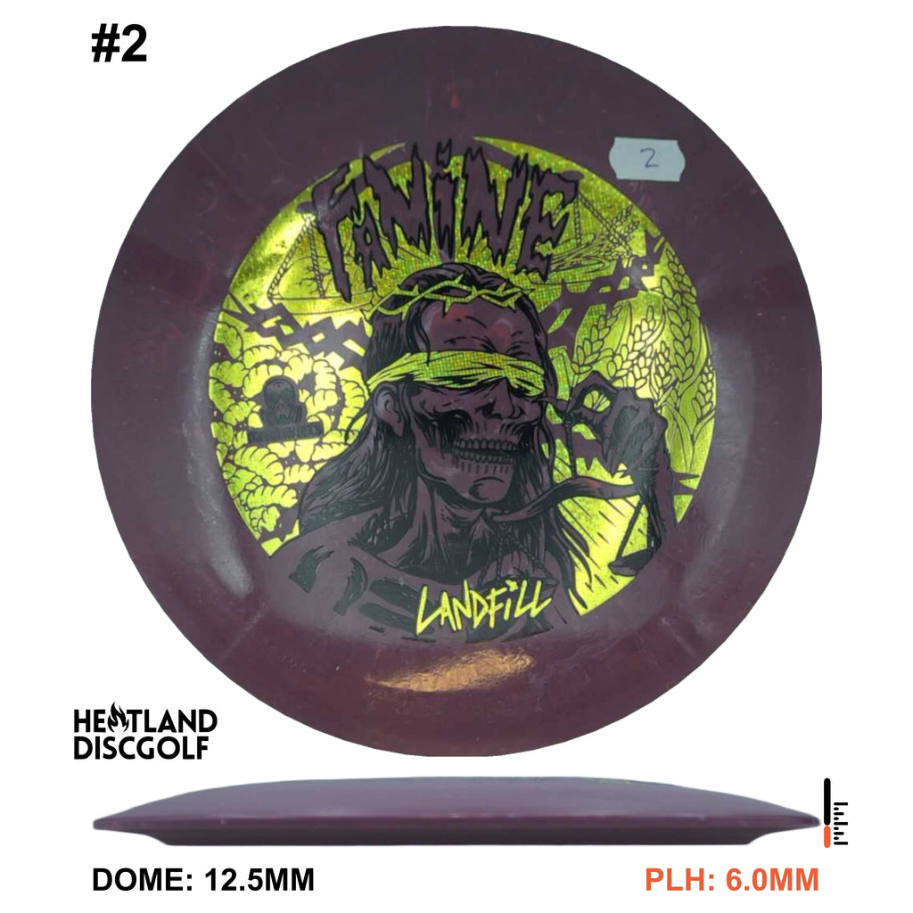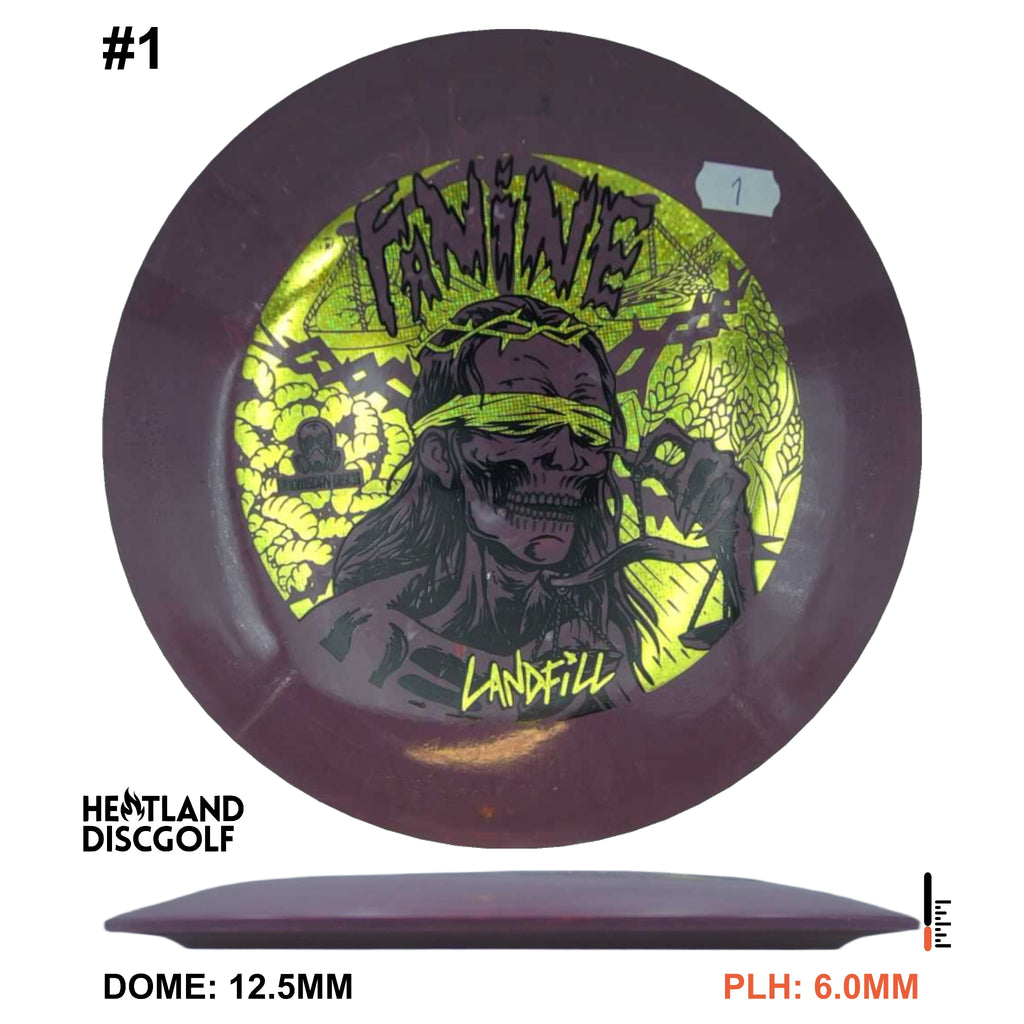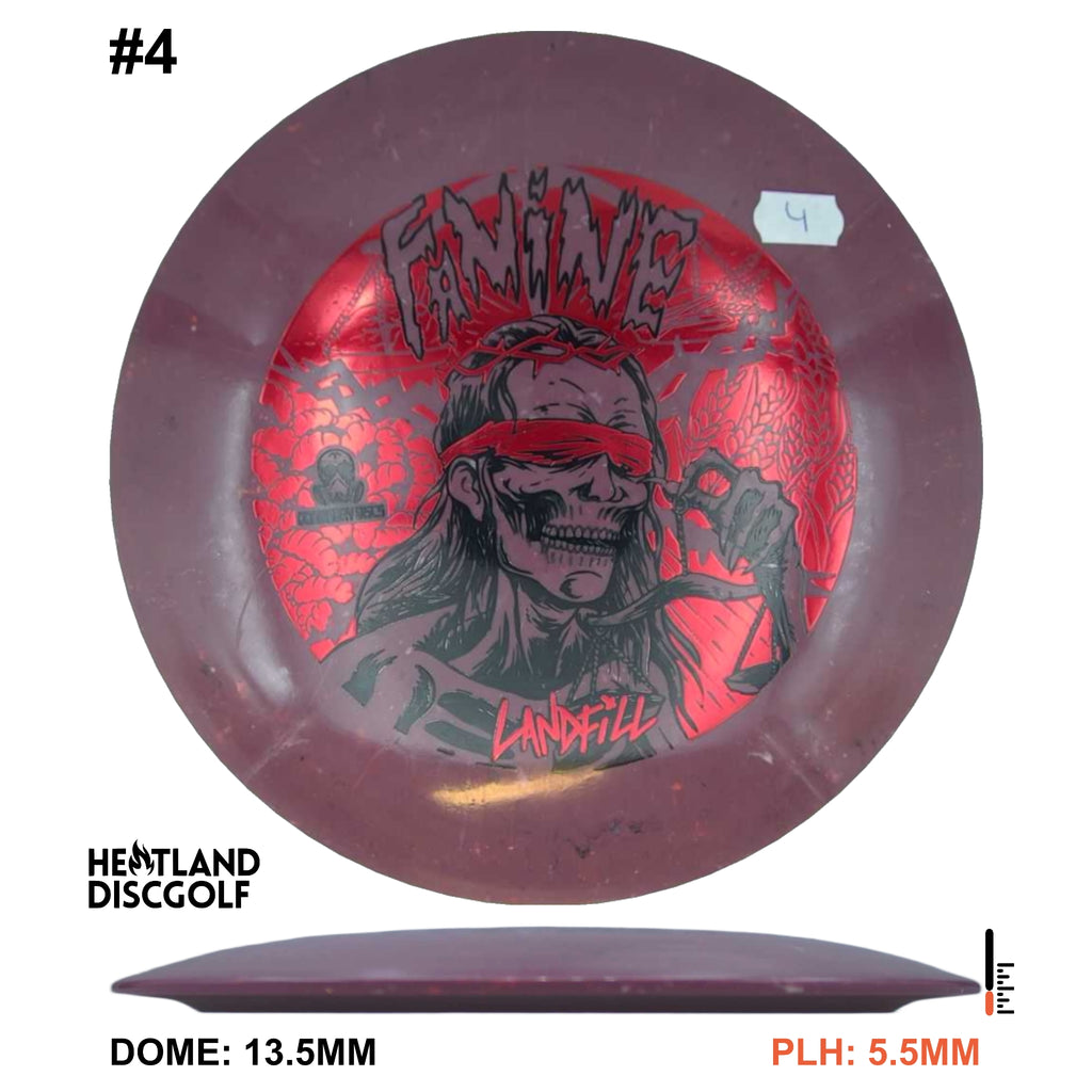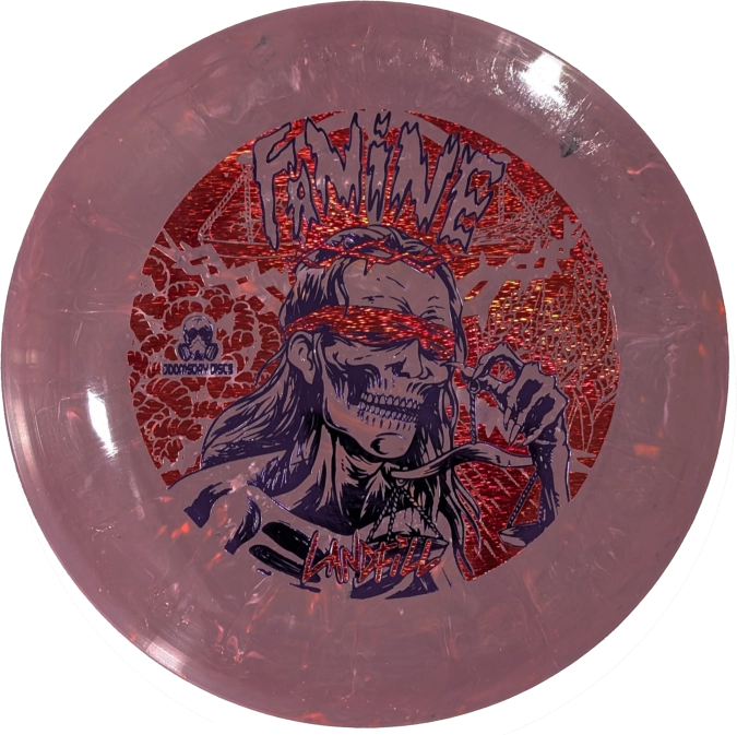 The Doomsday Discs Landfill Famine is an affordable, easy-to-throw distance driver molded from recycled materials. Landfill plastic varies slightly in texture and stiffness but maintains a comfortable grip and understable flight. The Doomsday Discs Famine in this blend provides easy turn and long glide for players seeking distance with minimal effort.