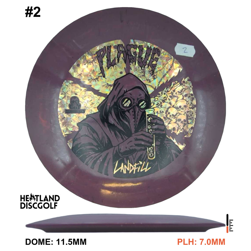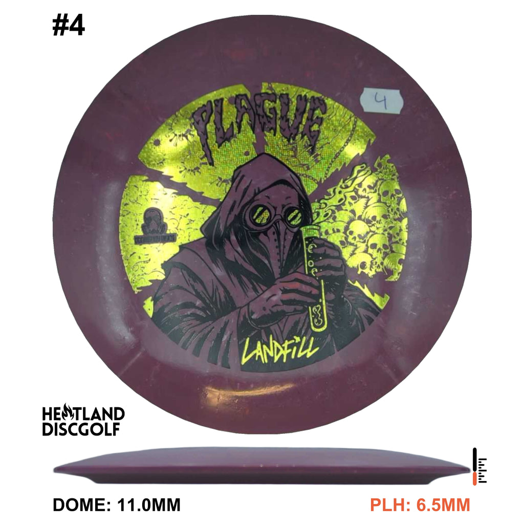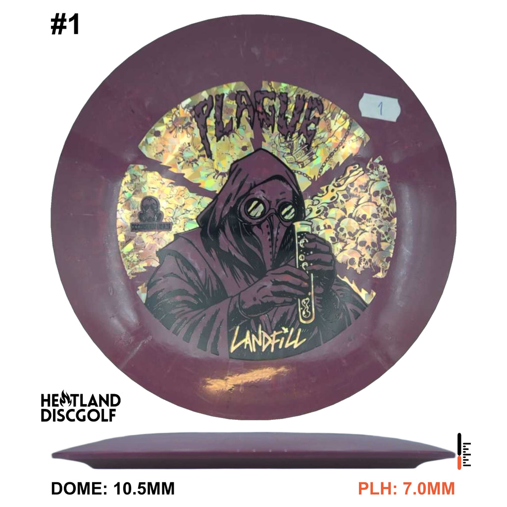 The Doomsday Discs Landfill Plague is a budget-friendly distance driver molded from recycled materials for sustainable performance. Landfill plastic varies slightly in texture but maintains a comfortable grip and consistent overstability. The Doomsday Discs Plague in this blend provides reliable fade and strong stability at an accessible price point.
