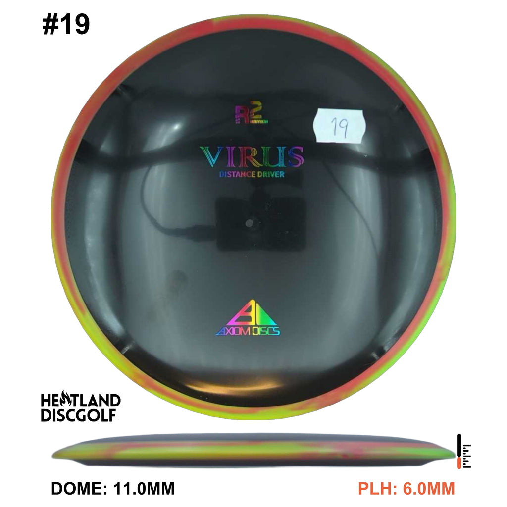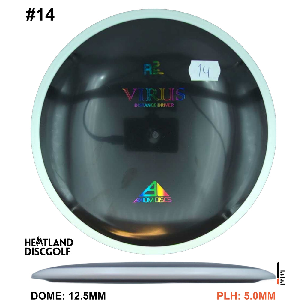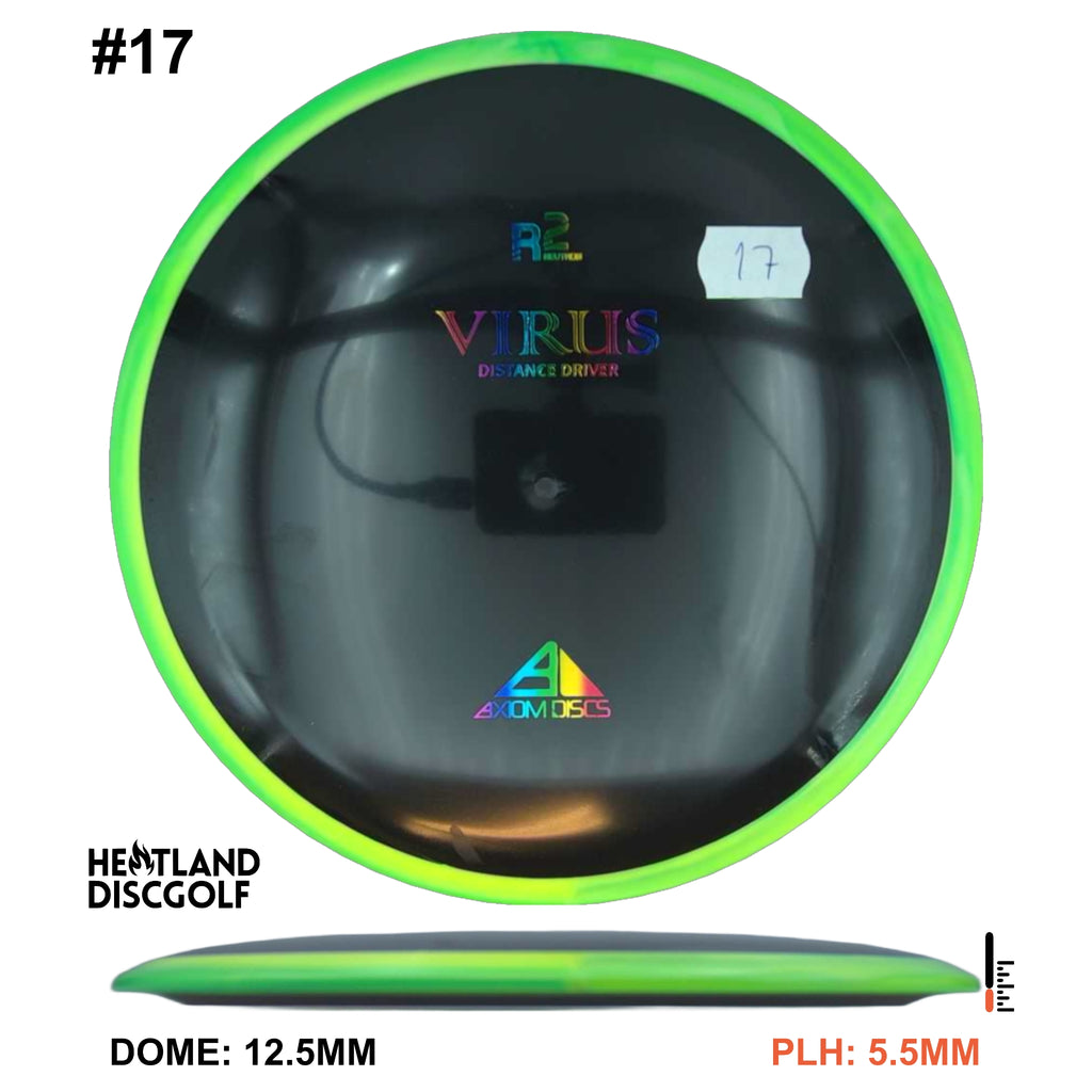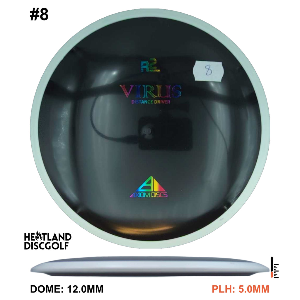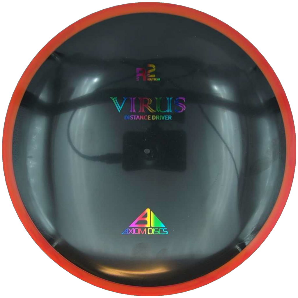 The Virus is Axiom's easiest to throw distance driver, with a glide and responsive understability that keeps it in the air. Power throwers will be able to flex huge turnover shots with straight forward fade. Average throwers will be able to extend and shape lines using the Virus' turn and gentle fade. Compared to the MVP lineup, the Virus resembles a worn-in Impulse.