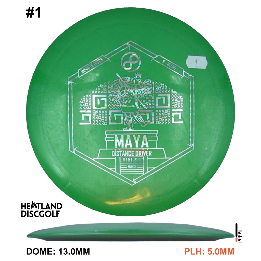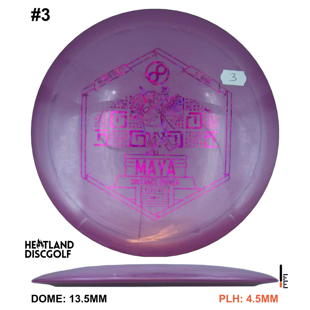 The Maya is an understable distance bomber! Beginner to Intermediate players will find the Maya to be an awesome straight flying distance driver, while advanced to open players will utilize the Maya for massive understable distance shots.