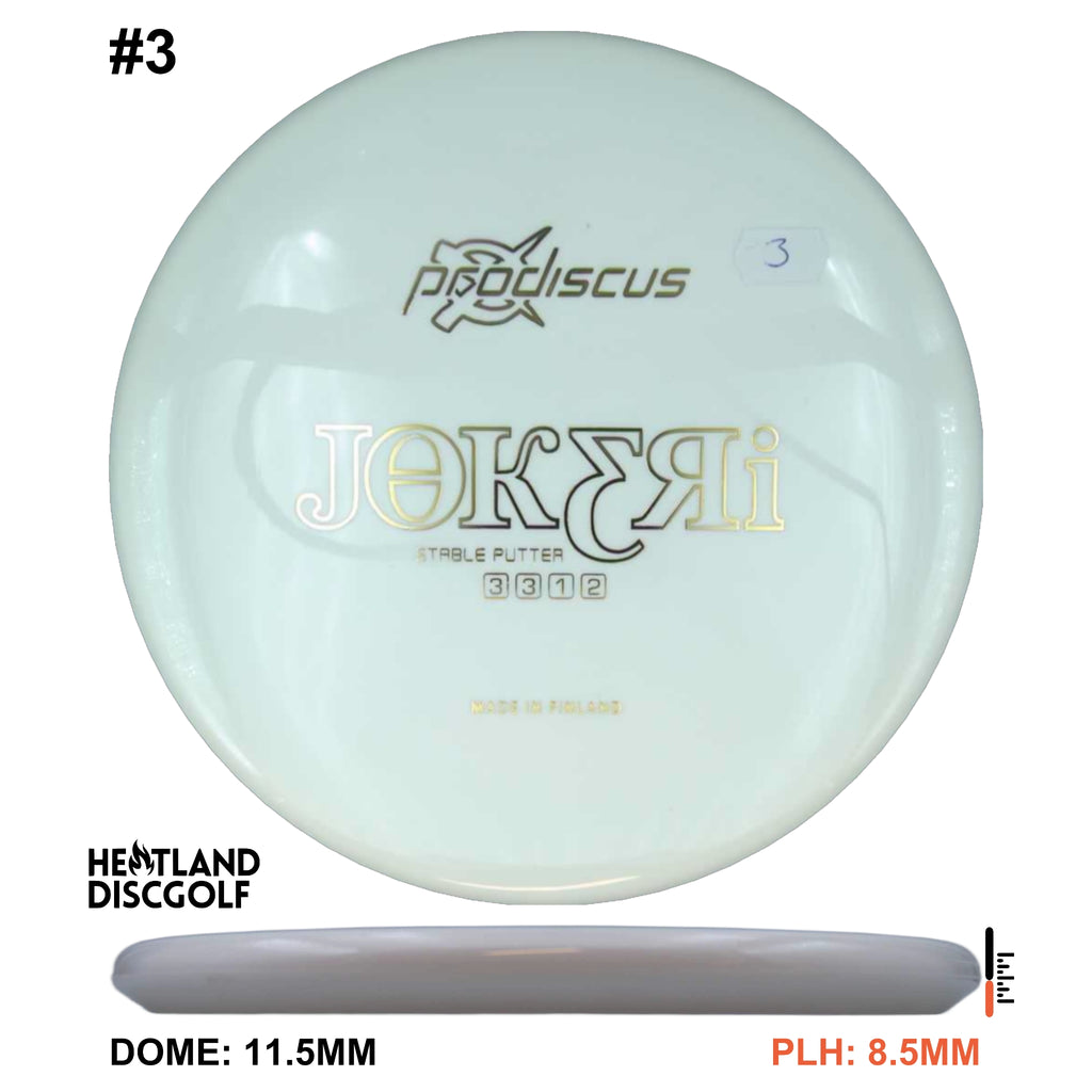 The Jokeri is a popular, highly rated putt & approach disc made by the Finnish disc manufacturer Prodiscus. This is a tall, bulky disc with a flat, almost concave tip. The Jokeri is a very popular disc for short putts as well as long drives. The Prodiscus Jokeri is a reliable, overstable disc that performs very well in windy conditions. This disc is available in both basic and premium plastic.