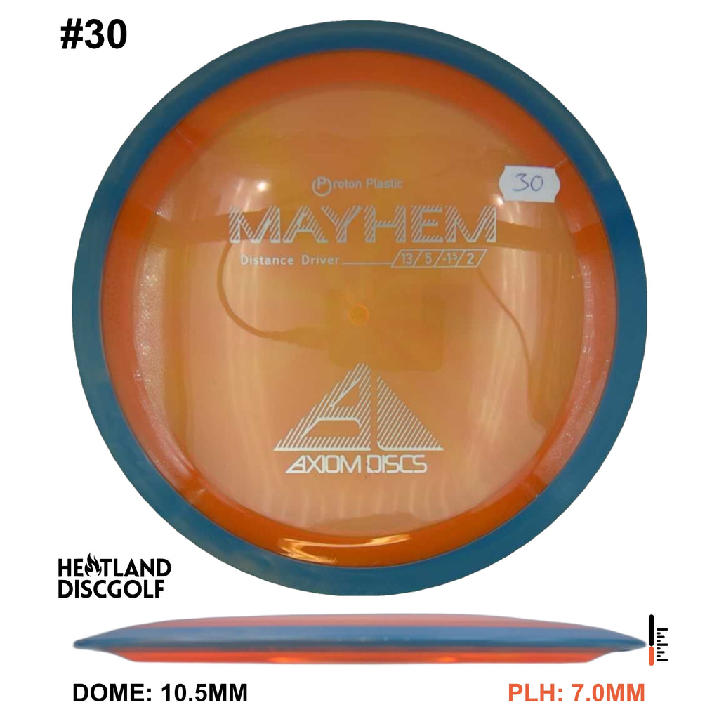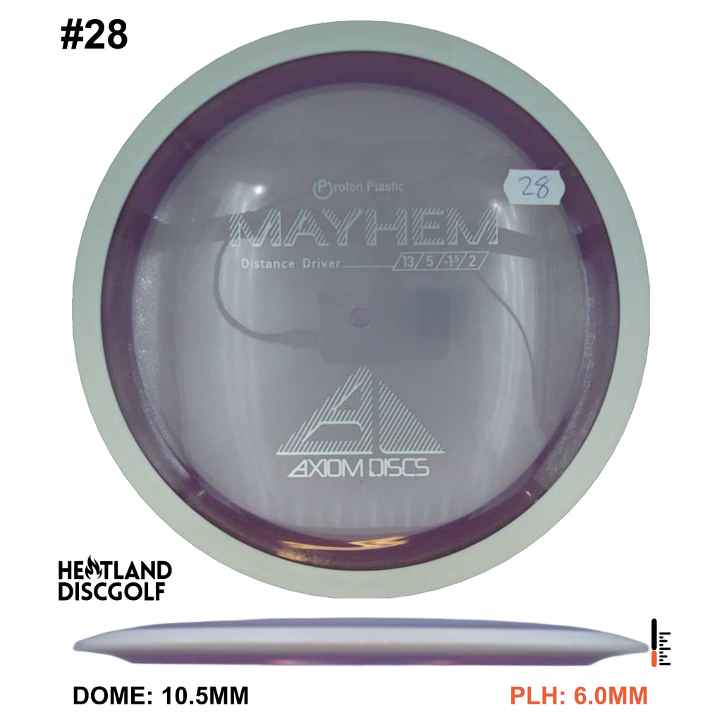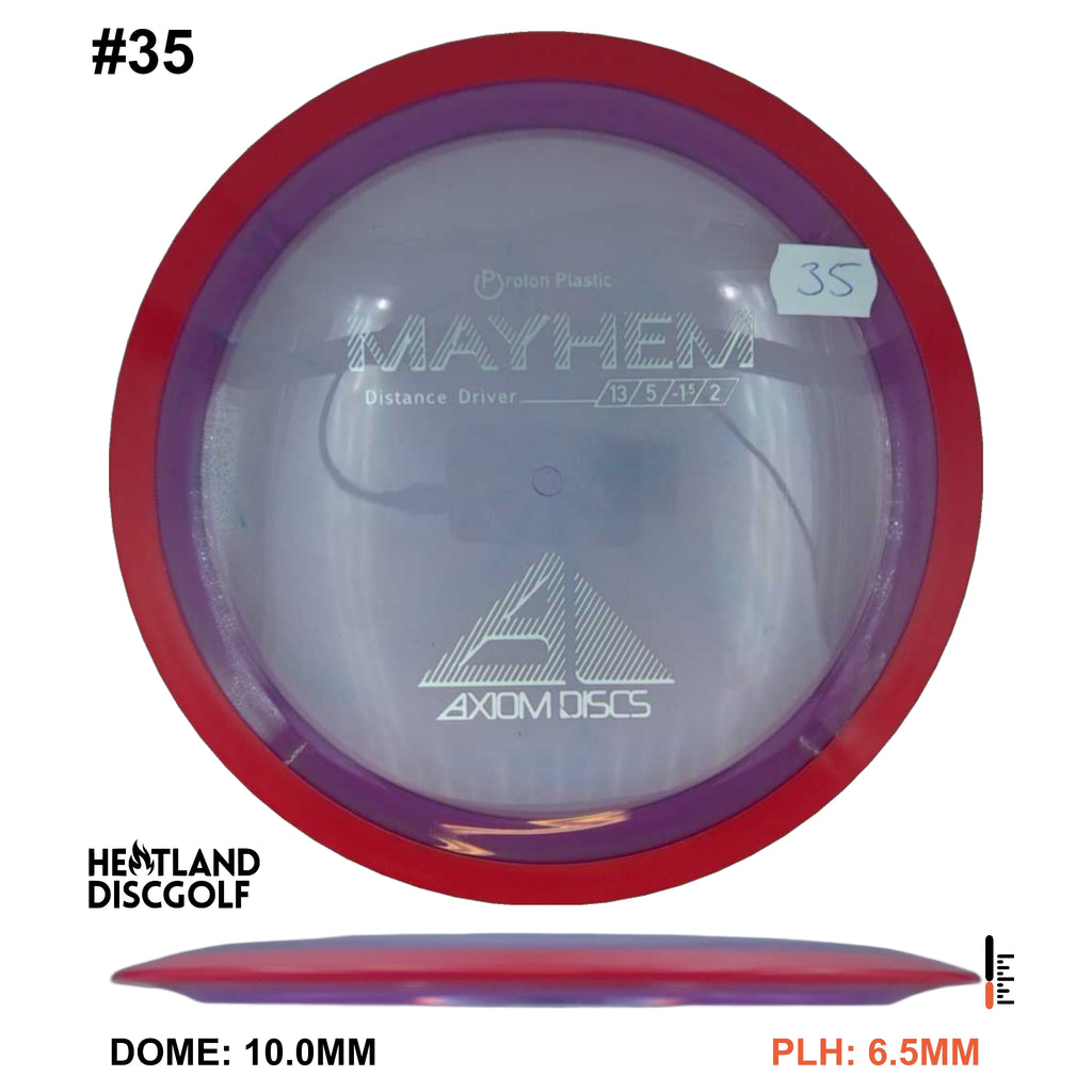 Mayhem has a responsive straight-stable profile and plenty of speed, making it a perfect workhorse driver for many advanced and expert throwers. Like the MVP 23mm class, the Mayhem has a pronounced dome to promote distance-covering glide. Mayhem is best compared to a beat MVP Octane.