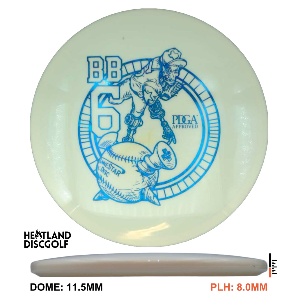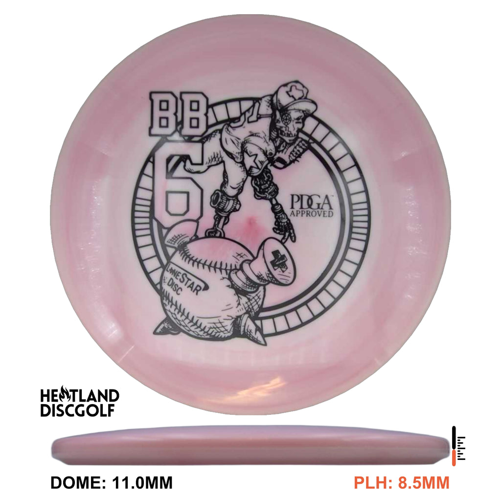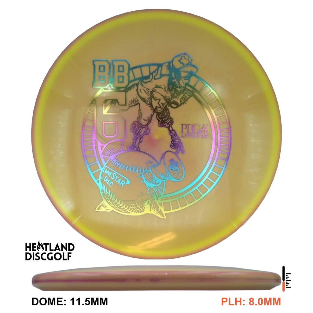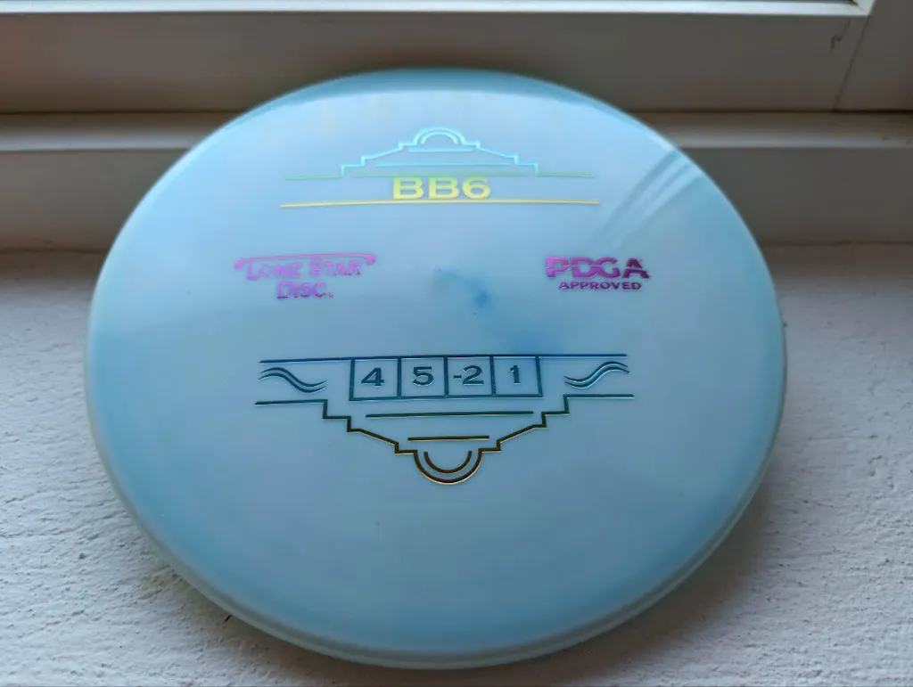 The BB6 is our flagship understable mid. When thrown at mid-to-high speeds, the BB6 has a gradual and predictable turn. Making it the perfect disc for long turnover shots, taking advantage of tailwinds, or riding gentle lines through the woods. The BB6 will produce consistent hyzerflips, taking advantage of the glide that tends to come with Lone Star Disc molds. Players with lower power will love this disc for its straight and natural lines.