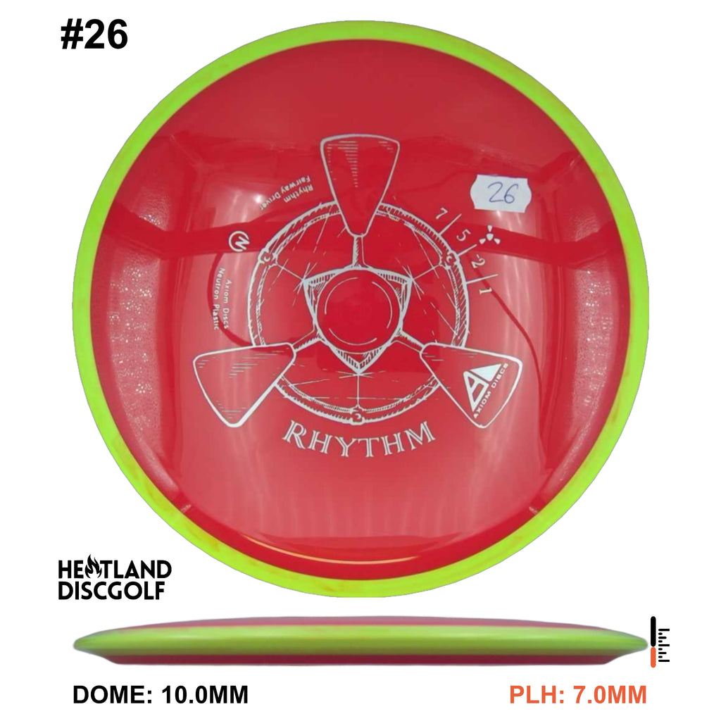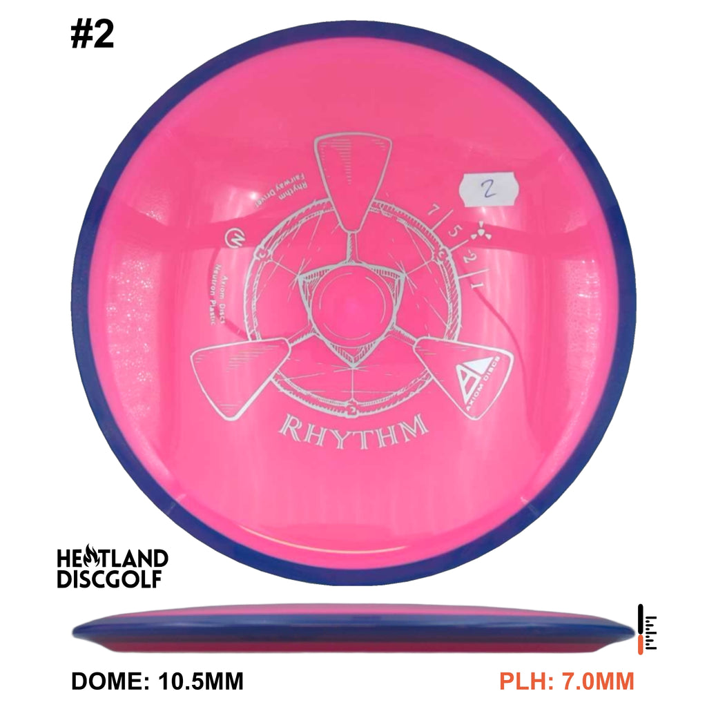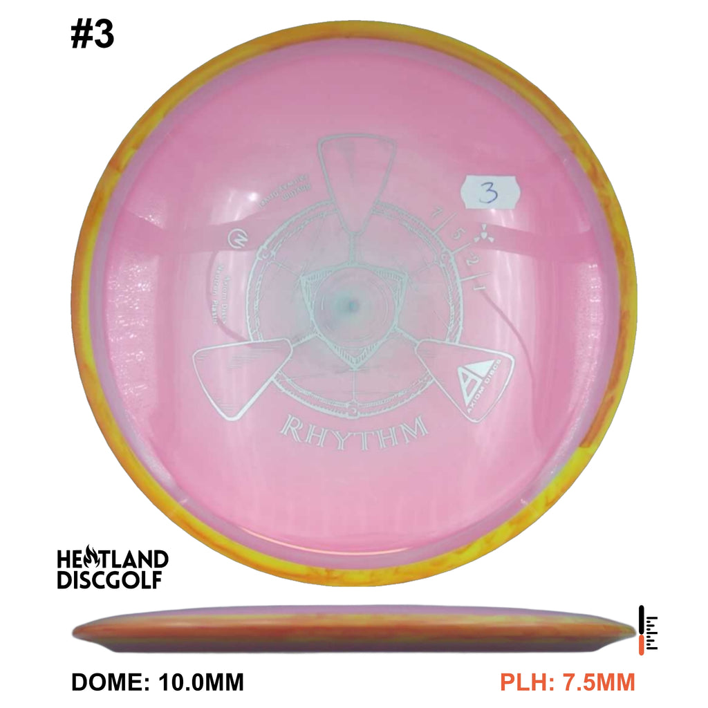 PLEASE WELCOME THE NEXT GREAT UNDERSTABLE DISC FROM AXIOM – THE RHYTHM! WITH A SPEED OF 7, GLIDE OF 5, TURN OF -2, AND A FADE OF 1, THE RHYTHM WAS DESIGNED TO BE EITHER A GREAT FIRST DRIVER OR A LINE SHAPING FAIRWAY DRIVER FOR POWER ARMS.