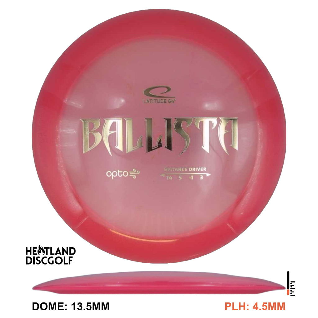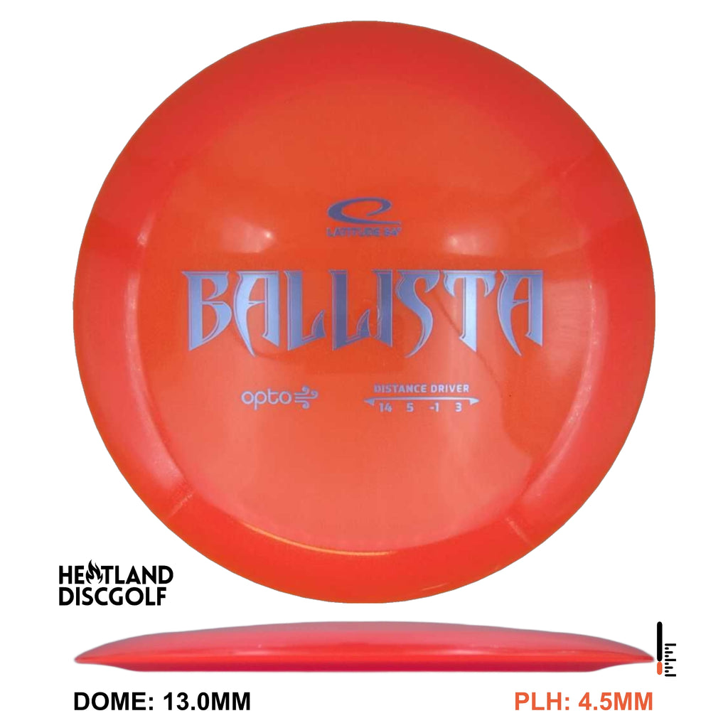 The Latitude 64 Ballista is a fast ultra high speed driver. It is described as "a more understable world" and will exhibit a slight degree of high speed turn for the advanced disc golfer.