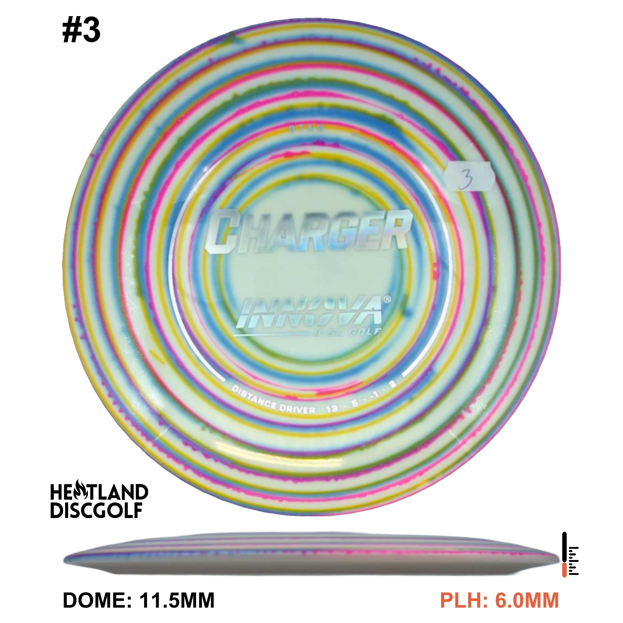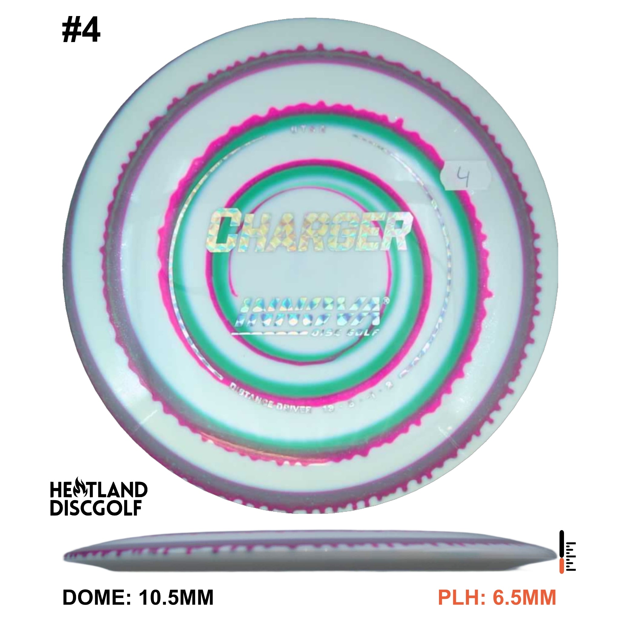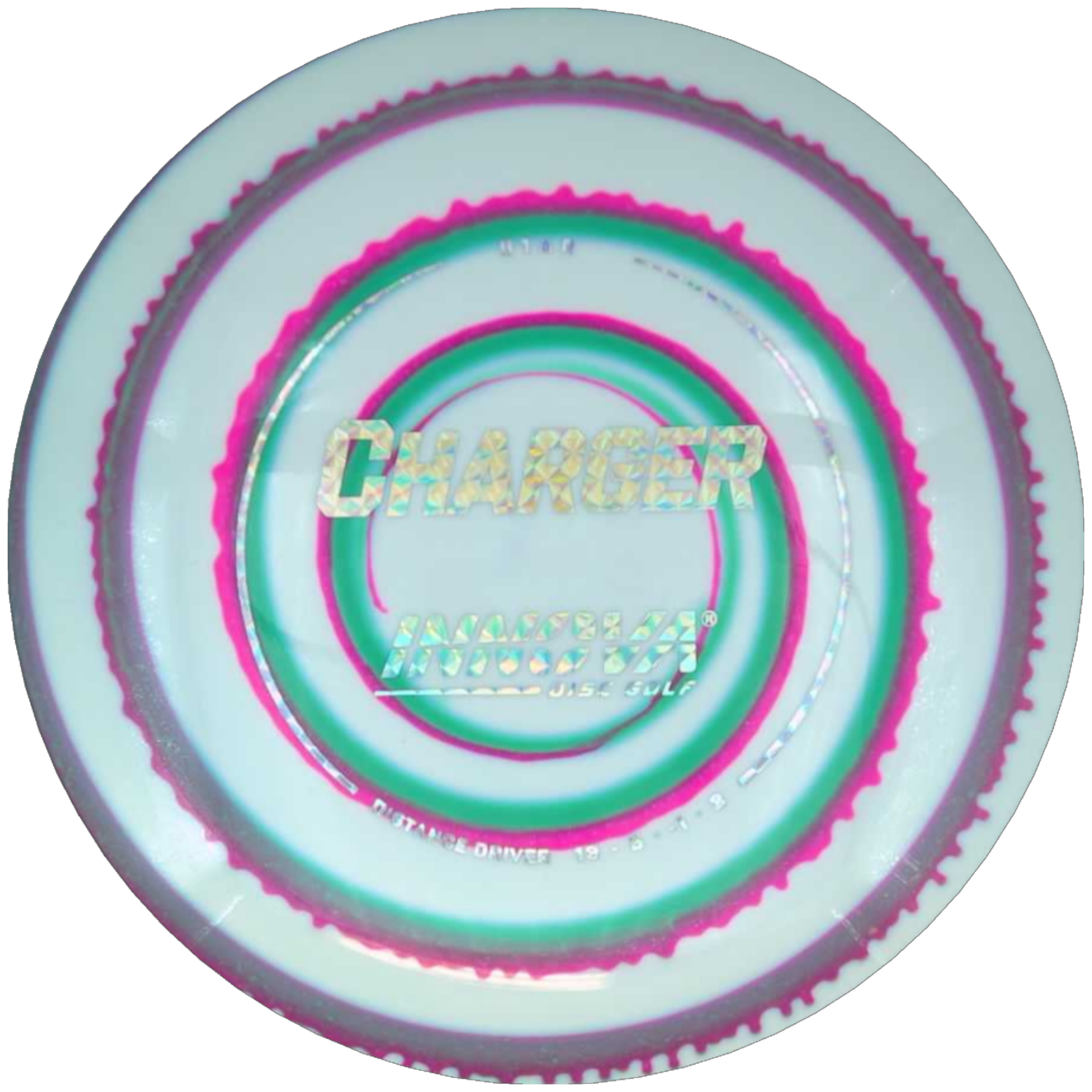The Charger is a straight-finishing, 13-speed driver that can be thrown at full power without worrying about the disc flipping over. The Charger fills a gap between the Destroyer and the Shryke. For players looking for the consistency of the Destroyer with less fade, try the Charger. For those looking for the big distance of the Shryke, but in a disc that can better handle the wind, try the Charger.