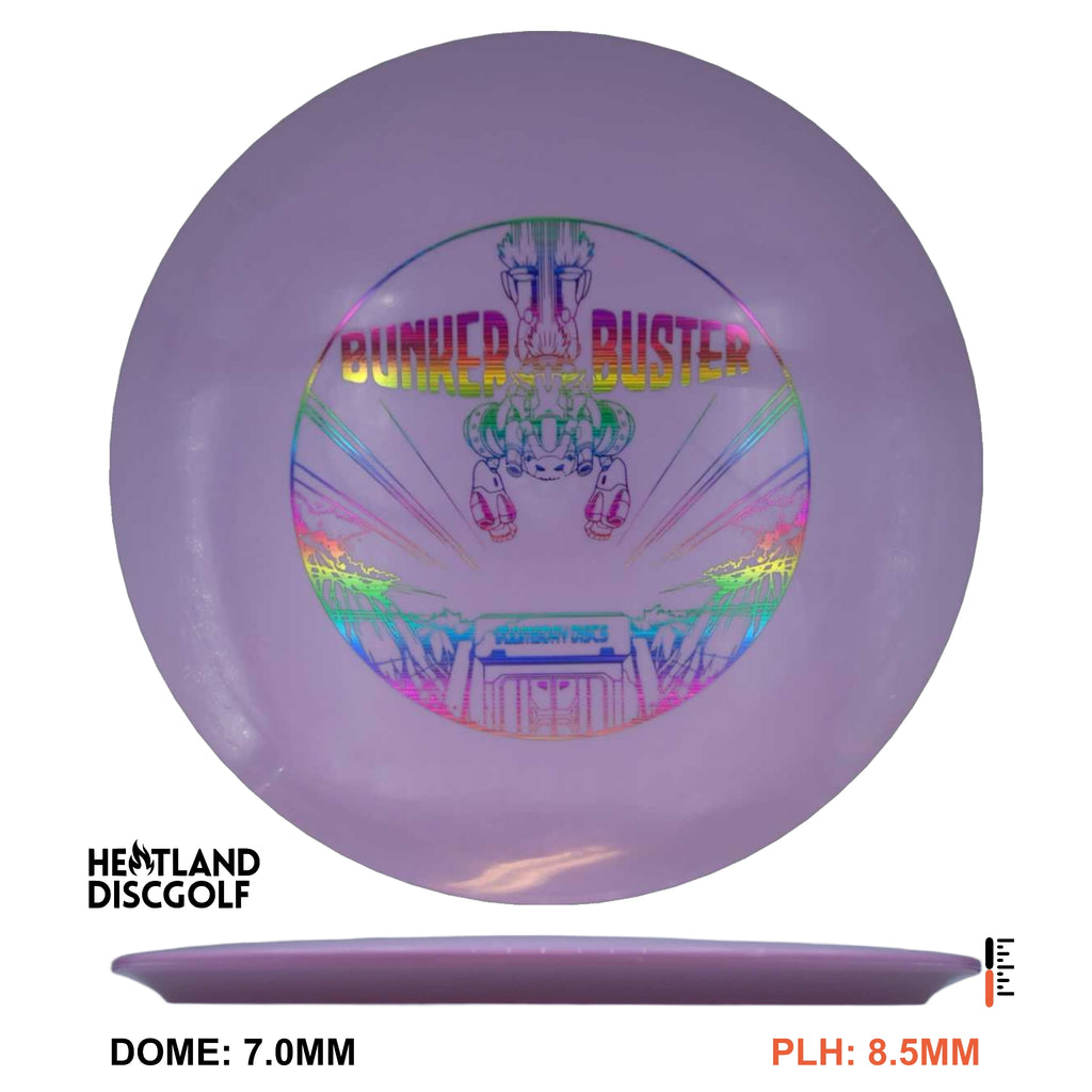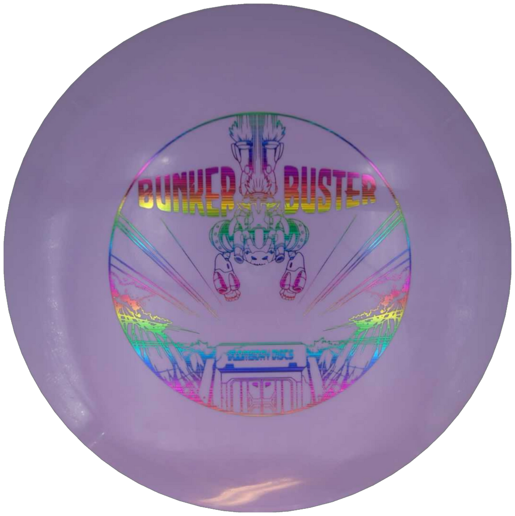 The Bunker Buster is an oversized 7-speed with the same diameter as a Condor or Zephyr and comes in weights ranging from 190-200 Grams. This disc is approved by the PDGA as of 7/31/23. This retooled disc is now more overstable than the prototype. It flies straight with insane glide for most of the flight before presenting a prounced end-fade. It can handle power and is extremely dependable for controlled thows across the fairway.