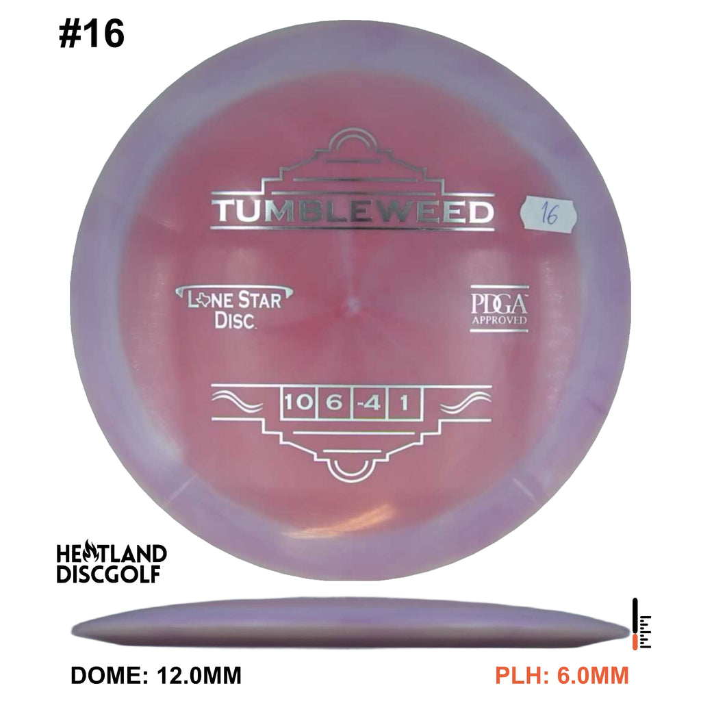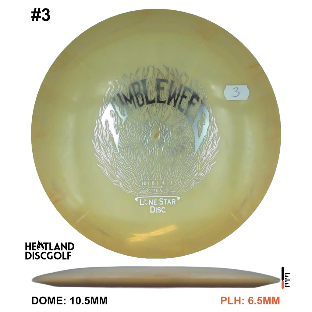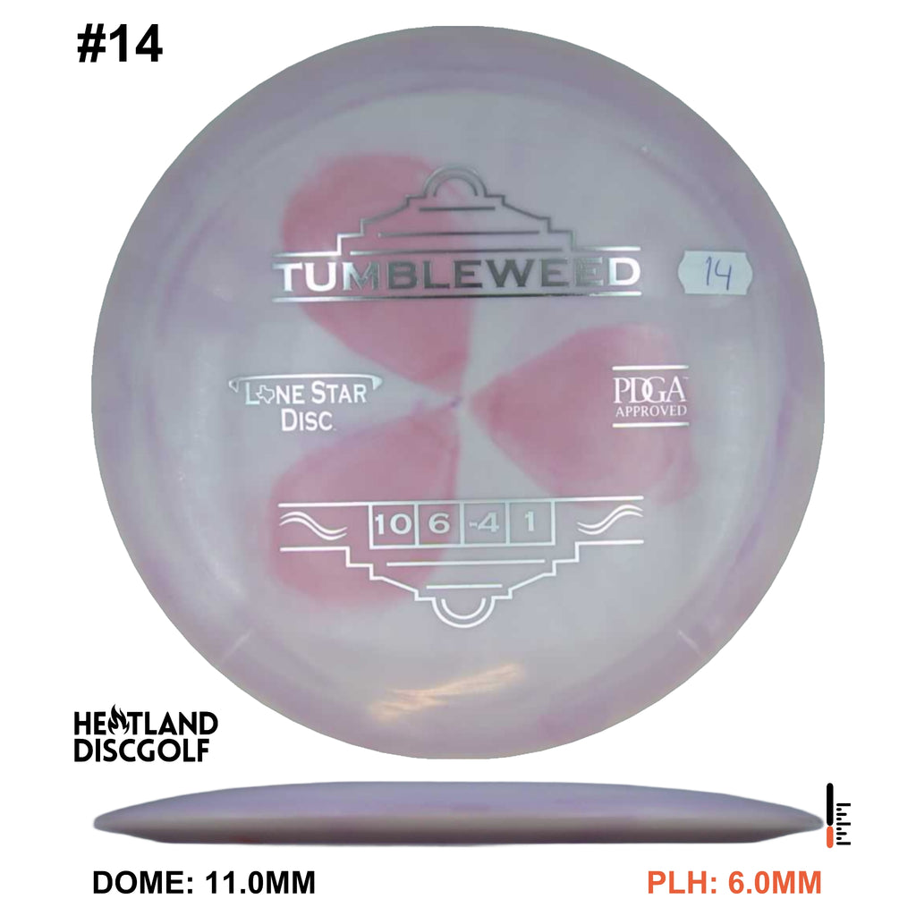 The Tumbleweed is our most understable distance driver to date. Easy to use, easy to grip, and easy distance make this driver the ideal candidate for anyone looking for roller lines, big anhyzer flex shots, or for tailwind shots.t.