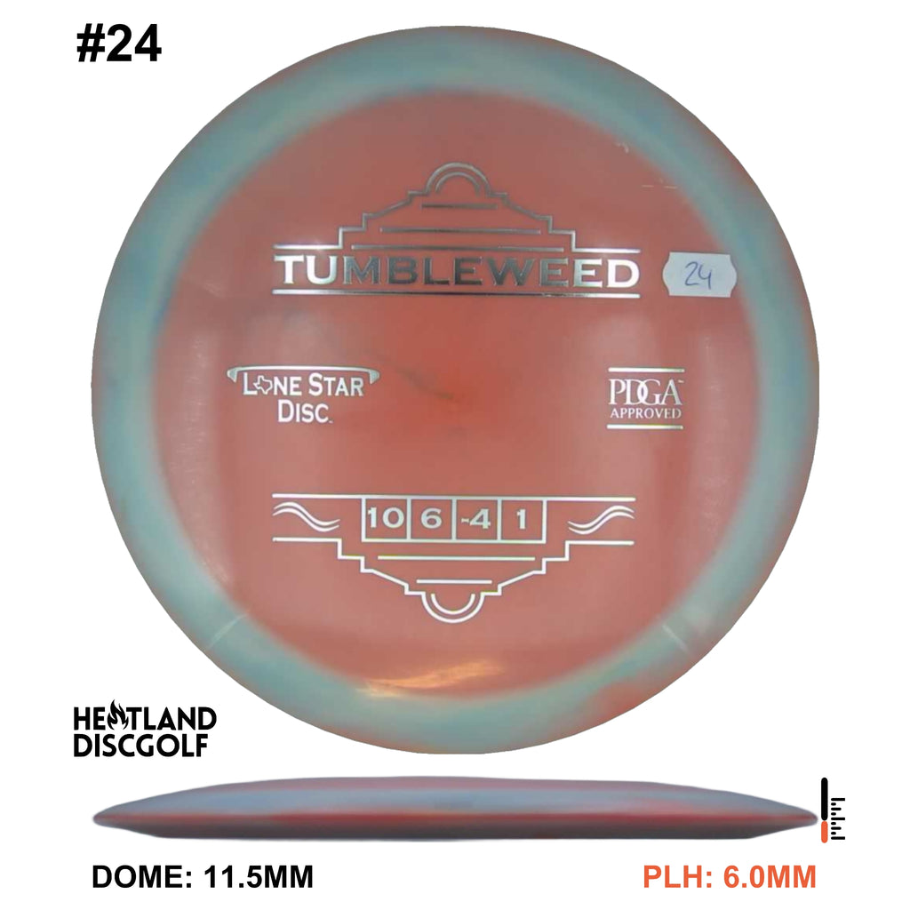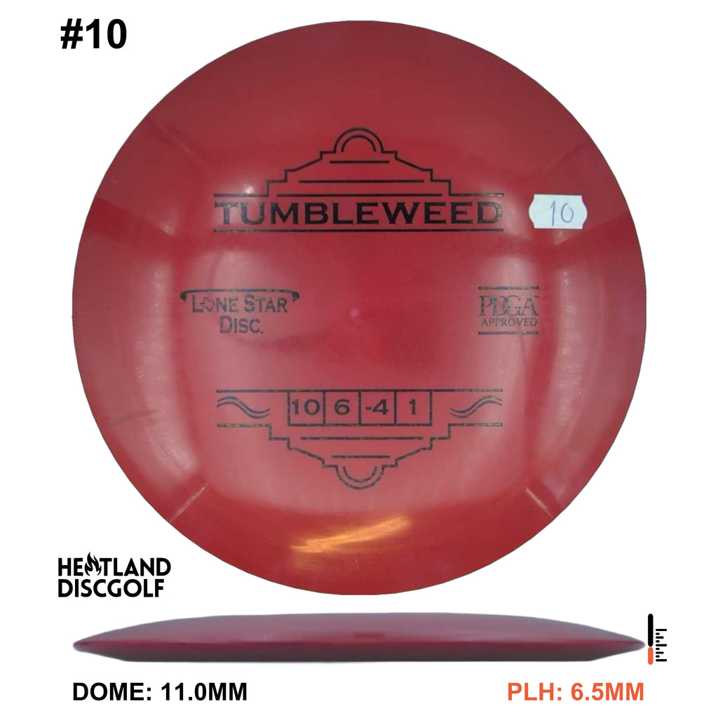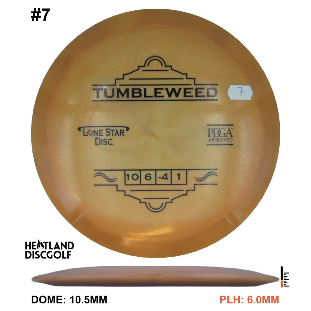 The Tumbleweed is our most understable distance driver to date. Easy to use, easy to grip, and easy distance make this driver the ideal candidate for anyone looking for roller lines, big anhyzer flex shots, or for tailwind shots.t.