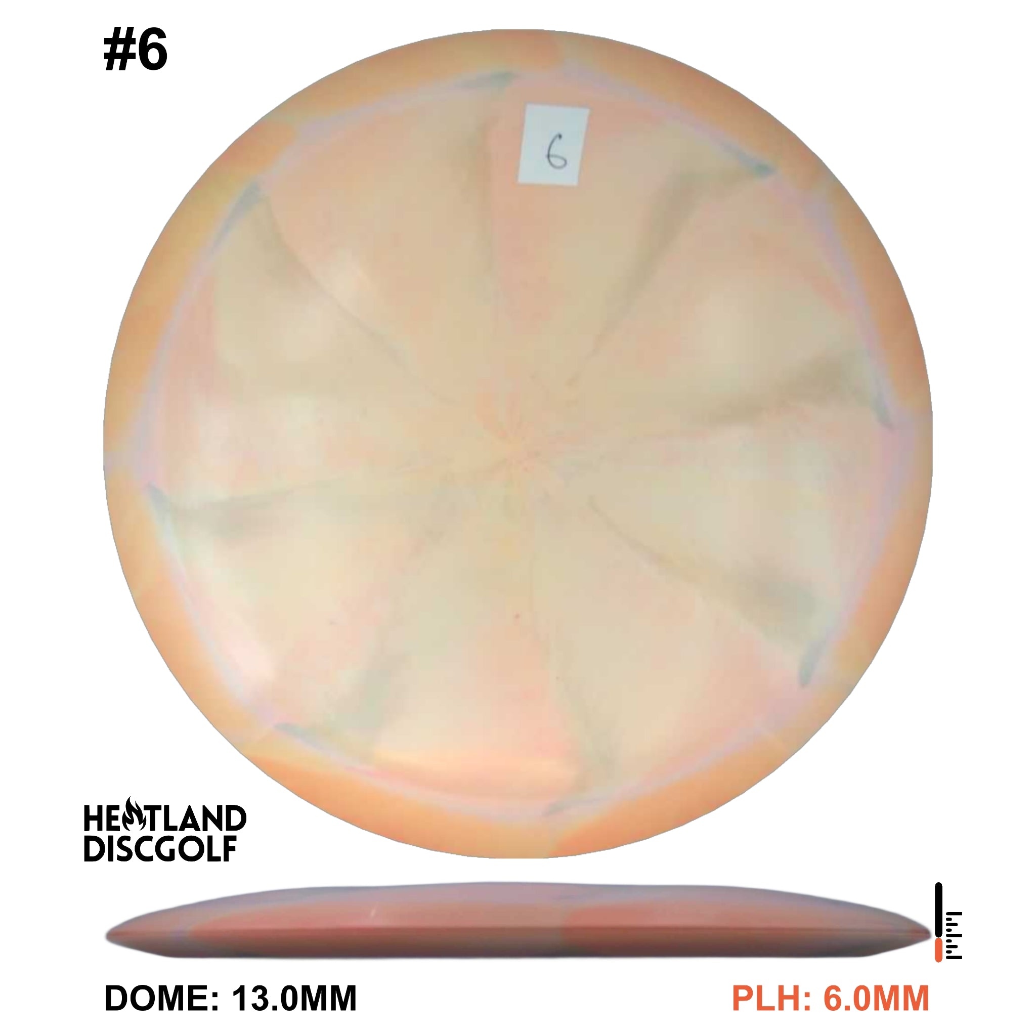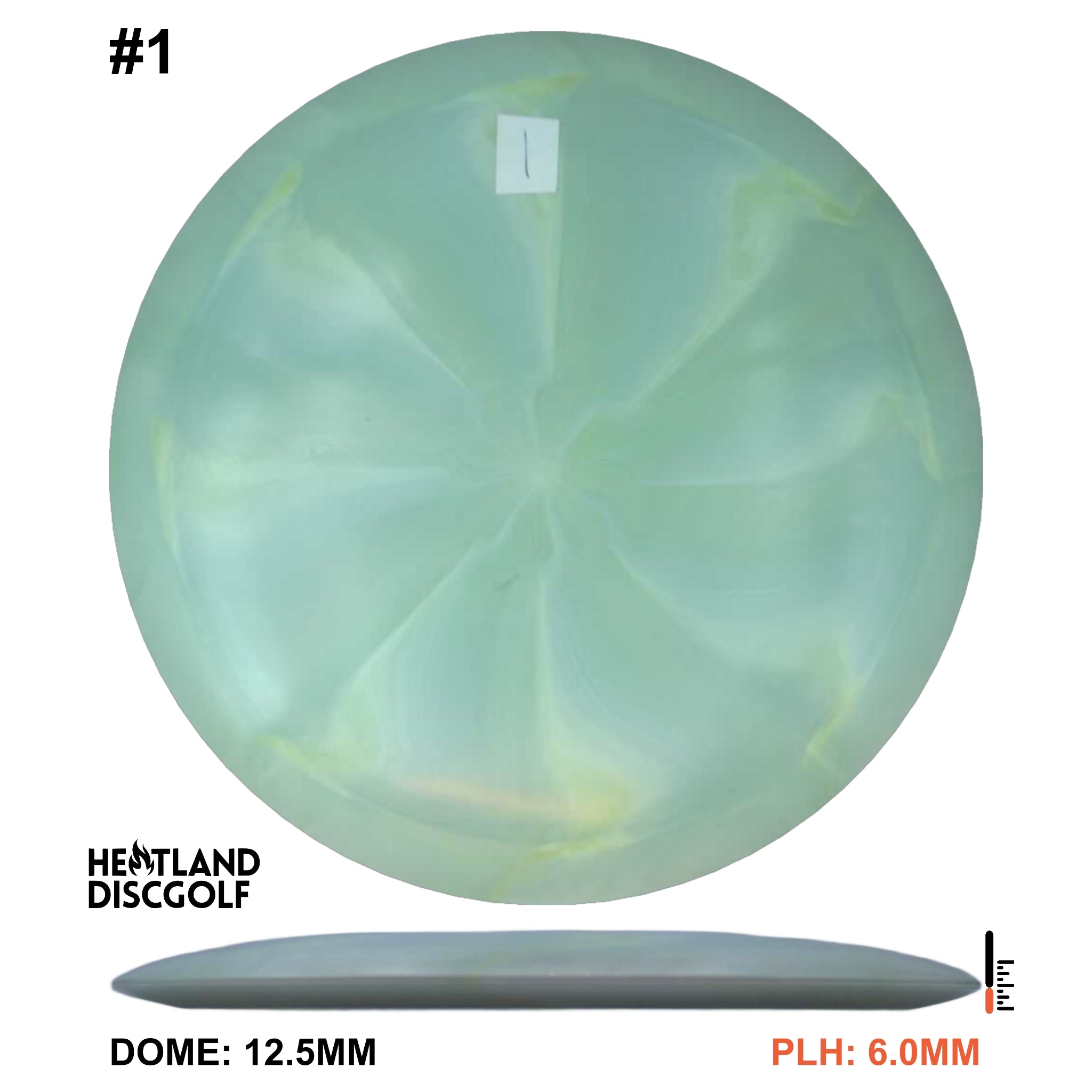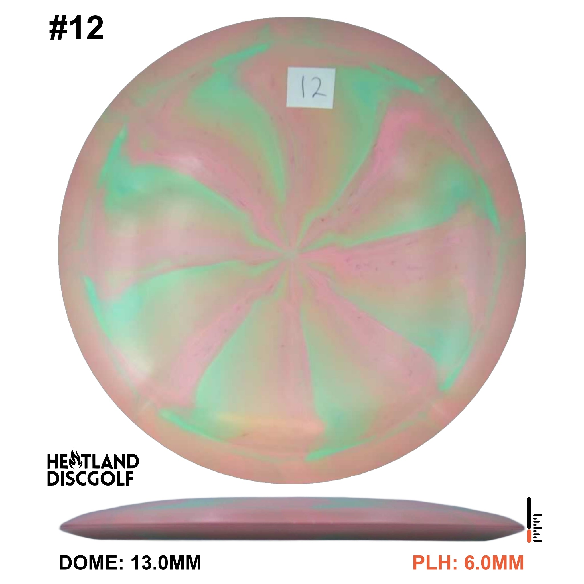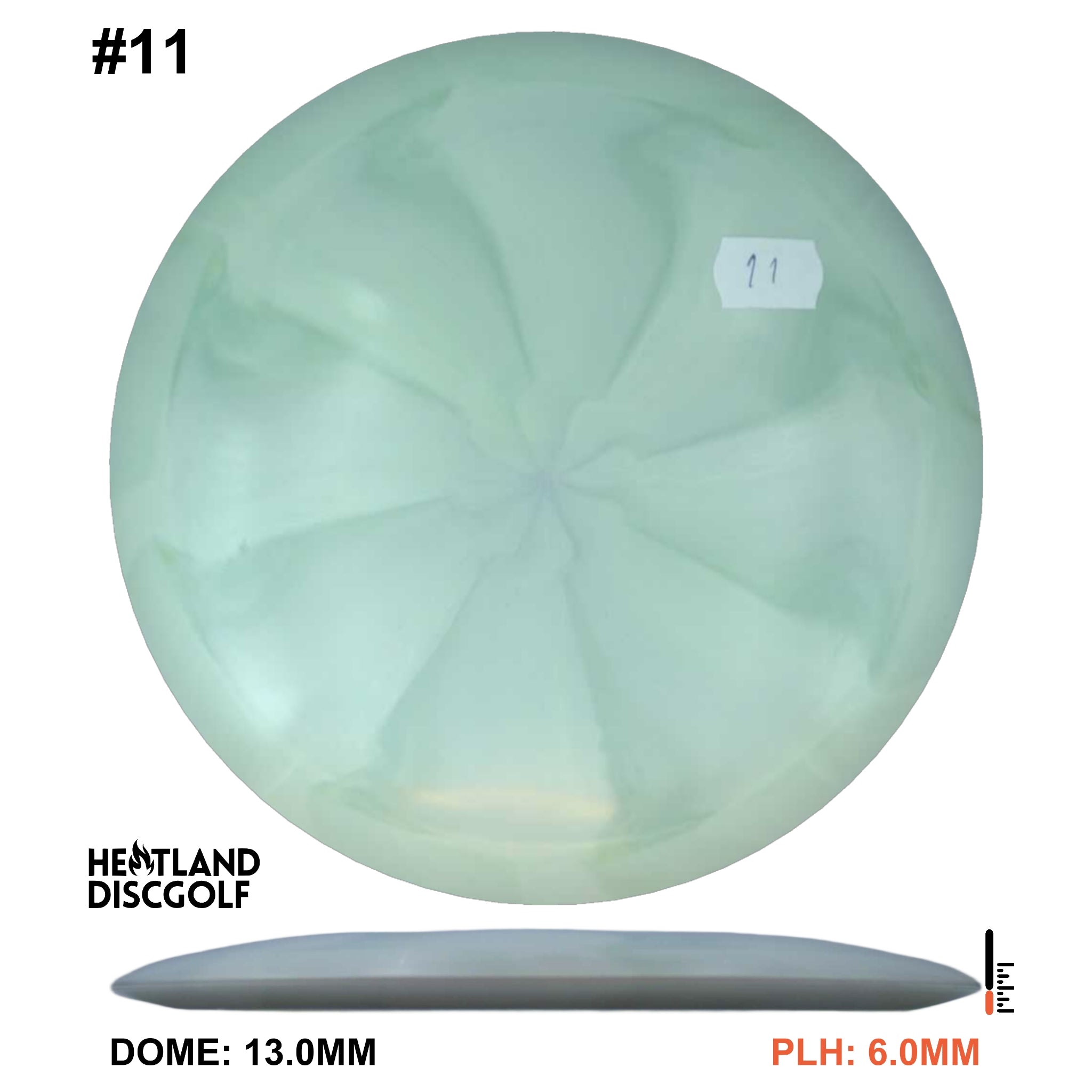 The Heat is an understable Discraft fairway driver that is great for long turnovers in the woods, big rollers in the open or hyzer flip shots. These Uli Heats have a bottom stamp with the Uli shield logo and were run in ESP Swirl plastic.