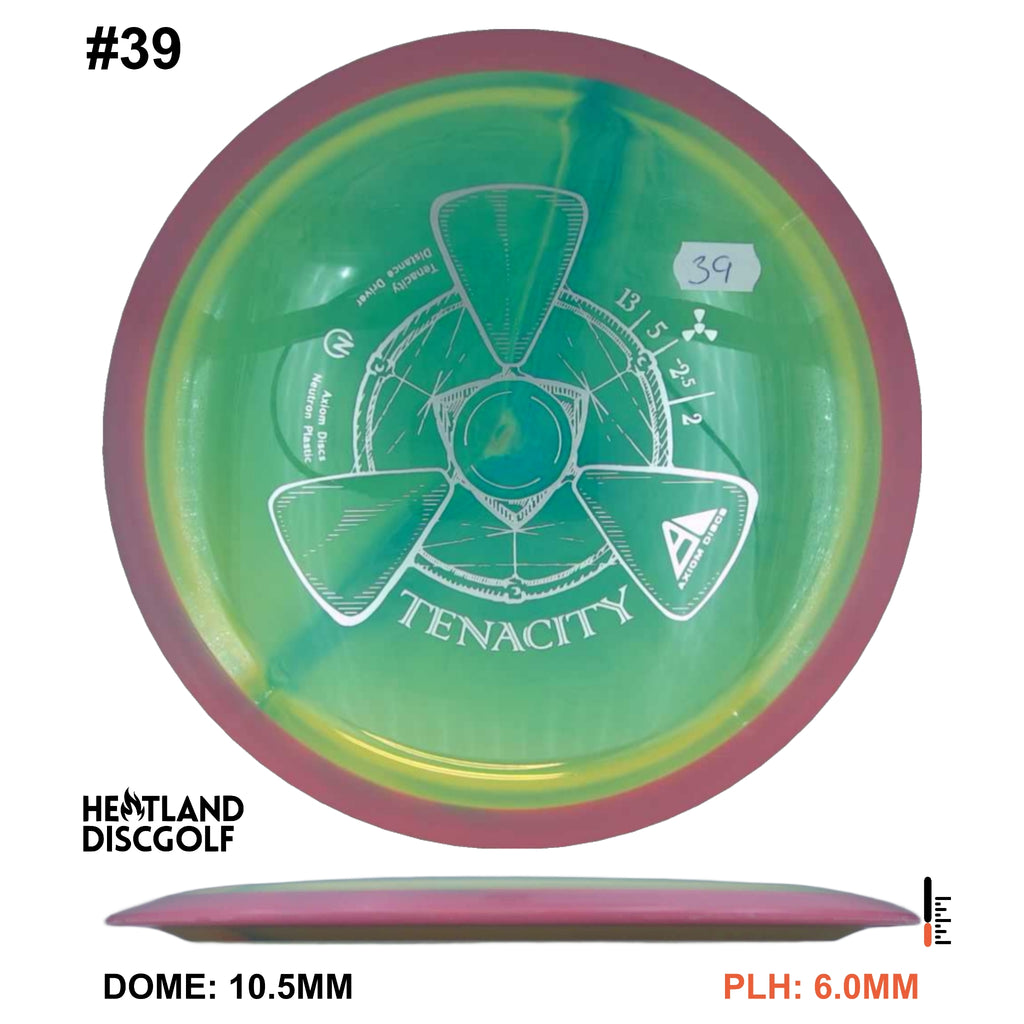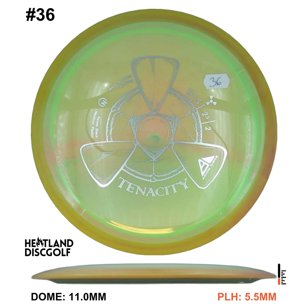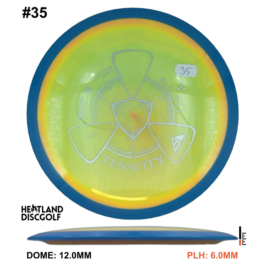 The Tenacity is Axiom Discs understable bomber in the 23mm class drivers. Axiom describes the Tenacity as "sneaky long", with an understable flight path. This disc is a step more understable than the Mayhem.