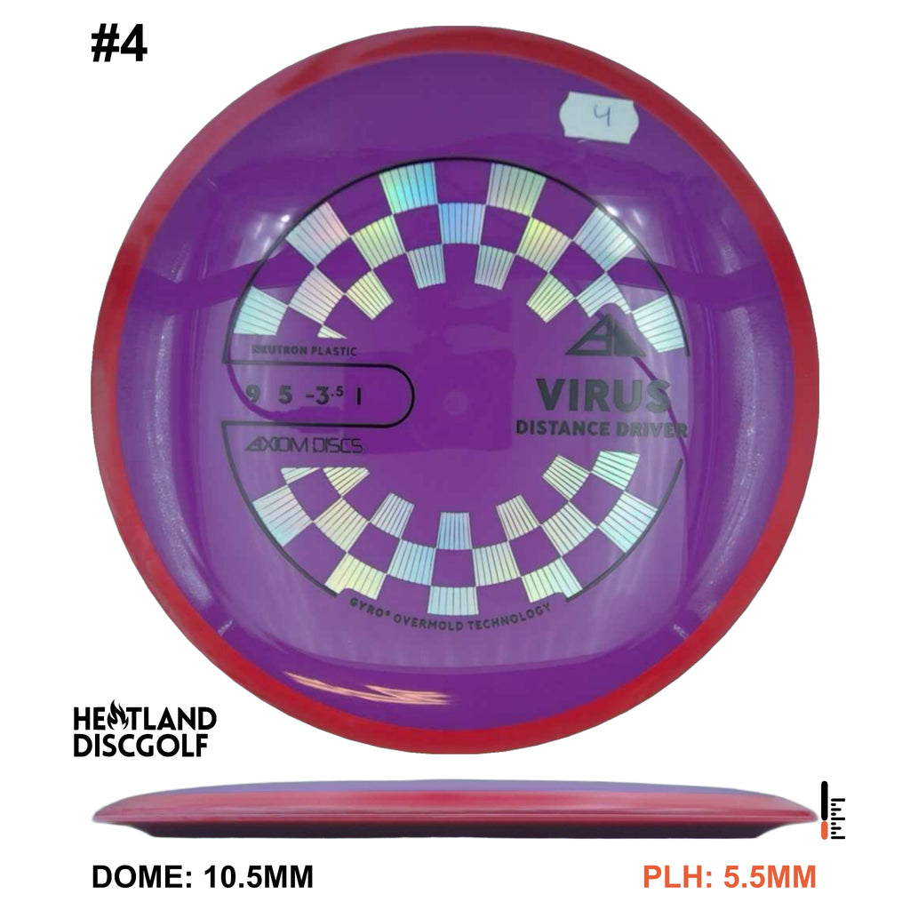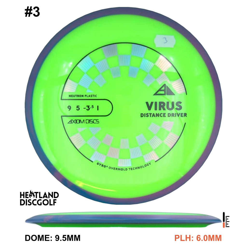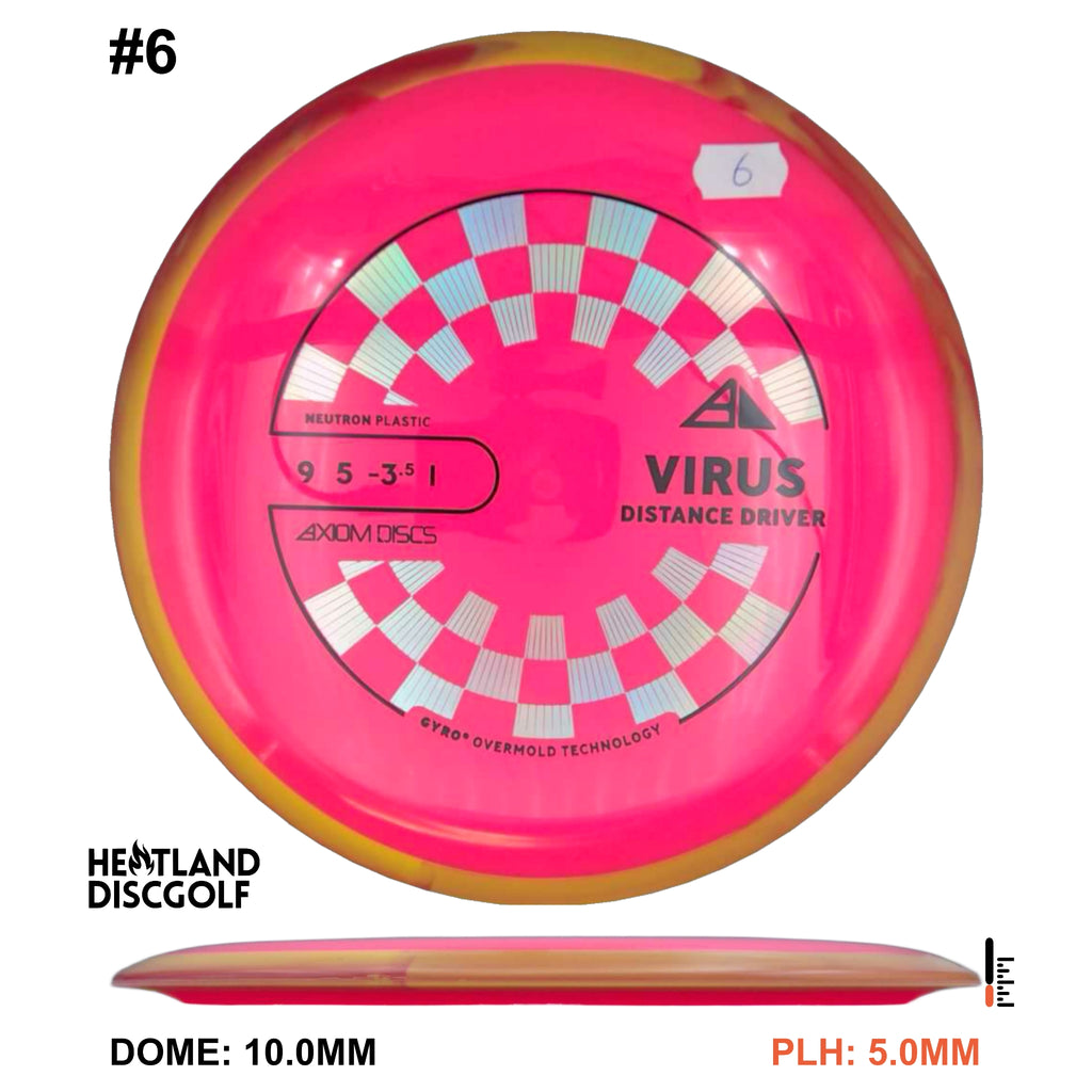 The Virus is Axiom's easiest to throw distance driver, with a glide and responsive understability that keeps it in the air. Power throwers will be able to flex huge turnover shots with straight forward fade. Average throwers will be able to extend and shape lines using the Virus' turn and gentle fade. Compared to the MVP lineup, the Virus resembles a worn-in Impulse.