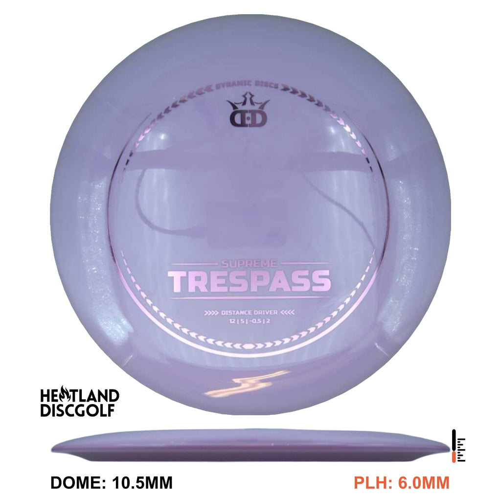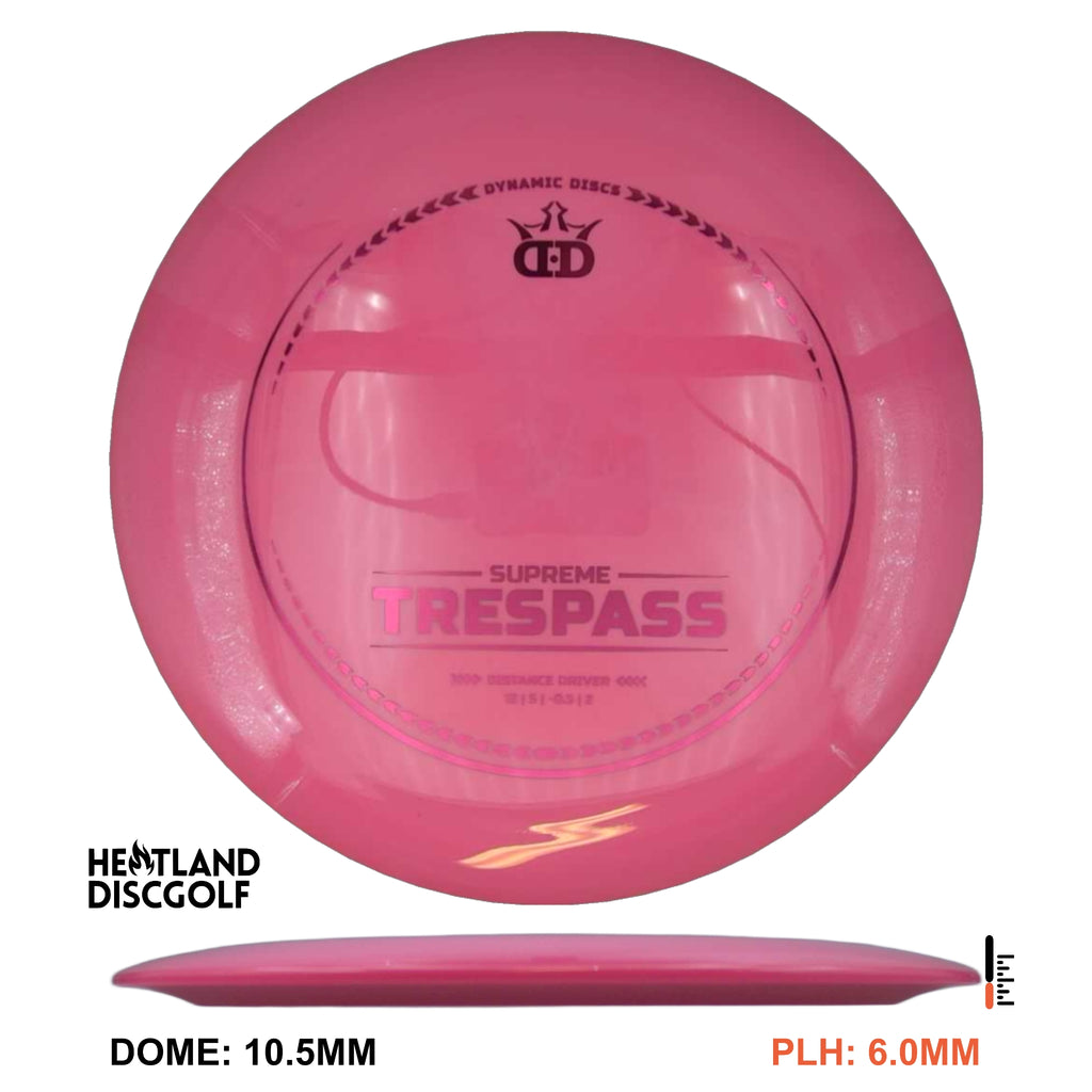 The Dynamic Discs Supreme Trespass is a top-of-the-line high-speed driver for disc golf enthusiasts. This disc incorporates the superior quality of the Supreme Series with the advanced NexEdge and NexFeel technologies from Latitude 64, resulting in a smooth, seamless feel on the bottom and outer parts of the rim. The Trespass is designed to have a balanced flight path, making it easy for players of all skill levels to control. With its wide rim, it can handle high power throws and glide effortlessly through the air, allowing you to conquer new distances and clear obstacles with ease. If you're looking for a premium disc golf disc that will elevate your game, the Supreme Trespass is a must-have.