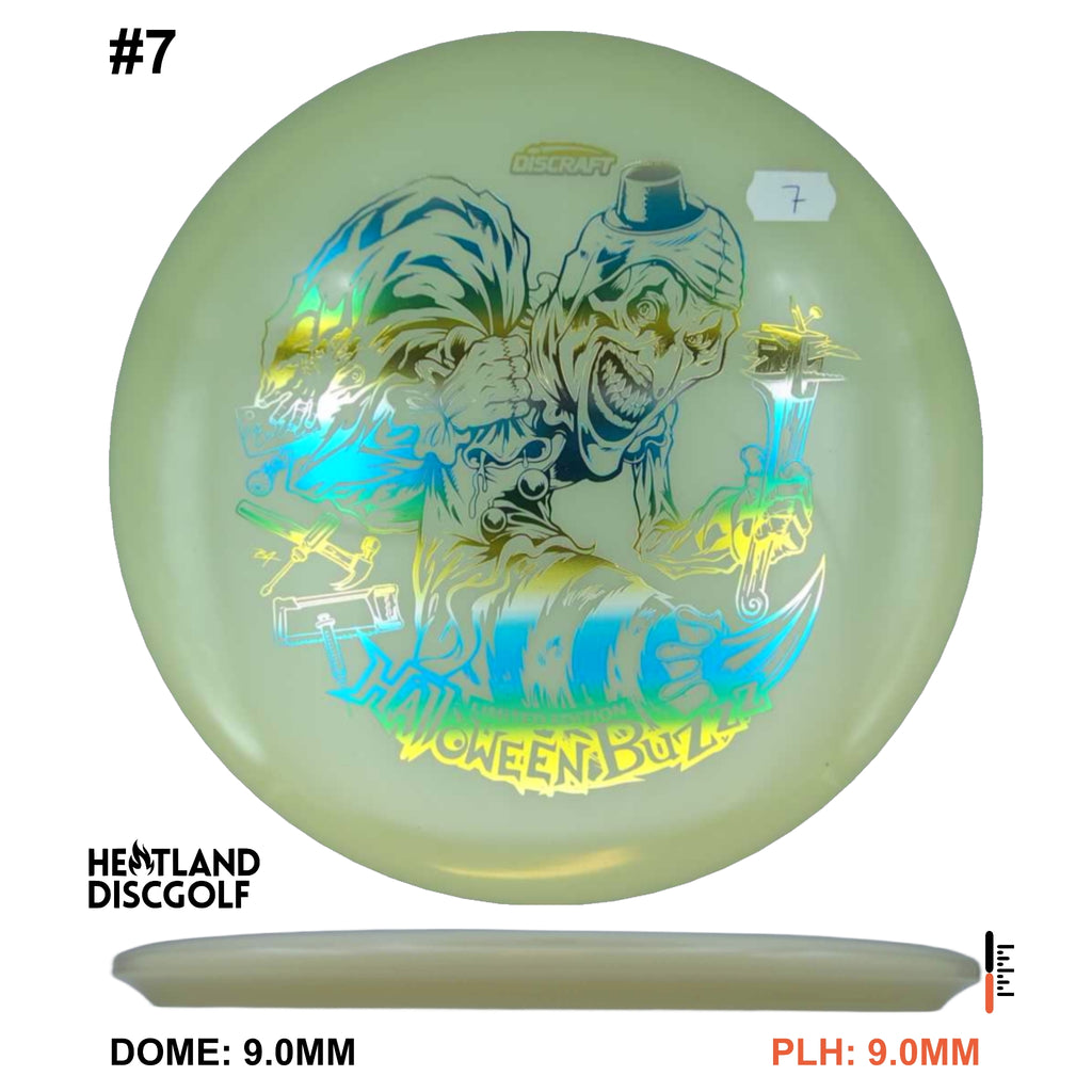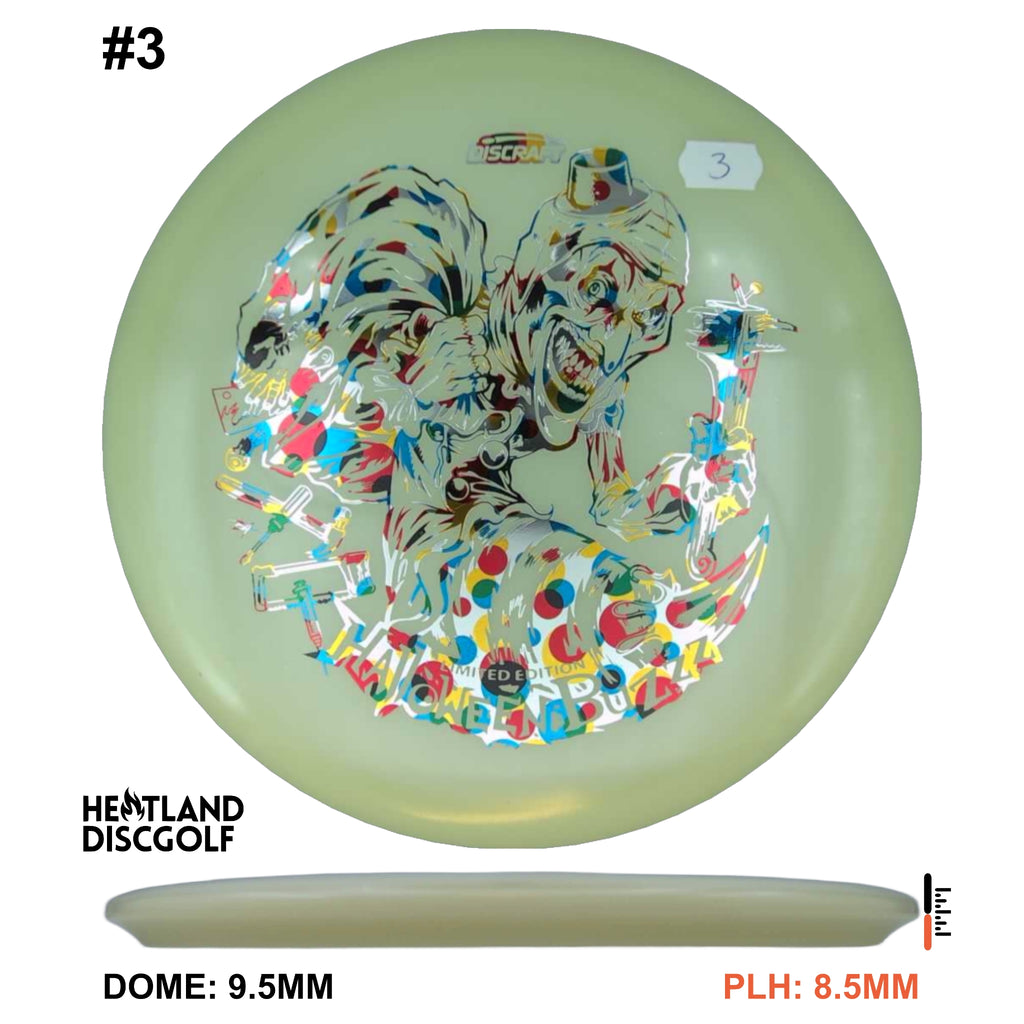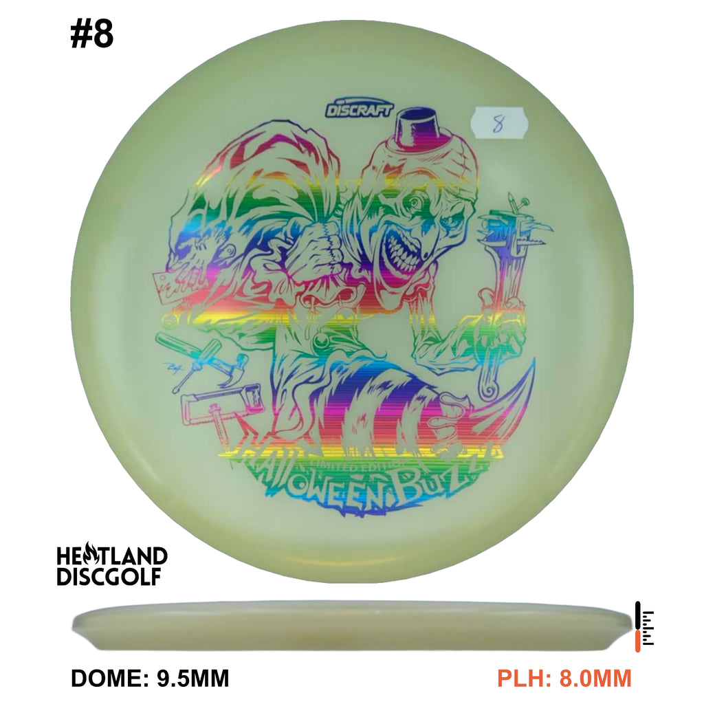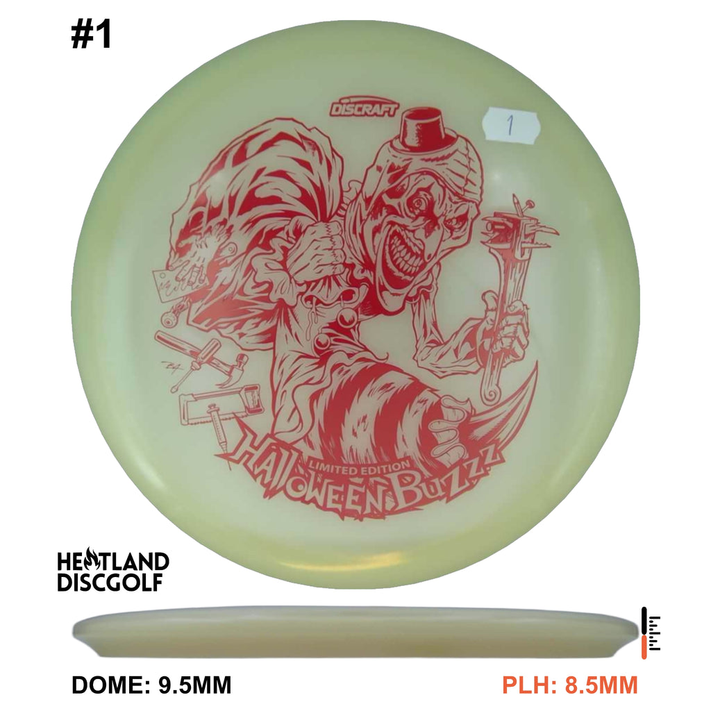 The Single-Foil Mega-Glo Halloween Buzzz turns darkness into its stage. Made from our popular Mega-Glo blend, this disc shines brighter and longer than any glow disc we’ve ever made. A minimalist single-foil stamp lets the unsettling clown artwork glow through the night—perfect for glow leagues or collectors seeking the most luminous Halloween Buzzz to date!