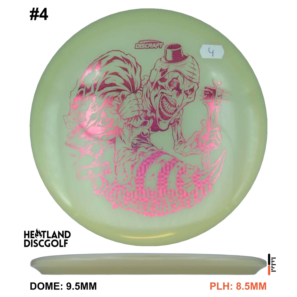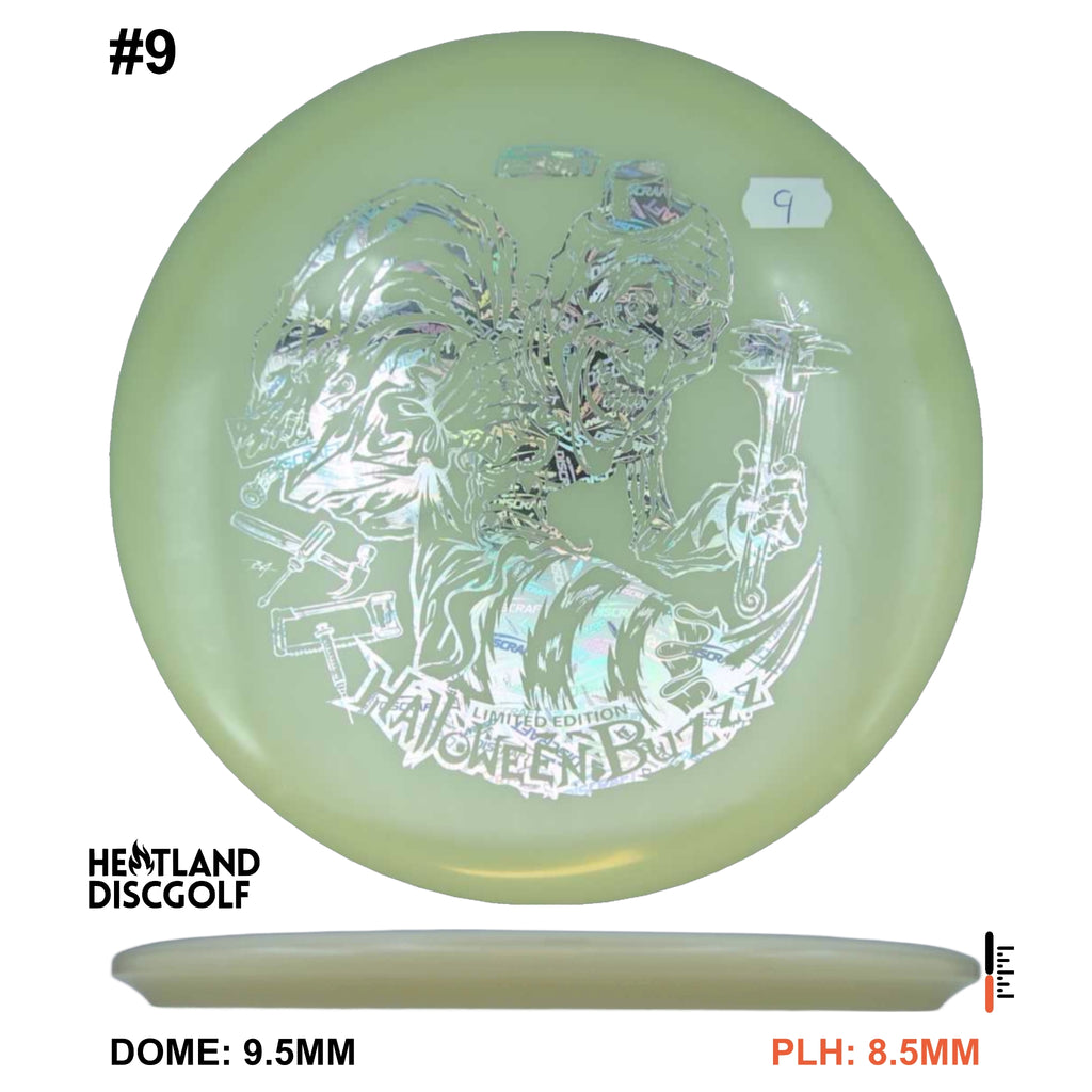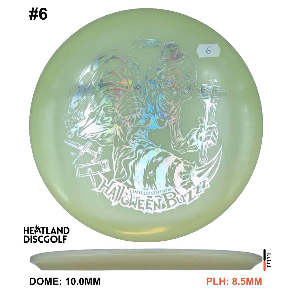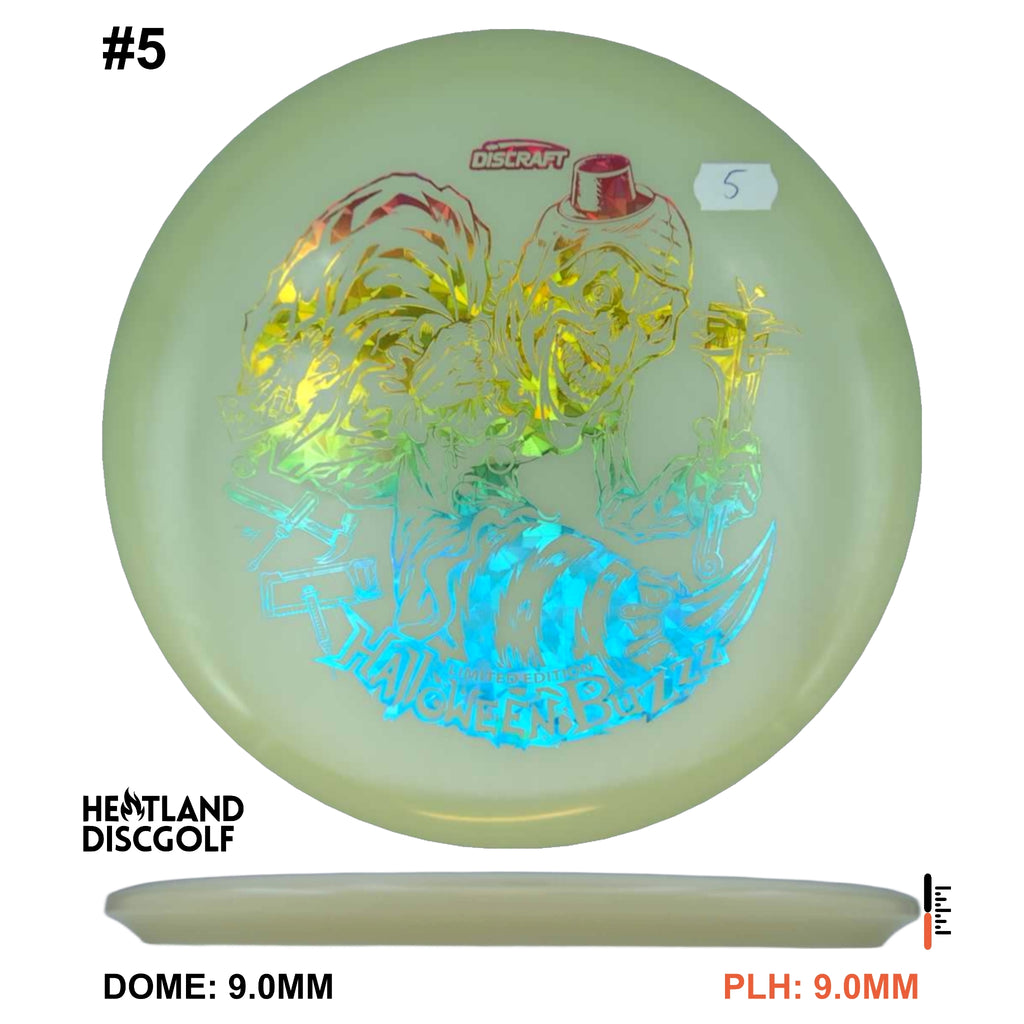 The Single-Foil Mega-Glo Halloween Buzzz turns darkness into its stage. Made from our popular Mega-Glo blend, this disc shines brighter and longer than any glow disc we’ve ever made. A minimalist single-foil stamp lets the unsettling clown artwork glow through the night—perfect for glow leagues or collectors seeking the most luminous Halloween Buzzz to date!