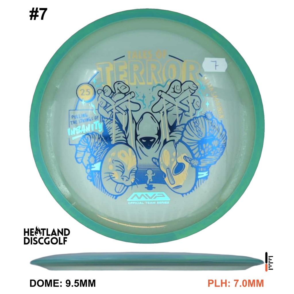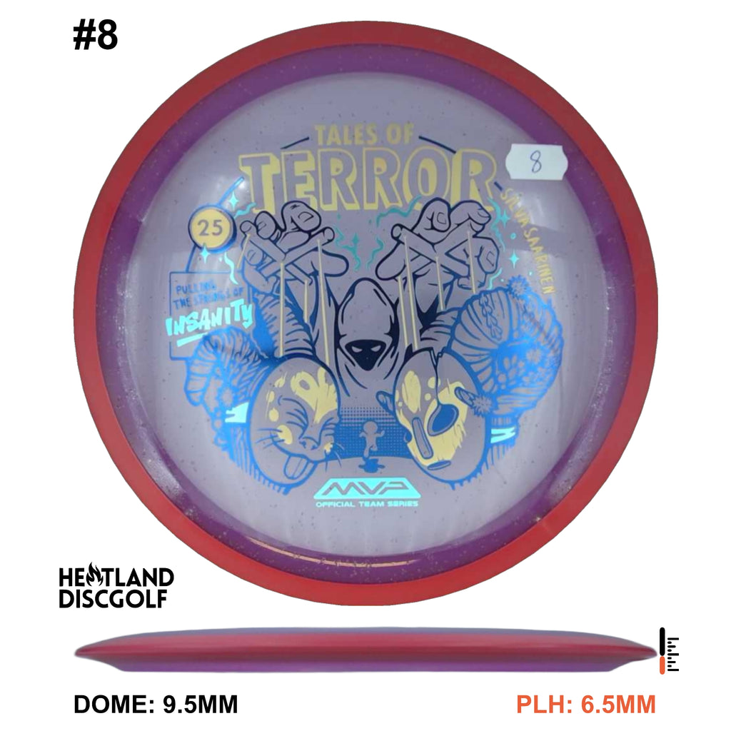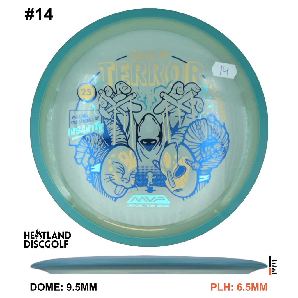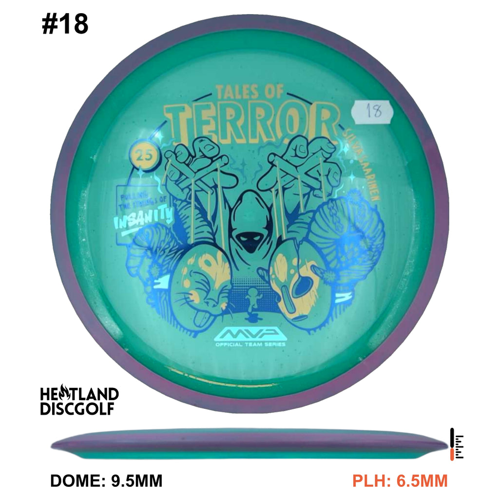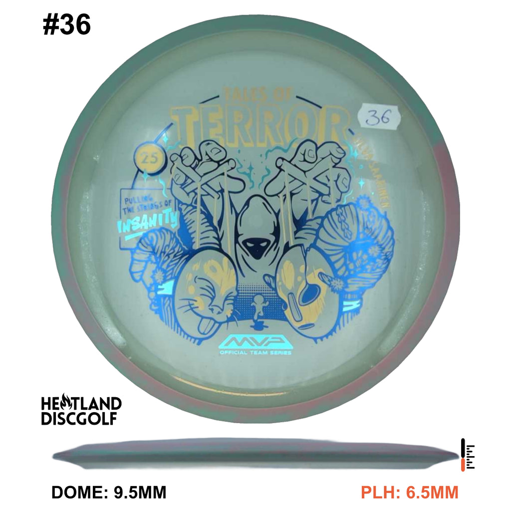 Beware the one pulling the strings during the Finnish Harvest Festival! Stamp newcomer Damian White unveils his first MVP stamp for this Halloween comic inspired design on the Particle Proton Insanity, a warning that some ornaments created for this event are a bit more ghoulish than they appear. The Insanity is a stable-understable driver that players will find easy to manipulate, with average power throws being remarkably straight with forward pushing fade, and higher power throws resulting in precise hyzer-flips, turnovers, and beautiful s-lines. Don’t let the course pull your strings - grab a Particle Proton Insanity today and prove who the true master is.