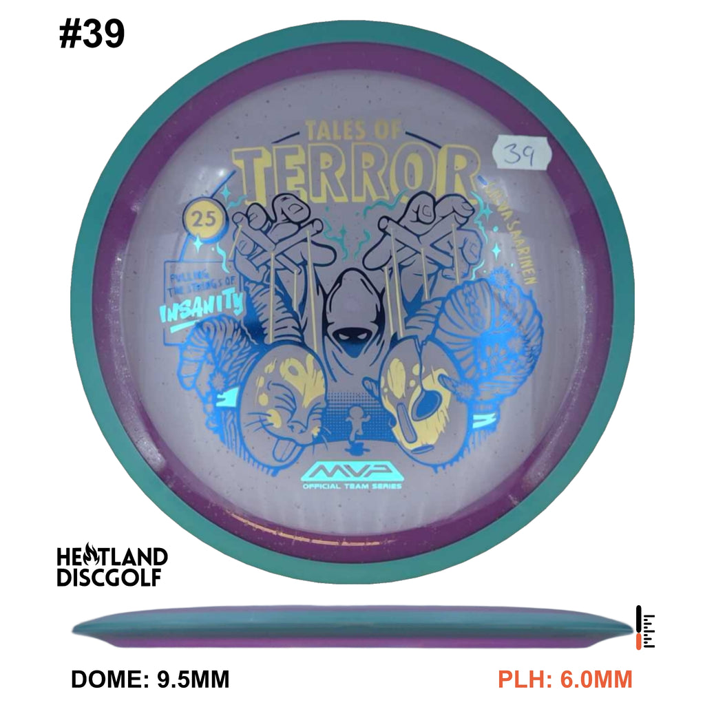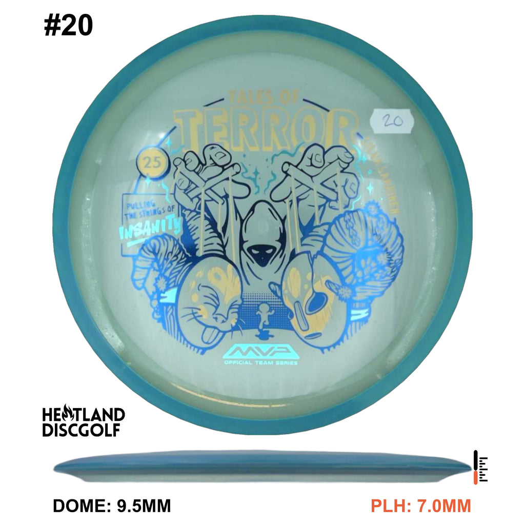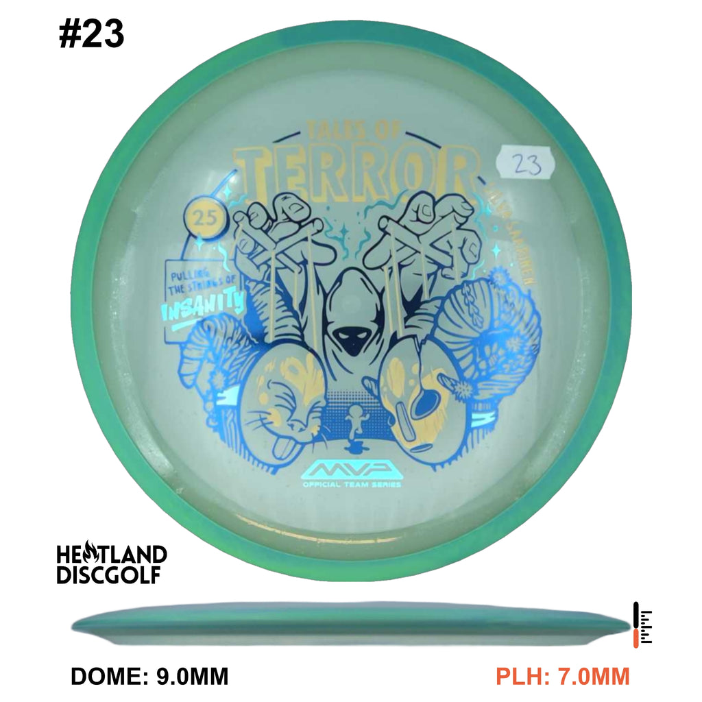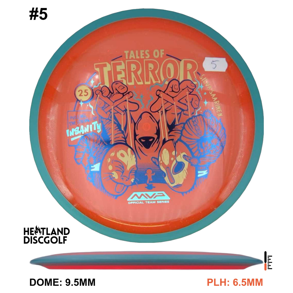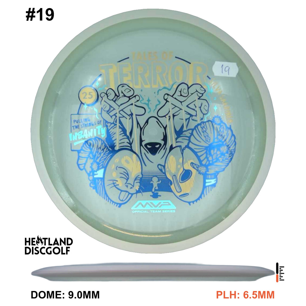 Beware the one pulling the strings during the Finnish Harvest Festival! Stamp newcomer Damian White unveils his first MVP stamp for this Halloween comic inspired design on the Particle Proton Insanity, a warning that some ornaments created for this event are a bit more ghoulish than they appear. The Insanity is a stable-understable driver that players will find easy to manipulate, with average power throws being remarkably straight with forward pushing fade, and higher power throws resulting in precise hyzer-flips, turnovers, and beautiful s-lines. Don’t let the course pull your strings - grab a Particle Proton Insanity today and prove who the true master is.