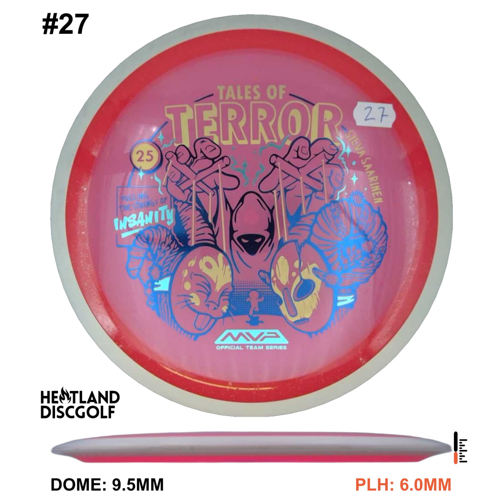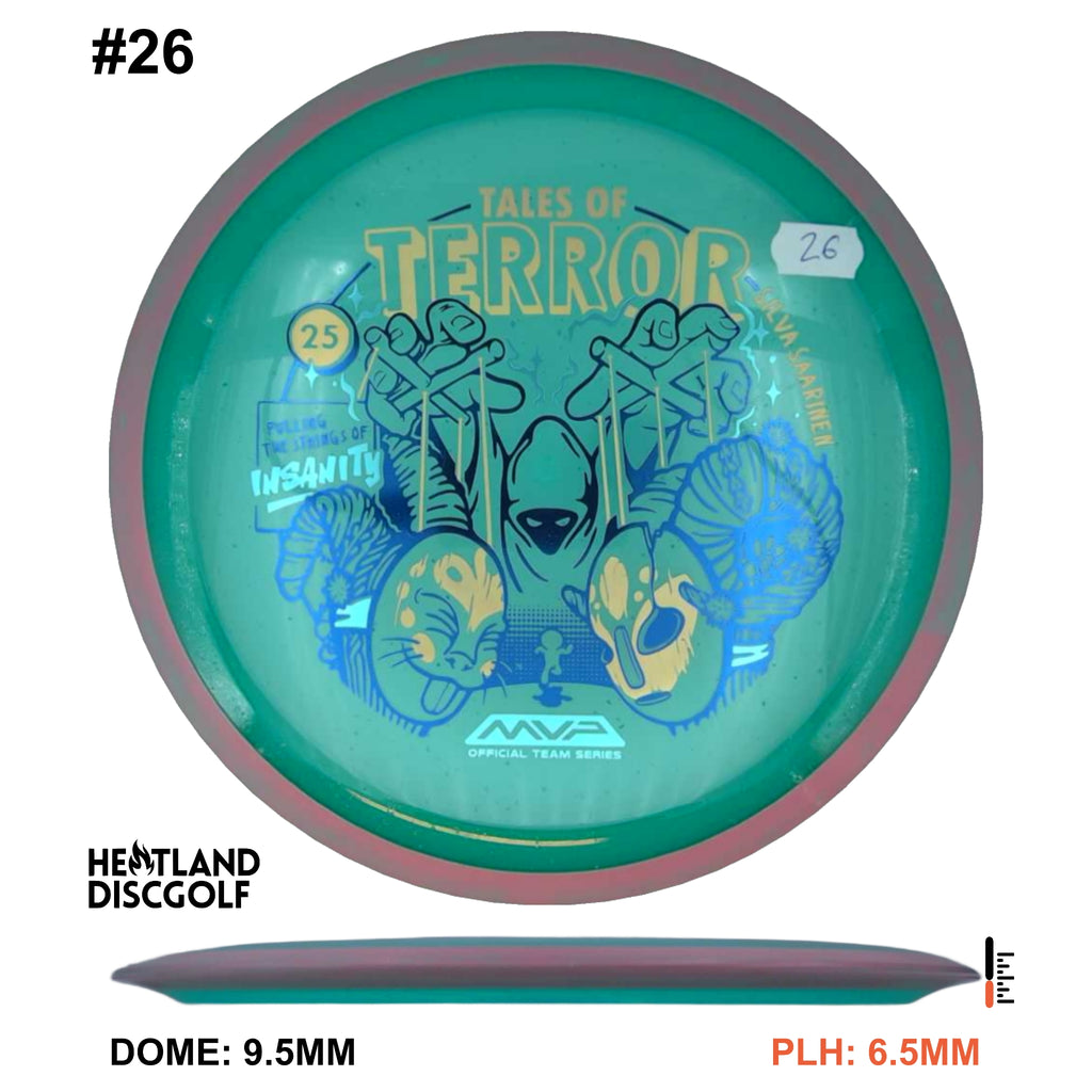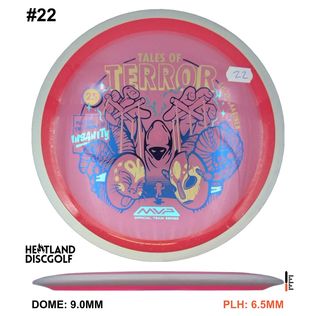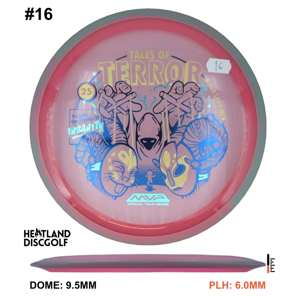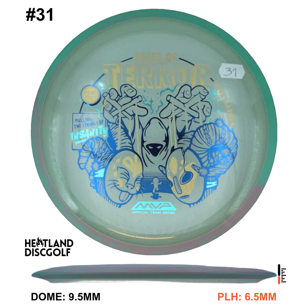 Beware the one pulling the strings during the Finnish Harvest Festival! Stamp newcomer Damian White unveils his first MVP stamp for this Halloween comic inspired design on the Particle Proton Insanity, a warning that some ornaments created for this event are a bit more ghoulish than they appear. The Insanity is a stable-understable driver that players will find easy to manipulate, with average power throws being remarkably straight with forward pushing fade, and higher power throws resulting in precise hyzer-flips, turnovers, and beautiful s-lines. Don’t let the course pull your strings - grab a Particle Proton Insanity today and prove who the true master is.