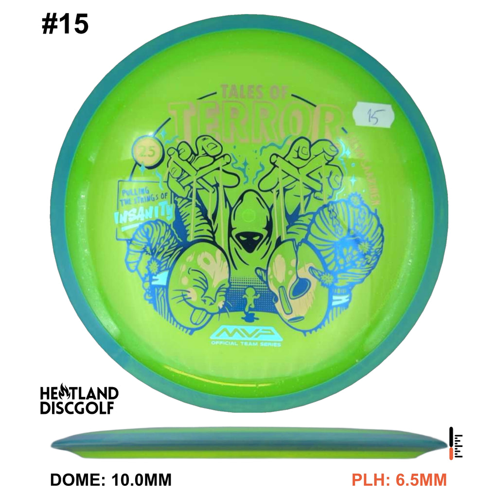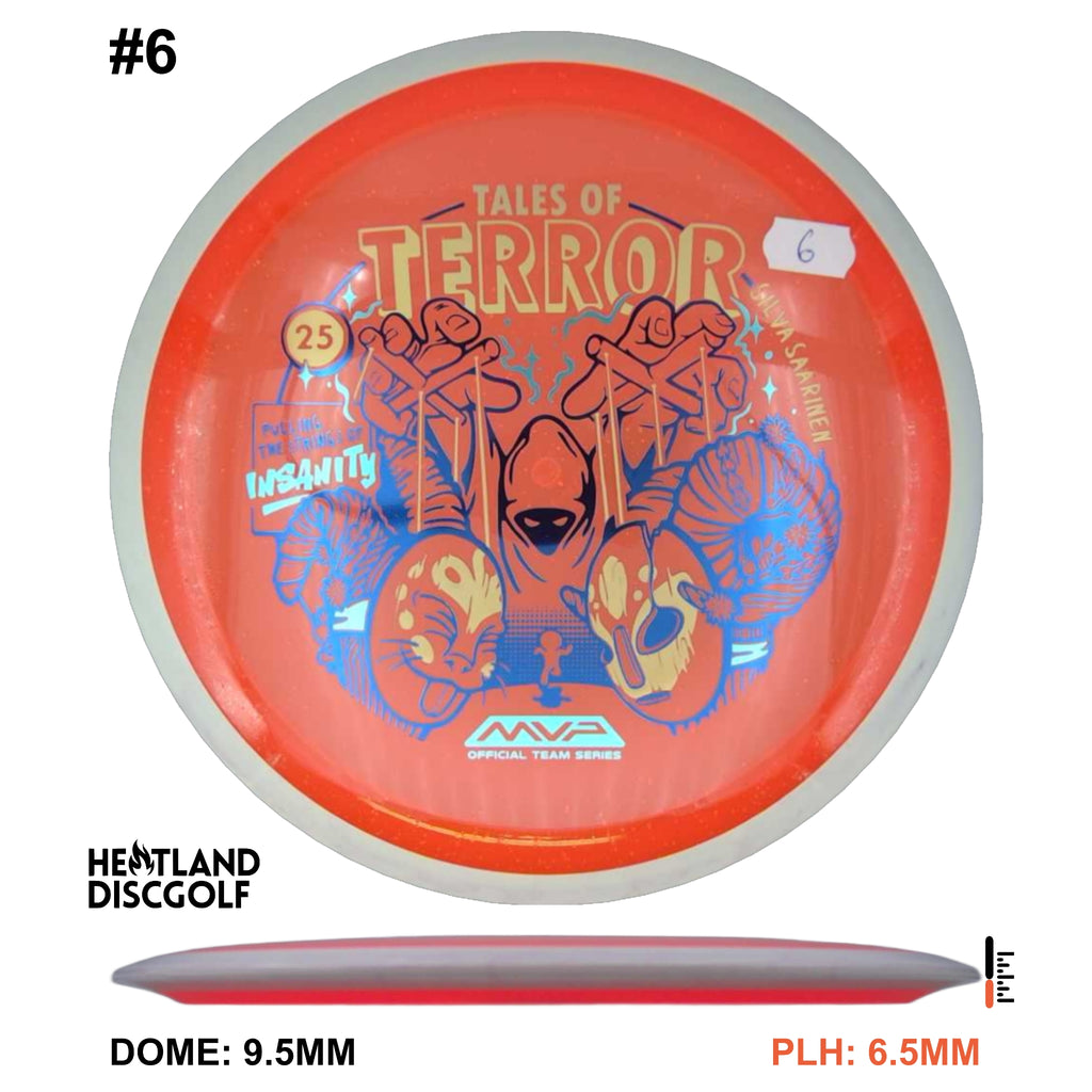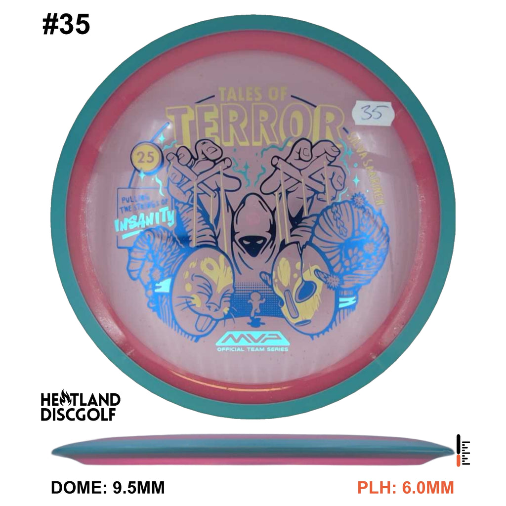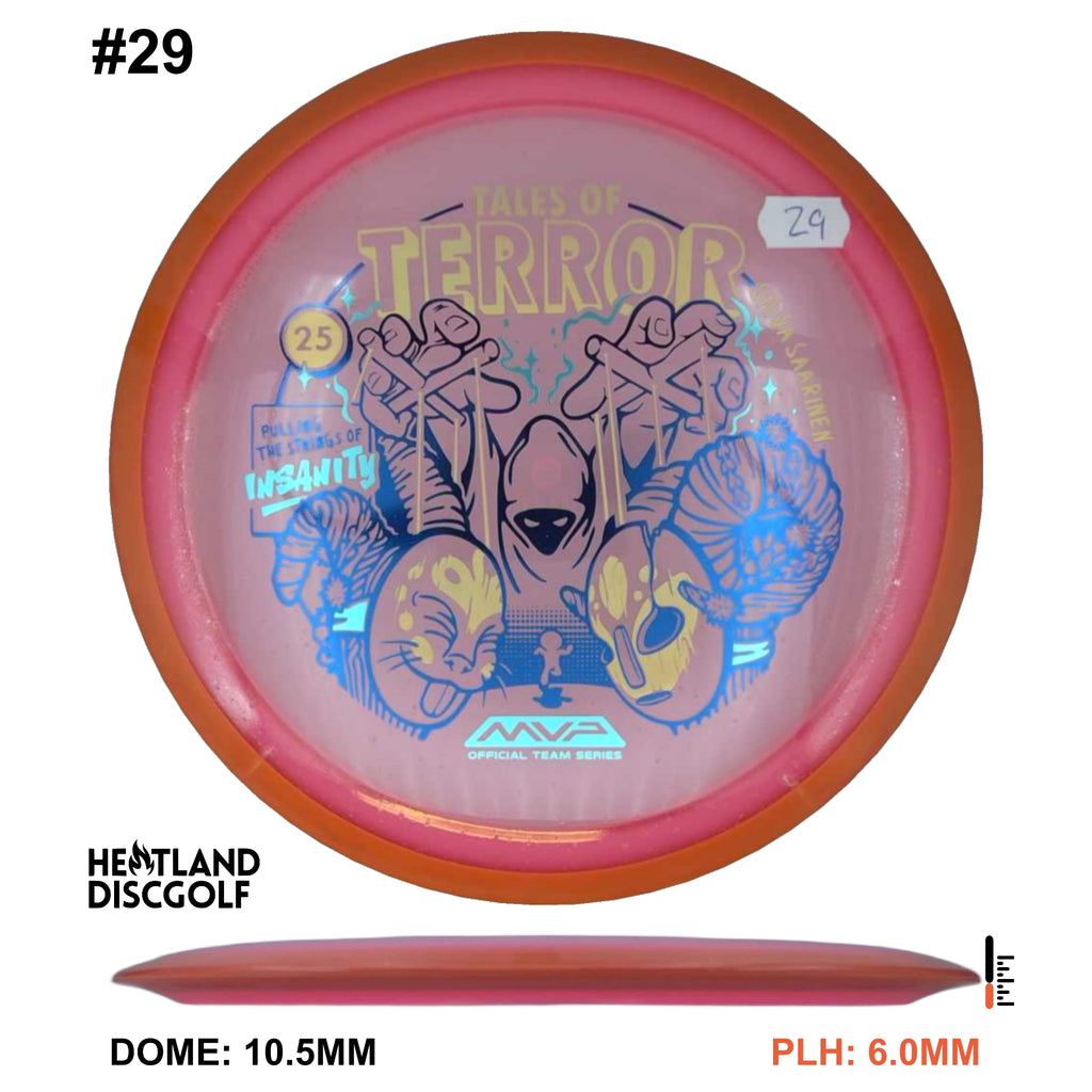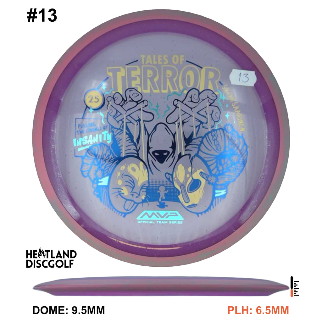 Beware the one pulling the strings during the Finnish Harvest Festival! Stamp newcomer Damian White unveils his first MVP stamp for this Halloween comic inspired design on the Particle Proton Insanity, a warning that some ornaments created for this event are a bit more ghoulish than they appear. The Insanity is a stable-understable driver that players will find easy to manipulate, with average power throws being remarkably straight with forward pushing fade, and higher power throws resulting in precise hyzer-flips, turnovers, and beautiful s-lines. Don’t let the course pull your strings - grab a Particle Proton Insanity today and prove who the true master is.