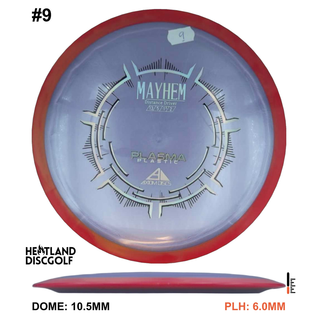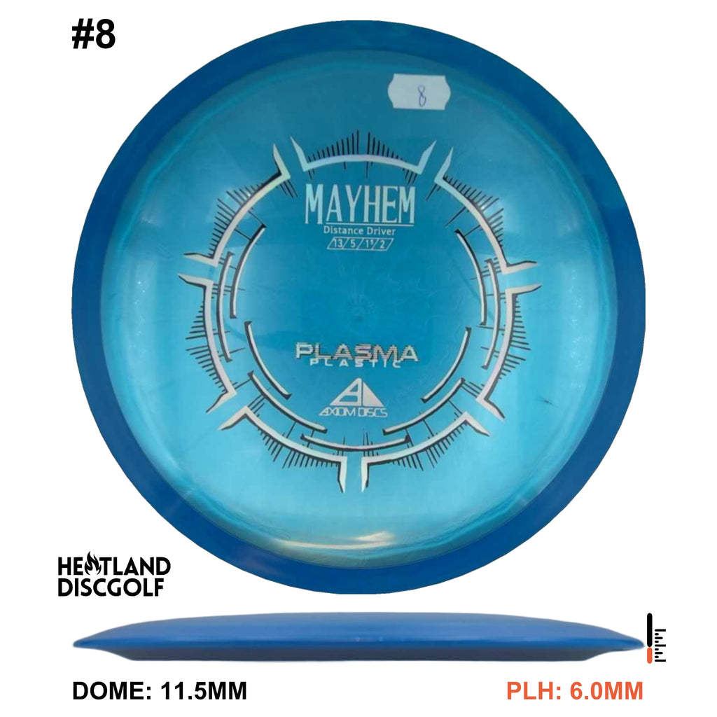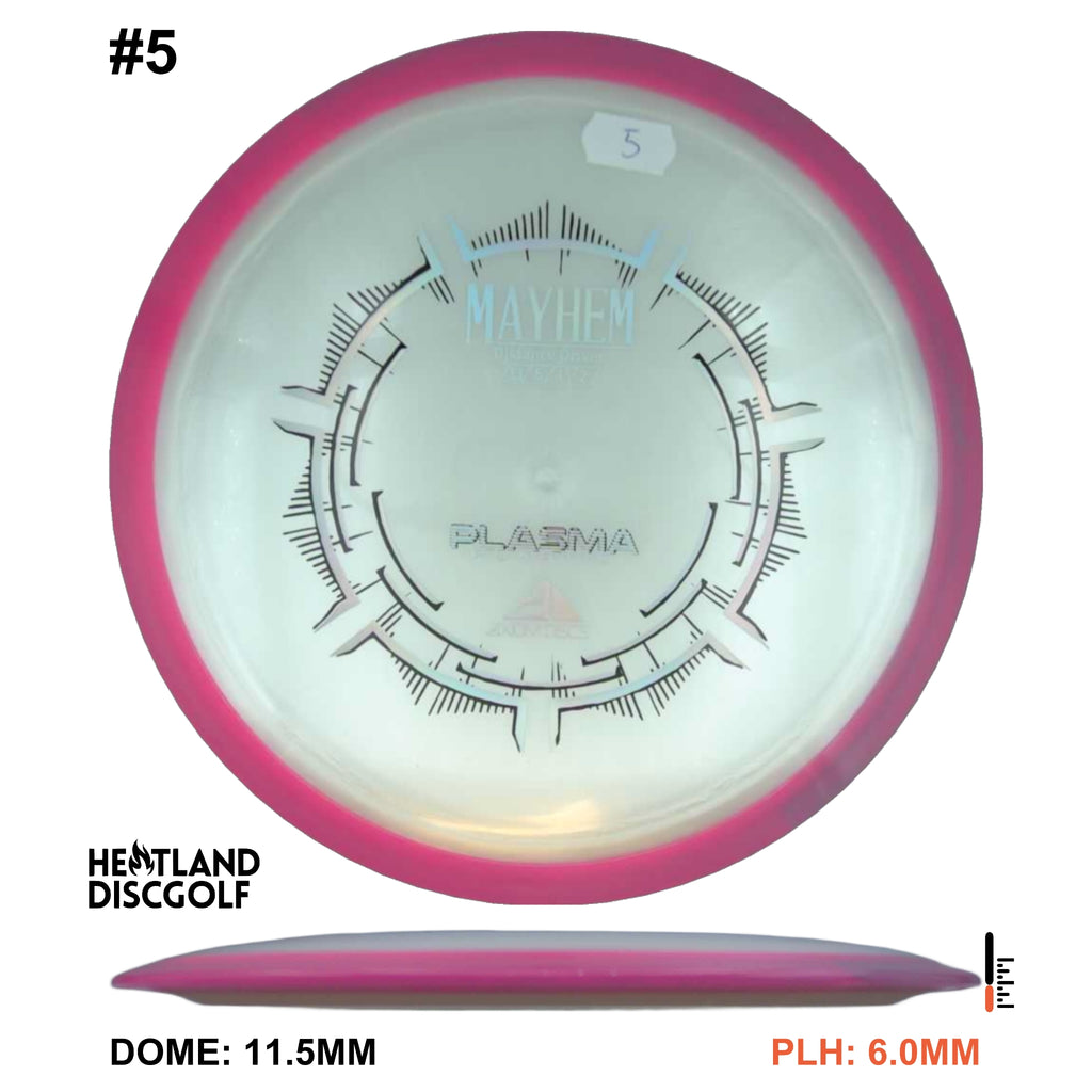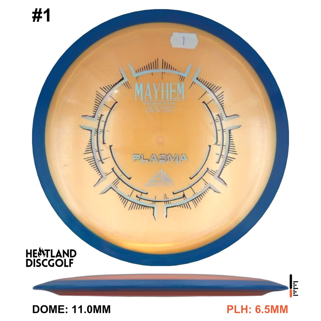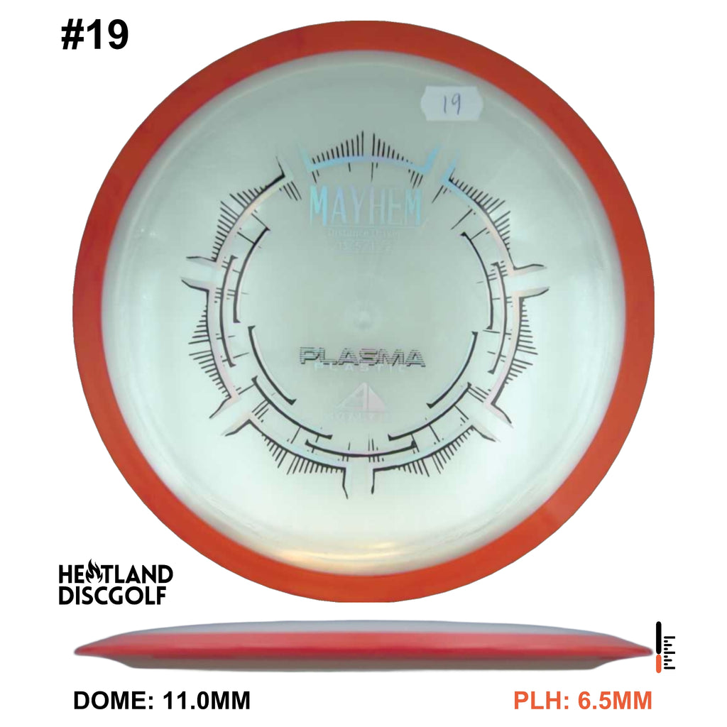 Mayhem has a responsive straight-stable profile and plenty of speed, making it a perfect workhorse driver for many advanced and expert throwers. Like the MVP 23mm class, the Mayhem has a pronounced dome to promote distance-covering glide. Mayhem is best compared to a beat MVP Octane.