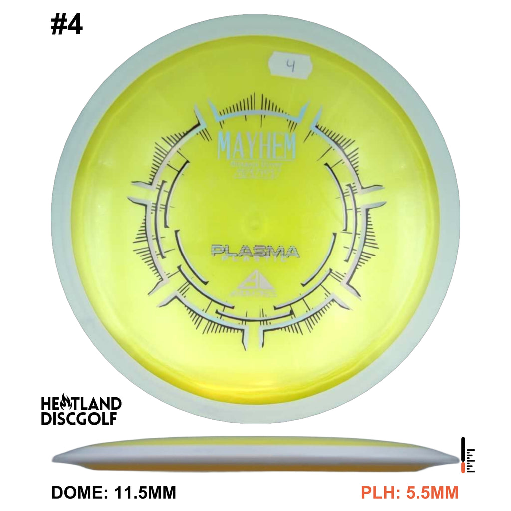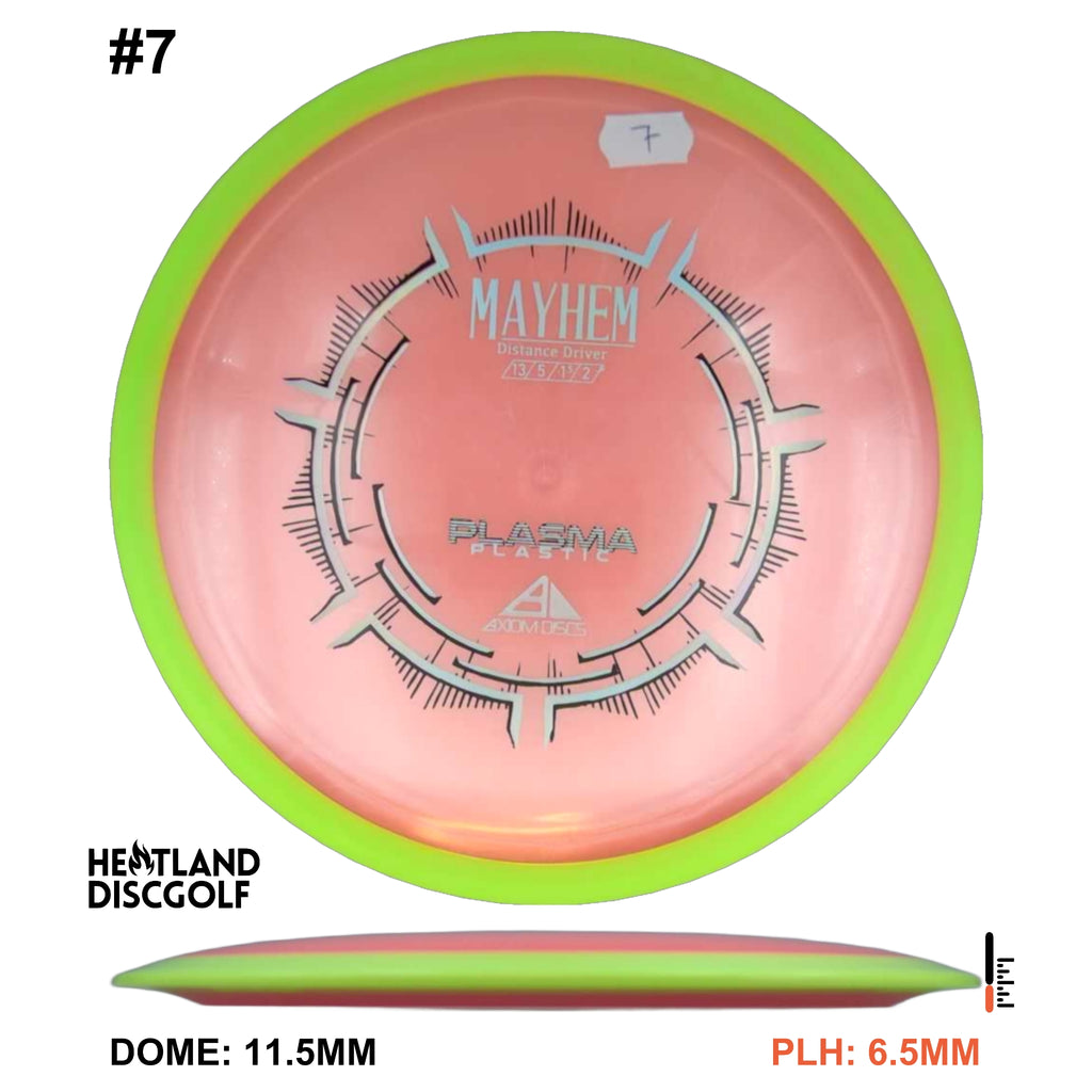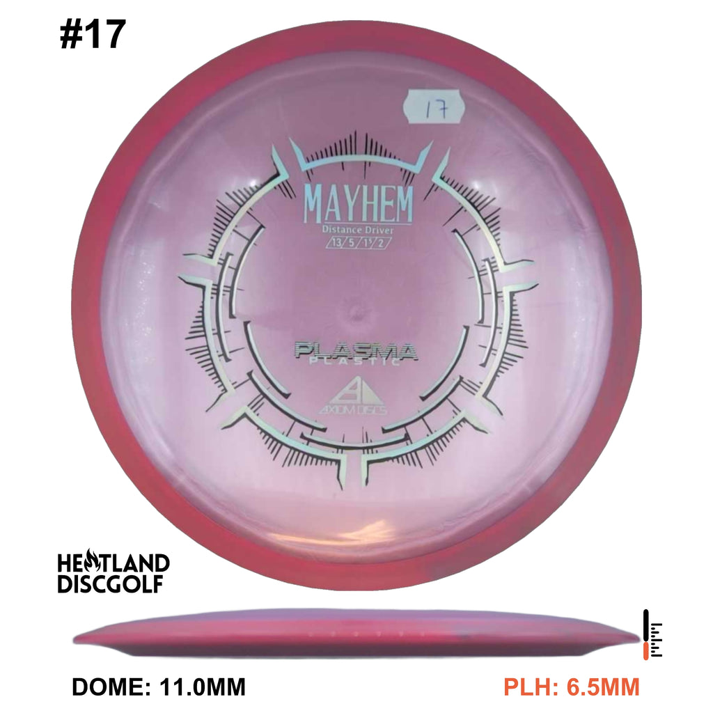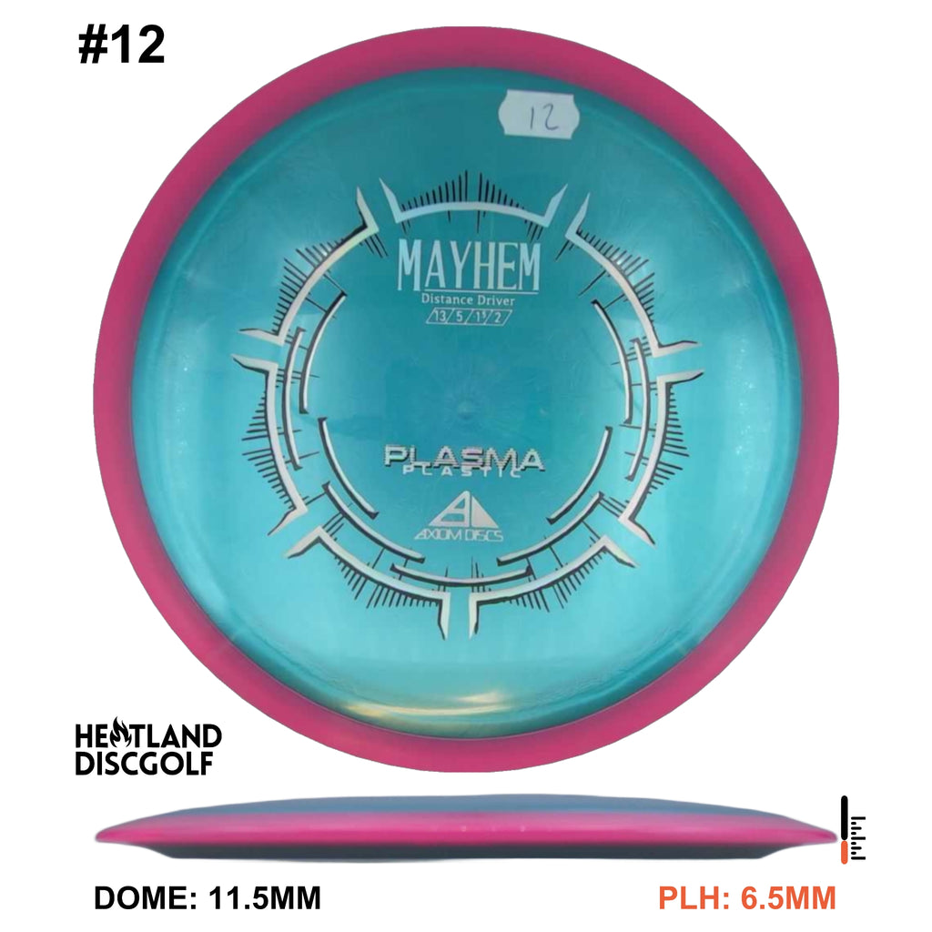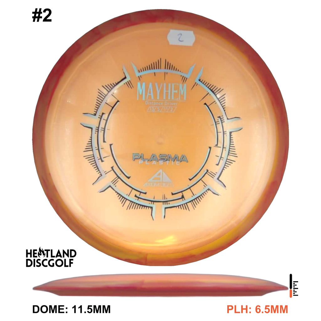 Mayhem has a responsive straight-stable profile and plenty of speed, making it a perfect workhorse driver for many advanced and expert throwers. Like the MVP 23mm class, the Mayhem has a pronounced dome to promote distance-covering glide. Mayhem is best compared to a beat MVP Octane.