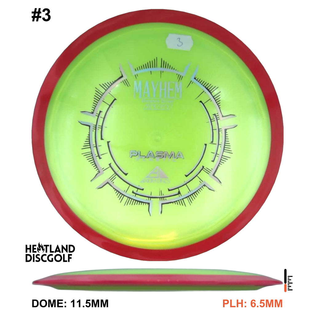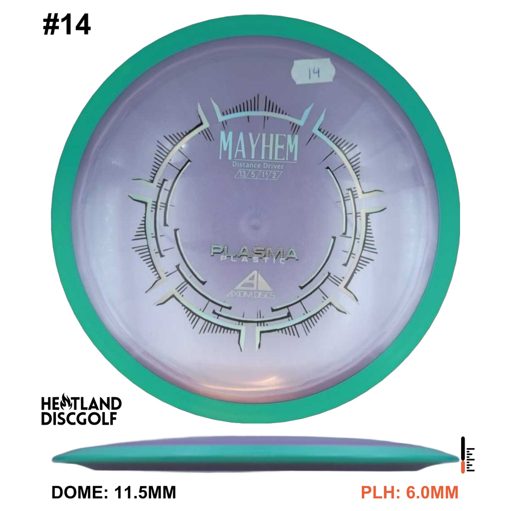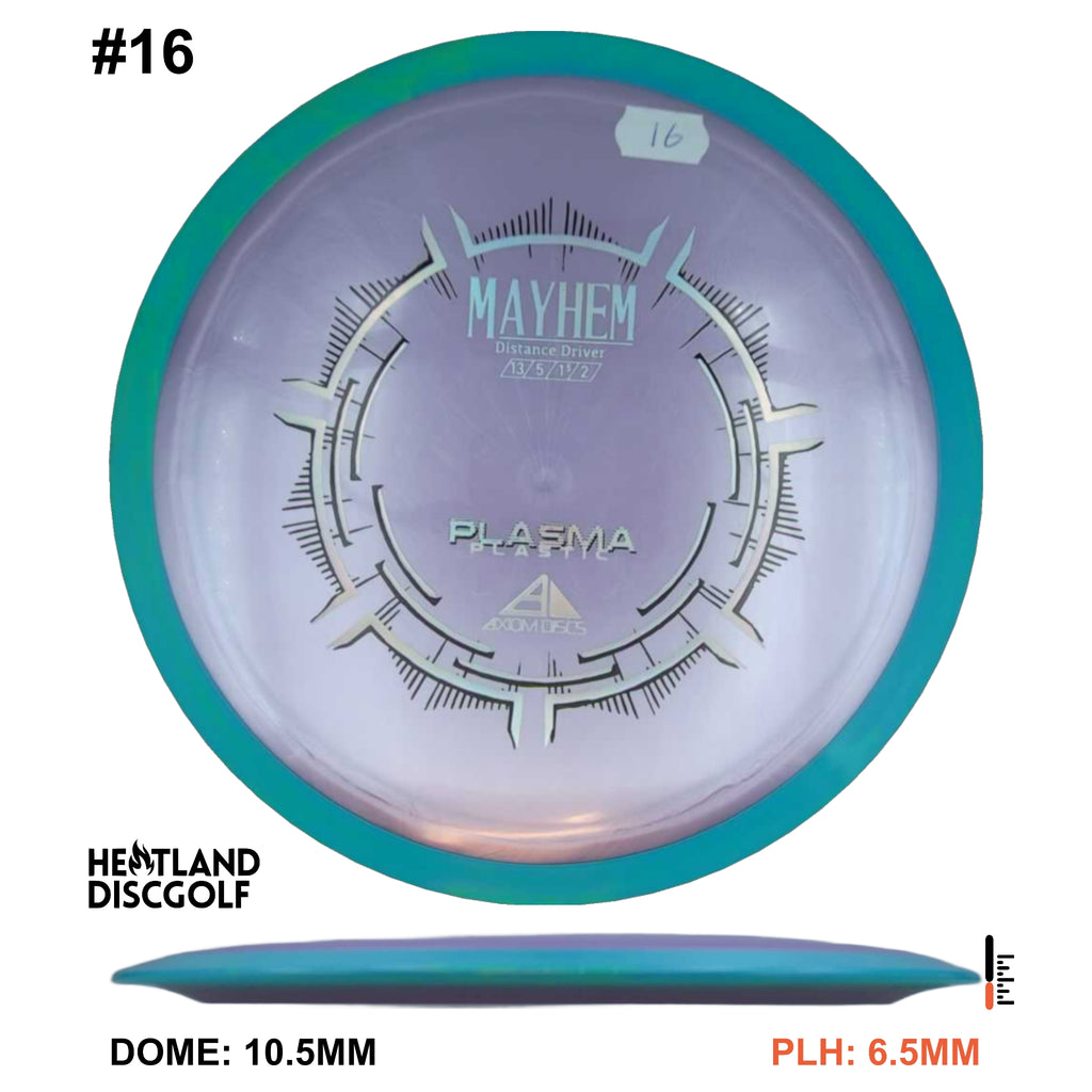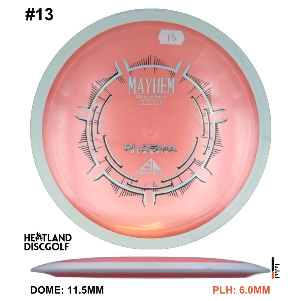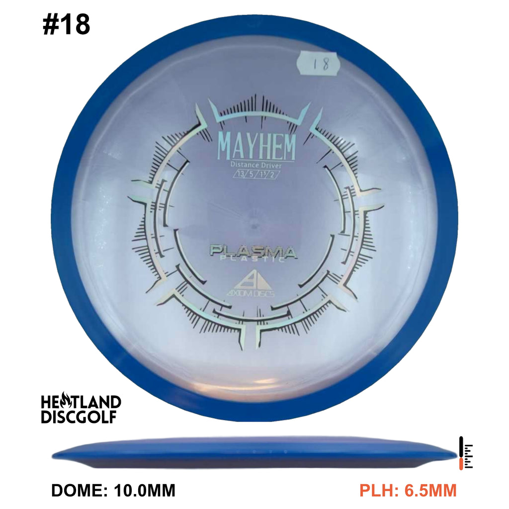 Mayhem has a responsive straight-stable profile and plenty of speed, making it a perfect workhorse driver for many advanced and expert throwers. Like the MVP 23mm class, the Mayhem has a pronounced dome to promote distance-covering glide. Mayhem is best compared to a beat MVP Octane.